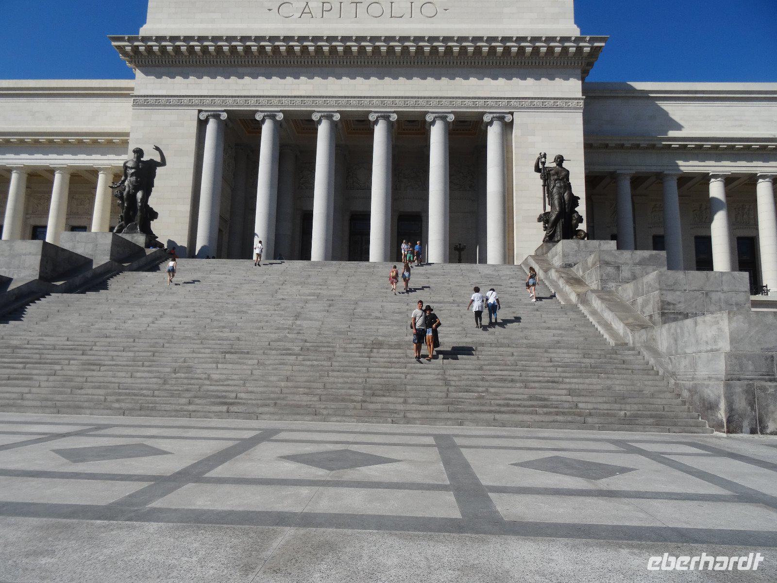 Wir fahren zum Friedhof "Cristobal Colon" und betrachten die eindrucksvollen Marmorstatuen, welche die Gräber zieren. Seit 1868 ist er in Betrieb und umfasst 0,6 km². Beeindruckend ist das Denkmal für die Feurwehrleute, welche bei einem Brand durch eine Explosion ums Leben kamen und natürlich lassen wir auch die "Milagrosa" nicht aus. Sie soll ja Wünsche erfüllen können und vor allem ein Herz für unerfüllte Kinderwünsche haben. Wir wenden uns irdischeren Dingen zu und fahren über den Platz der Revolution mit den Regierungsgebäuden Richtung Alt-Havanna. Nun geht es zu Fuß weiter durch die Altstadt. Auf der Plaza Vieja kehren wir im El Escorial ein und trinken Kaffee, dann folgt der Besuch des Palastes des Gouverneurs mit dem Straßenbelag aus Holzpflaster. Wir treffen auch wieder Christoph Kolumbus und Carlos Manuel de Cespedes bzw. ihre Denkmale. Die Kathedrale erinnert sehr an ihre spanischen Vorbilder, aber innen ist sie deutlich schlichter. In der nahegelegenen Bodeguita del Medio trinken wir wie Hemingway seinerzeit einen Mojito. Schon etwas pflastermüde kehren wir im Restaurant Moneta Cubana ein und essen auf der Dachterrasse Mittag. Danach folgt die ersehnte Oldtimerfahrt zum Aussichtspunkt zu Füßen der Christusstatue von Havanna und danach durch den Stadtteil Miramar, entlang der 5. Avenida mit ihren wunderschönen Palmen und dem Park mit den Gummibäumen von beträchtlichem Ausmaß.