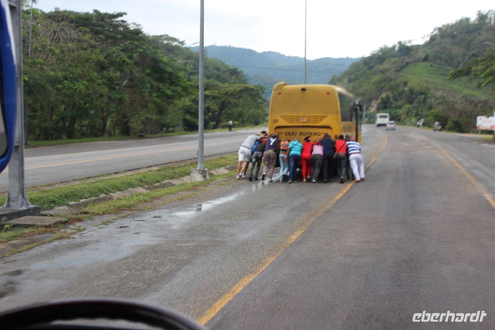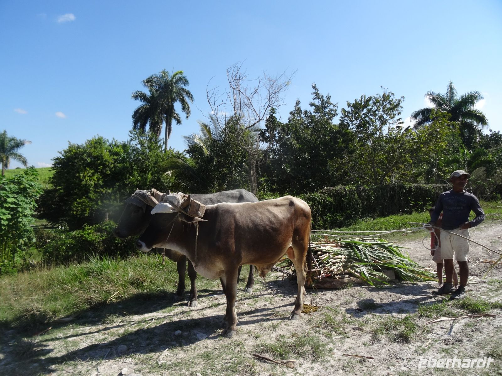 Bei strahlendem Sonnenschein machen wir uns auf den Weg in Richtung Santiago de Cuba. Die Straße ist nicht besonders gut, aber unser Fahrer Jara umfährt geschickt die schlimmsten Schlaglöcher. Für genügend Waser hat er auch gesorgt, also gute Voraussetzungen für eine erfolgreiche Reise. Unterwegs halten wir auch mal kurz an einem Zuckerrohrfeld, um ein Gefühl für eine der wichtigsten Kulturen Kubas zu bekommen.
