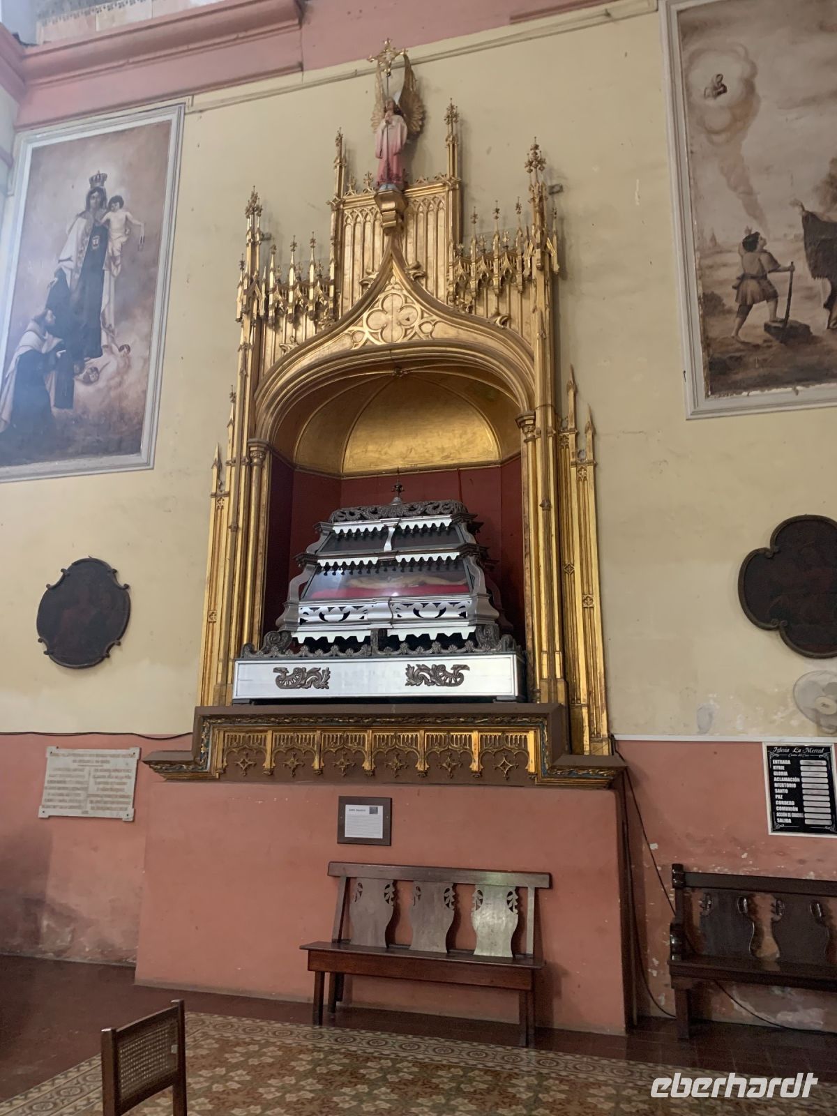 Das erste Ziel an diesem Tag ist die Wallfahrtskirche El Cobre. Hier wird die Jungfrau von El Cobre verehrt, seit 1916 ist sie die Nationalheilige Kubas und die meisten Kubaner waren mindestens einmal in ihrer Kirche, sie um etwas zu bitten oder zu danken. Zahlreiche Devotionalien zeugen von erfüllten Wünschen. Selbst Hemingway hinterlegte hier die Medaille seines Nobelpreises. Der Ort verdankt seine Entstehung und seinen Namen einer Kupfermine, die hier ausgebeutet wurde sie war jedoch Ende des 19. Jahrhunderts erschöpft und wurde aufgegeben. Wir erweisen der Jungfrau die ihr gebührende Ehre und fahren weiter durch Mittelkuba bis in die Stadt Bayamo, Stadt der Kutschen genannt. Hier fahren nicht nur viele Kutschen, sondern es werden auch welche hergestellt. Wir laufen ein wenig durch die Stadt, am Zentralplatz steht das Denkmal für den Dichter der Nationalhymne, Perucho Figueredo. 1868 wurde sie zum ersten Mal öffentlich gesungen. Auch ein Denkmal für Carlos Manuel de Cespedes, genannt Vater des Vaterlandes, sehen wir. Er hatte mit der Freilassung seiner Sklaven ein Signal gegeben für die Unabhängigkeitskämpfe gegen die Spanier. Weiter fahren wir in Richtung Las Tunas, an der Raststätte gibt es nichts zu trinken, es dauert eine Weile, bis wir etwas finden. Um so mehr freut es uns, das es im Restaurant "1800" in Camagüey ein gutes Abendessen gibt. Mehr sehen wir an diesem Abend von der Stadt nicht, wir checken zufrieden im Hotel E Santa Maria ein.