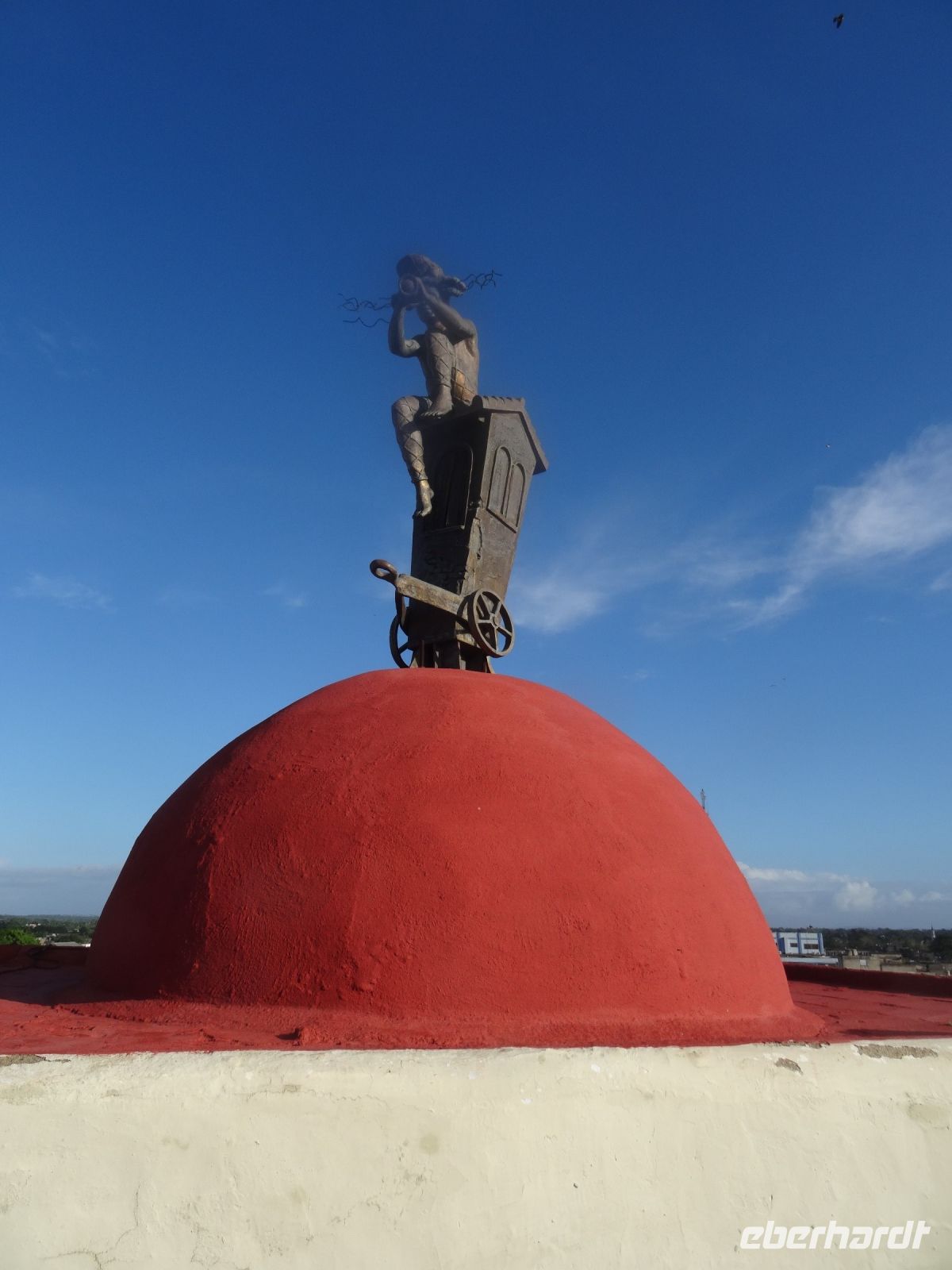 Gut ausgeruht widmen wir uns zunächst der Stadt Camagüey. Wir fahren mit dem Fahrradtaxi durch die verwinkelte Altstadt. Im Gegensatz zu den streng rechtwinkligen Grundrissen der meisten anderen kubanischen Städte weist Camagüey ein unübersichtliches Straßensystem auf. Man sagt, es sei geschaffen worden, um eindringende Piraten zu verwirren und besser bekämpfen zu können. Wir fahren zunächst zum ältesten Platz der Stadt, San Juan de Dios und dann zum lustigsten, dem Platz Carmen. Hier stehen lebensgroße Figuren der Künstlerin Marta Jimenez, die Alltagsszenen darstellen, auch wir nutzen sie als willkommenes Fotomotiv. Natürlich darf eine Besichtigung des Parks Ignacio Agramonte nicht fehlen. Dem berühmten Sohn der Stadt und Freiheitskämpfer wurde ein Reiterdenkmal inmitten des Platzes errichtet.