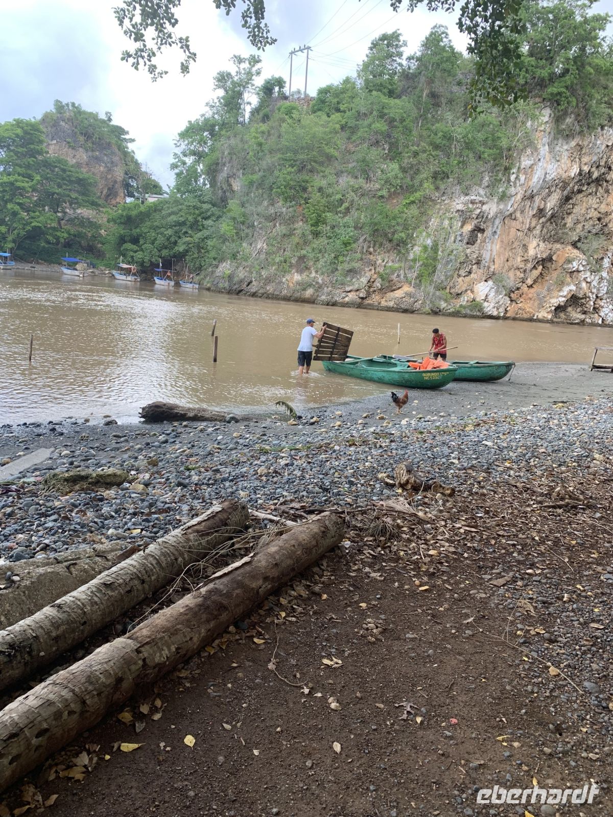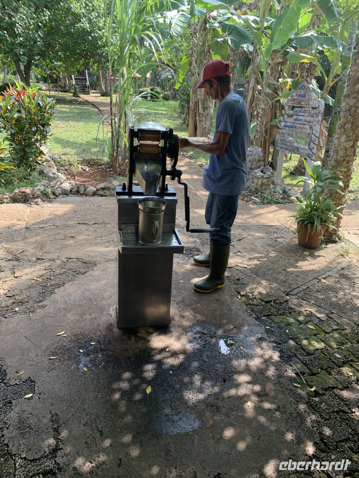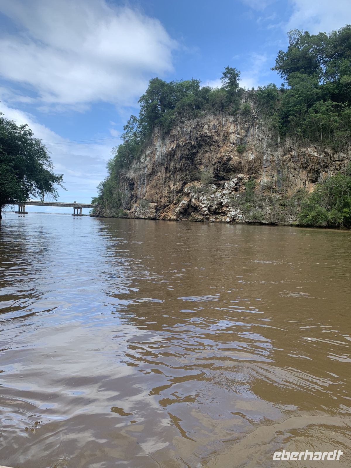 Leider weint der Himmel noch immer, aber nach dem Frühstück ist es nur noch ein leichtes Nieseln und so machen wir uns frohgemut auf den Weg zum Yumuri-Fluss. Der Fluss hat sich in die Felsen eingegraben und eigenartige Felsformationen geschaffen. Wir passieren den "paso de los Alemanes", ein Felstor, in dessen Nähe früher eine deutsche Familie wohnte. Diese verlangte einen Wegezoll von den Reisenden. Wir kommen kostenfrei hindurch und besteigen am Flussufer zwei Boote. Noch einmal sehen wir die bizarr geformten Felsen, diesmal vom Boot aus. An einer Insel steigen wir aus und bummeln Steine suchend am Flussufer entlang. Dann bringt uns das Boot wieder zurück und nach einer Erfrischung mit Kokosmilch und Fruchtfleisch fahren wir weiter zur Finca Duabe. Hier erfahren wir bei einem Rundgang sehr viel Wissenswertes über den Anbau von Kakao und können am Ende des Rundgangs auch einen guten Kakao trinken.