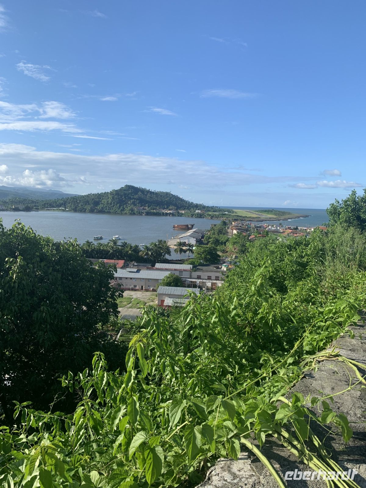 Ausgestattet mit reichlich Fakten zu tropischen Nutzpflanzen fahren wir in das Stadtzentrum von Baracoa und laufen hinauf zum Hotel "El Castillo". Von hier haben wir eine sehr gute Aussicht - die Stadt liegt uns zu Füßen und auch der Hausberg El Yunque ist gut sichtbar. "Ich habe keinen schöneren Ort gesehen" soll Kolumbus bei der Landung am 27.11.1492 gesagt haben. Und so gründete Diego Velazques hier 1511 die erste Stadt Kubas. Aber da sie schwer erreichbar war, nur per Schiff oder mühsam auf einem Gebirgspfad mit Maultieren, verlor sie die Haupstadtfunktion rasch an Santiago de Cuba.