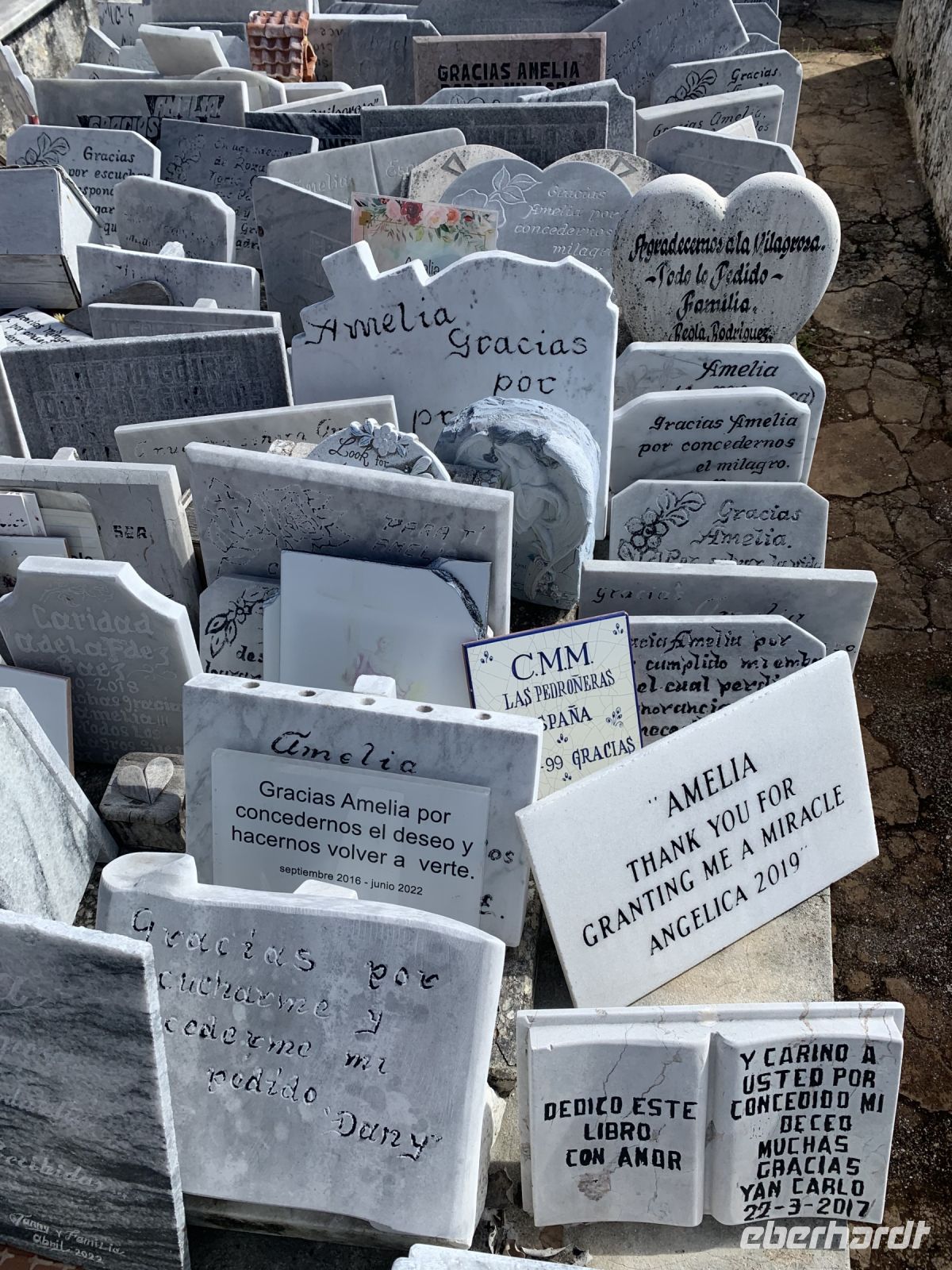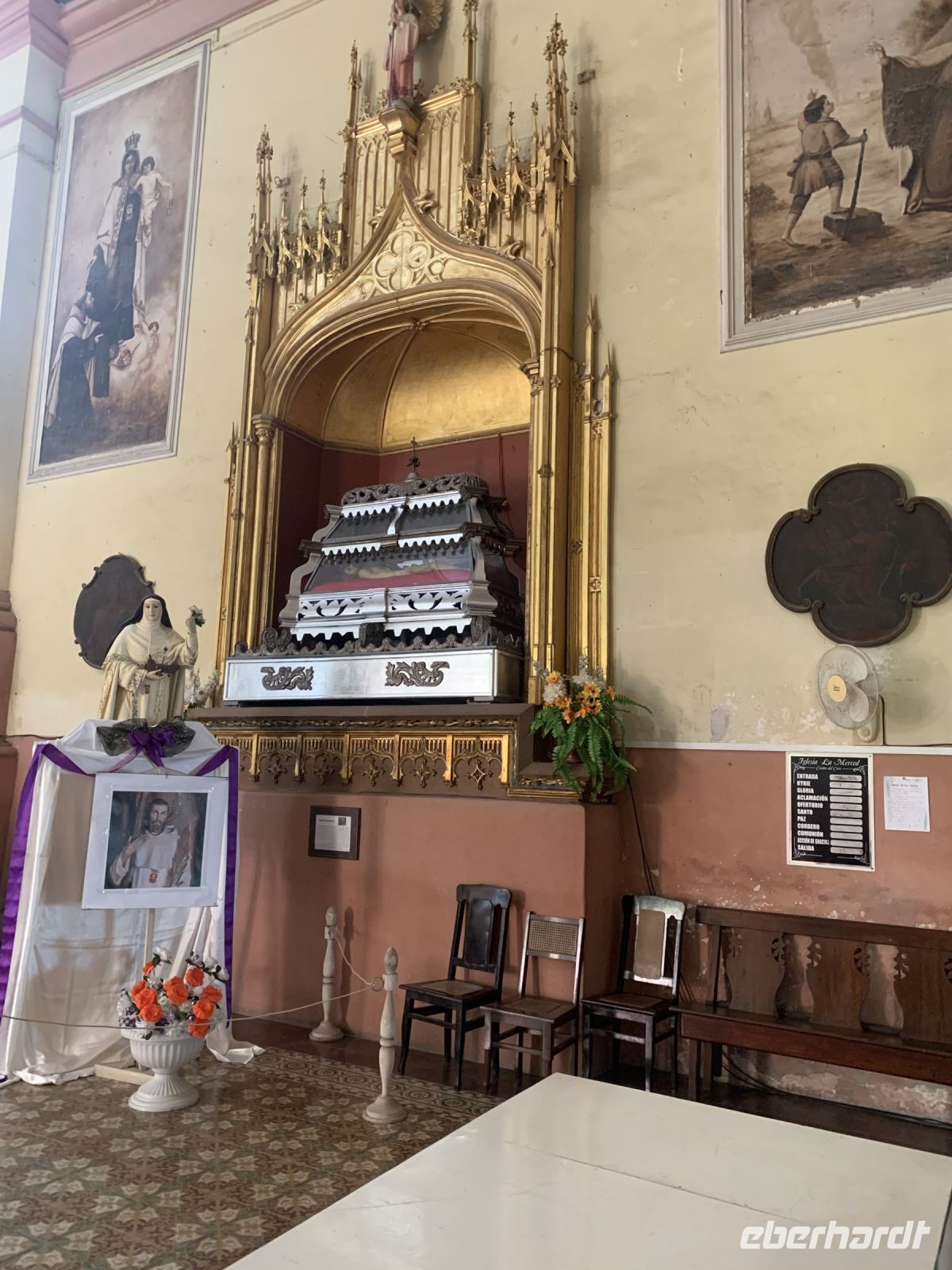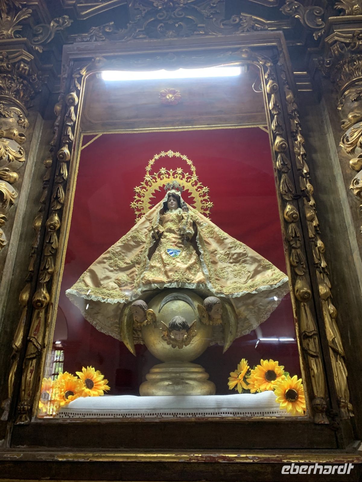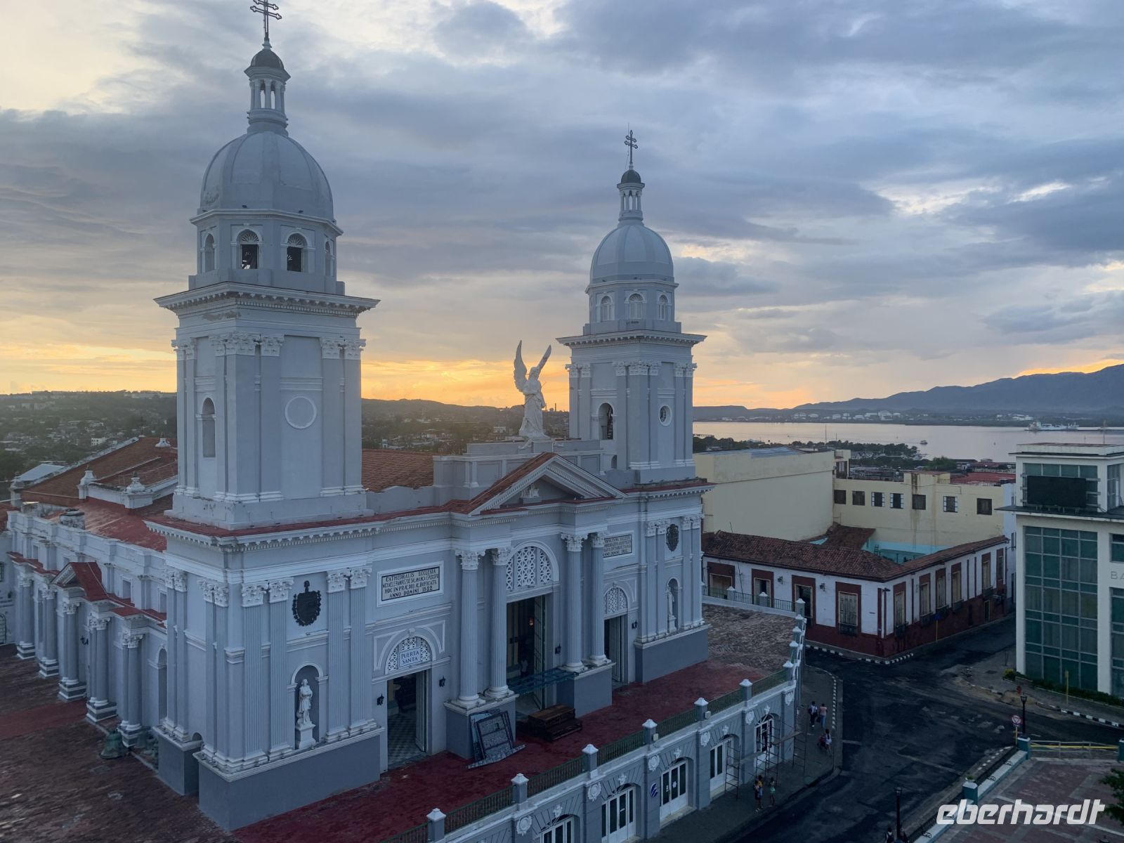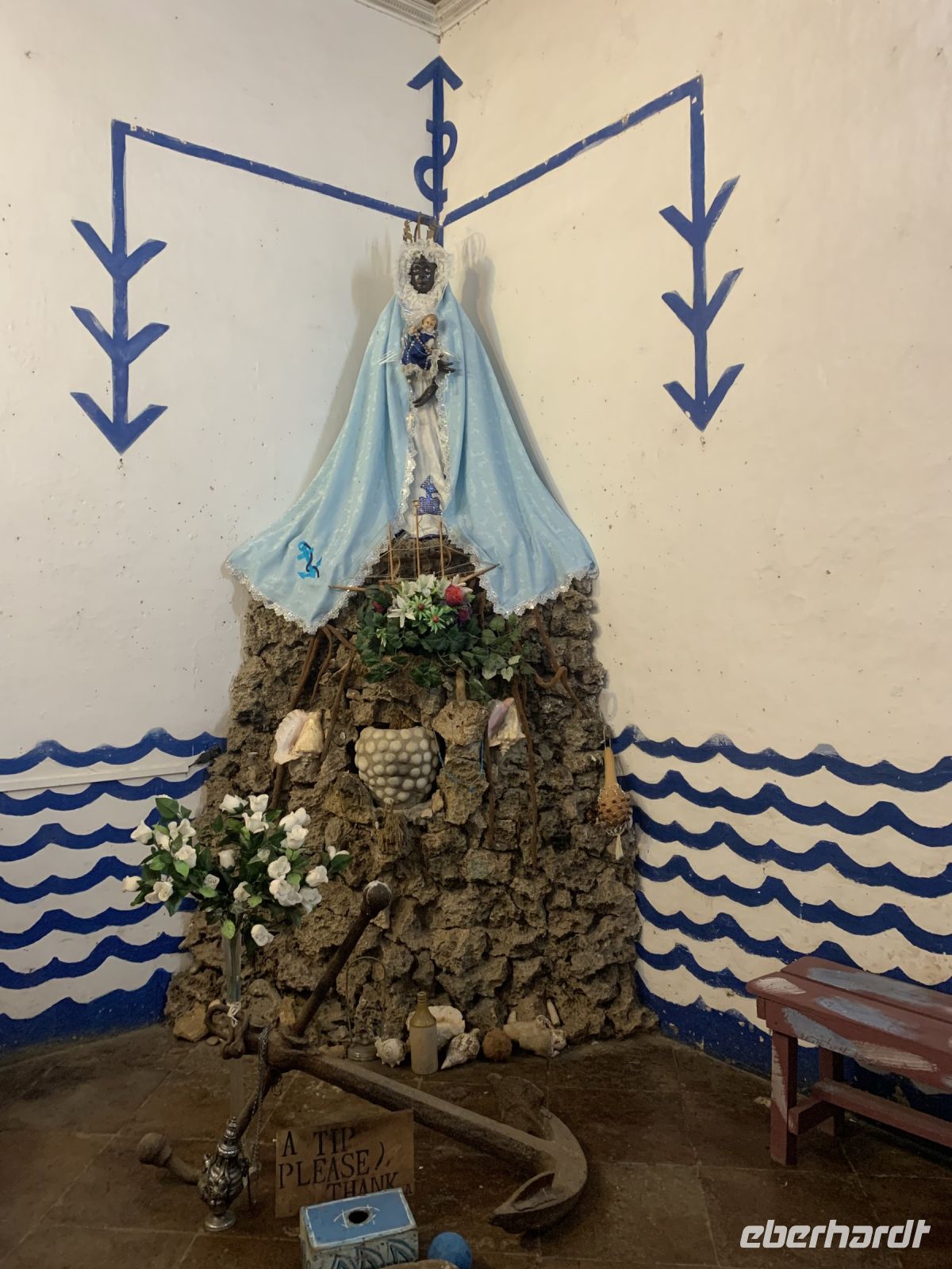 Die nächste Einkehr haben wir in der Wallfahrtskirche El Cobre mit der Nationalheiligen, der Jungfrau von El Cobre. Die kleine Heilige in ihrem gelben Umhang scheint sehr wundertätig zu sein, denn ihr werden zahlreiche Devotionalien dargebracht um sich für erfüllte Wünsche zu bedanken und sie freundlich zu stimmen. Ernest Hemingway widmete ihr seine Nobelpreisplakette, Fidels Mutter hinterlege Basebälle.