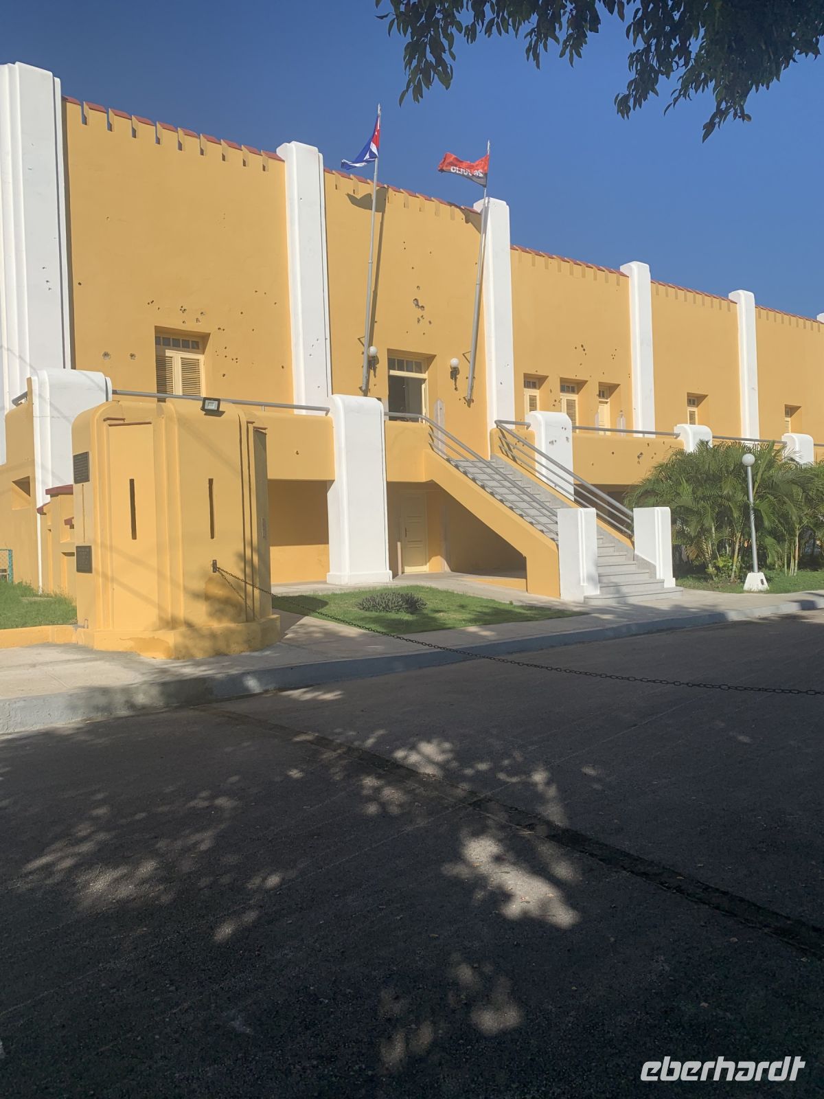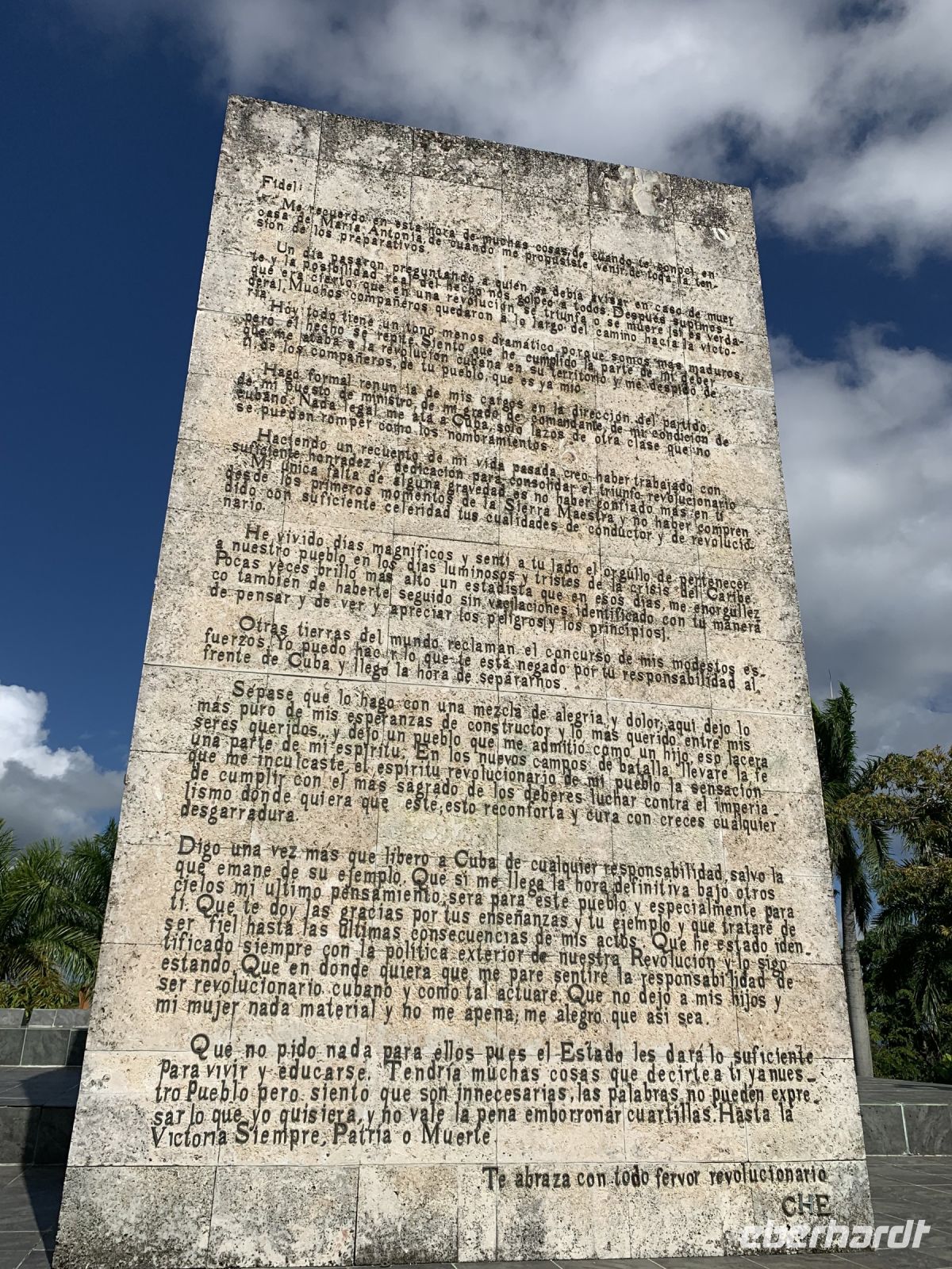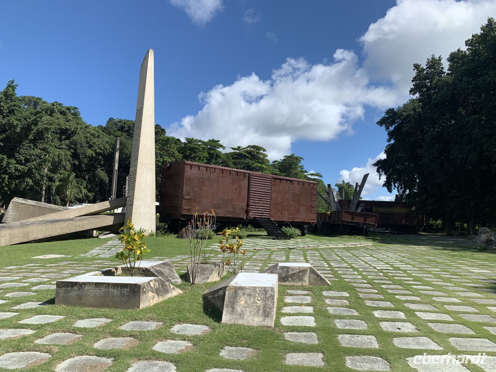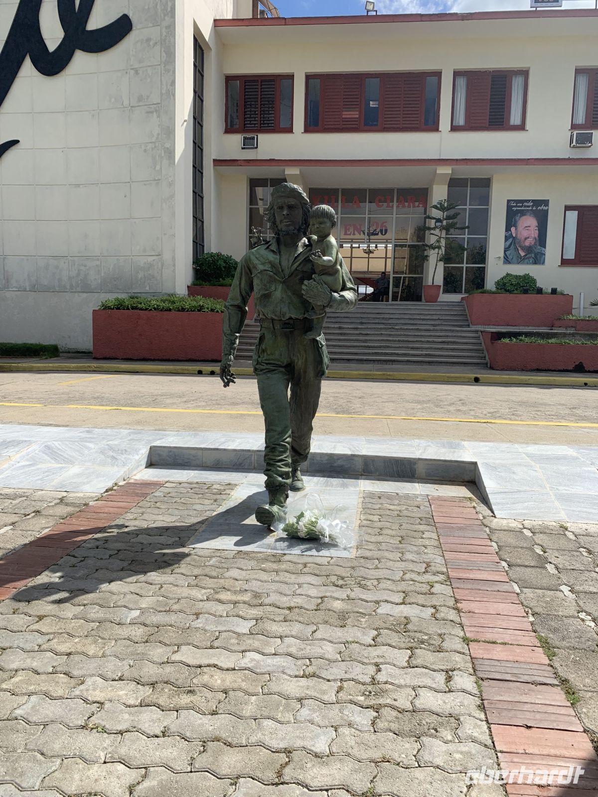 Um den Eindruck von Cienfuegos abzurunden, fahren wir mit dem Boot in die Bucht hinaus und sehen nun die Stadt vom Wasser aus, eine neue Perspektive, die uns gut gefällt und auch nicht anstrengt. Nach einer guten Stunde ist die Fahrt jedoch vorüber und wir fahren mit dem Bus nach Santa Clara. Die Stadt besitzt eine der größten Universitäten Kubas und ist ein Wirtschaftszentrum. Uns führt der Weg natürlich zuerst zum Mausoleum Che Guevaras und seiner Kampfgefährten. Das überlebensgroße Standbild des Revolutionärs ist sehr ausdrucksstark, ebenso die Stele mit dem Text des Briefes von Che an Fidel. Wir betrachten noch ein weiteres Standbild Che Guevaras, mit einem Kind auf dem Arm steht er da und sieht damit weniger heroisch, sondern eher väterlich aus. Mit dem "tren blindado" dem Panzerzug, der von Che Guevara erobert wurde, rundet sich das Bild über die Ereignisse 1958 ab.