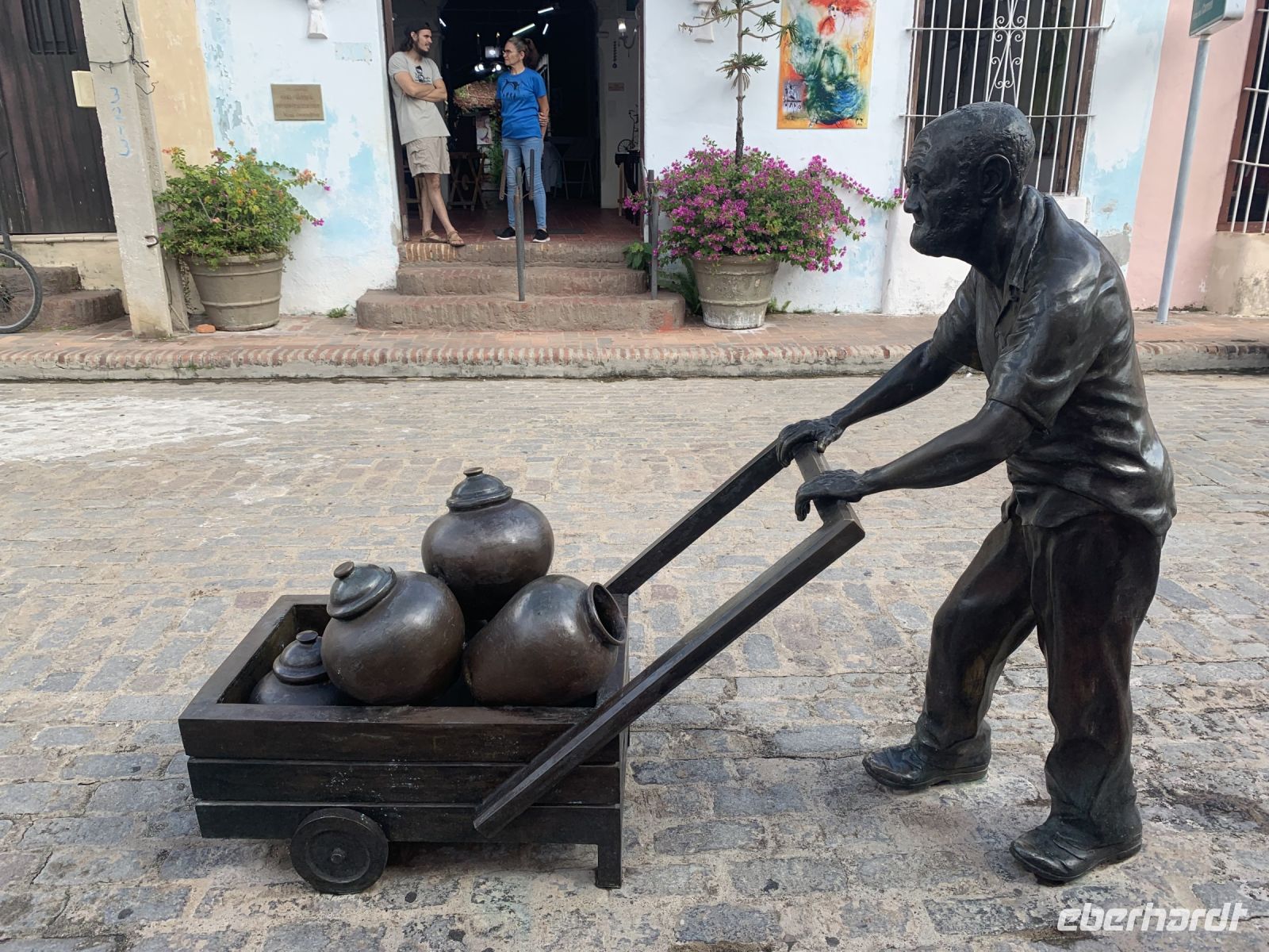 Wir sehen am Platz der Arbeiter die Stadtkirche Nuestra Senora de la Merced mit ihrem berühmten Heiligen Grab ganz aus Silber. Auch die älteste Kirche der Stadt, die Iglesia de Nuestra Senora de la Soledad, besuchen wir und bewundern die Fresken aus dem 18. Jahrhundert. Der Platz San Juan de Dios ist uns schon vom Abendessen bekannt, nun sehen wir bei Tageslicht das frühere Hospital und das Gotteshaus. Am Schluss besuchen wir einen der berühmtesten Plätze. Es ist der Carmen Platz mit der gleichnamigen Kirche. Das Bemerkenswerte sind die lebensgroßen Figuren, welche den Platz bevölkern. Geschaffen von der Künstlerin Martha Jimenez nach lebenden Vorbildern aus der Stadt, zeigen sie Alltagsszenen, wie z. B. die schwatzenden Frauen mit ihren Kaffeetassen in der Hand, den Zeitungsleser oder den Wasserträger. Die Barockfassade der Kirche Nuestra Senora del Carmen bildet einen passenden Hintergrund für die Versammlung von Einwohnern aus Camagüey in Bronze.