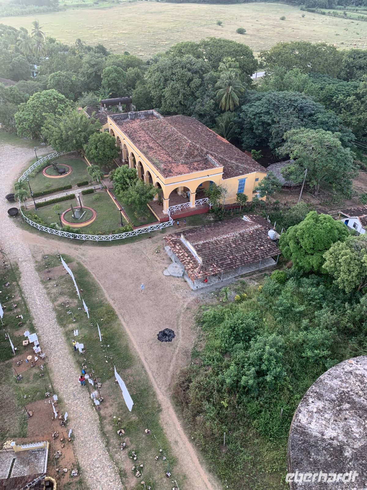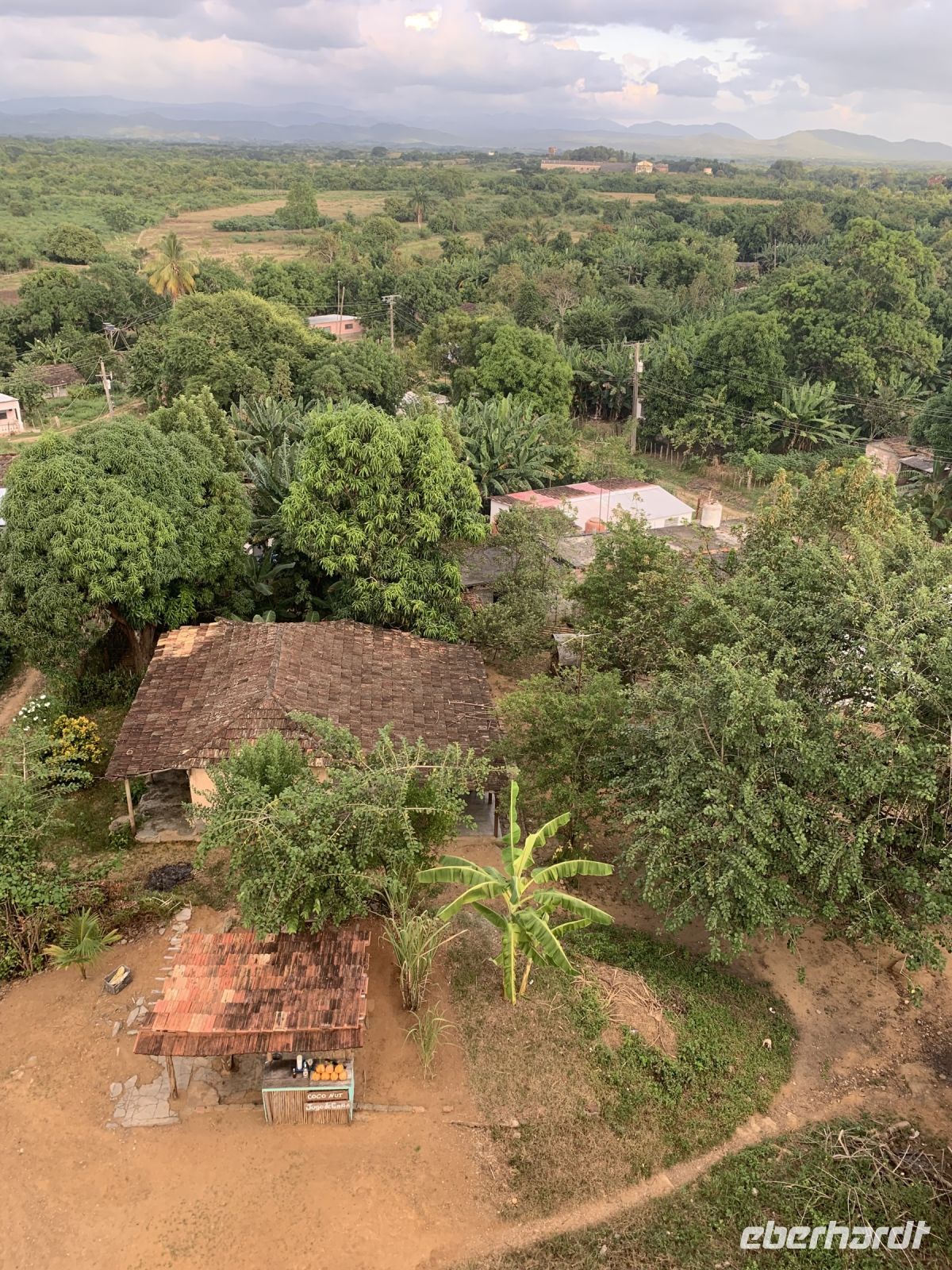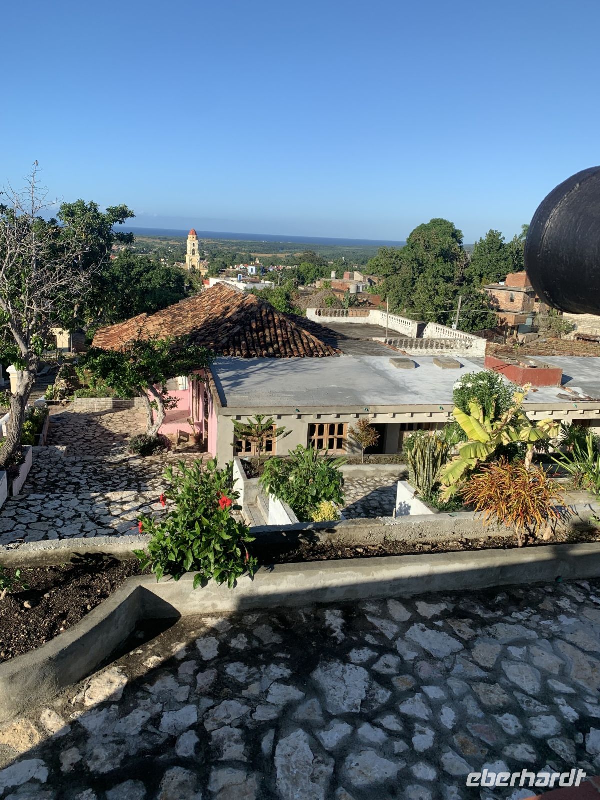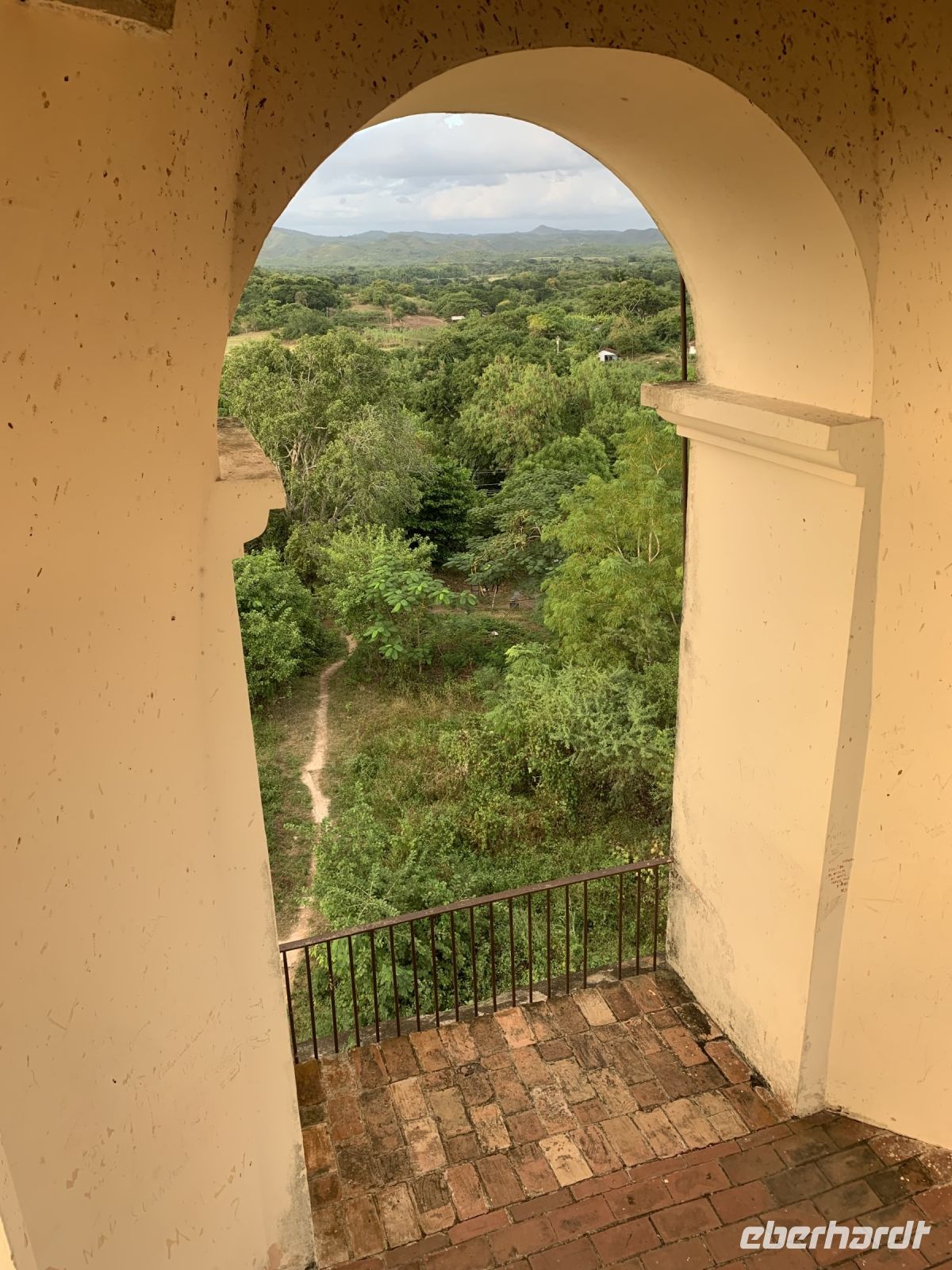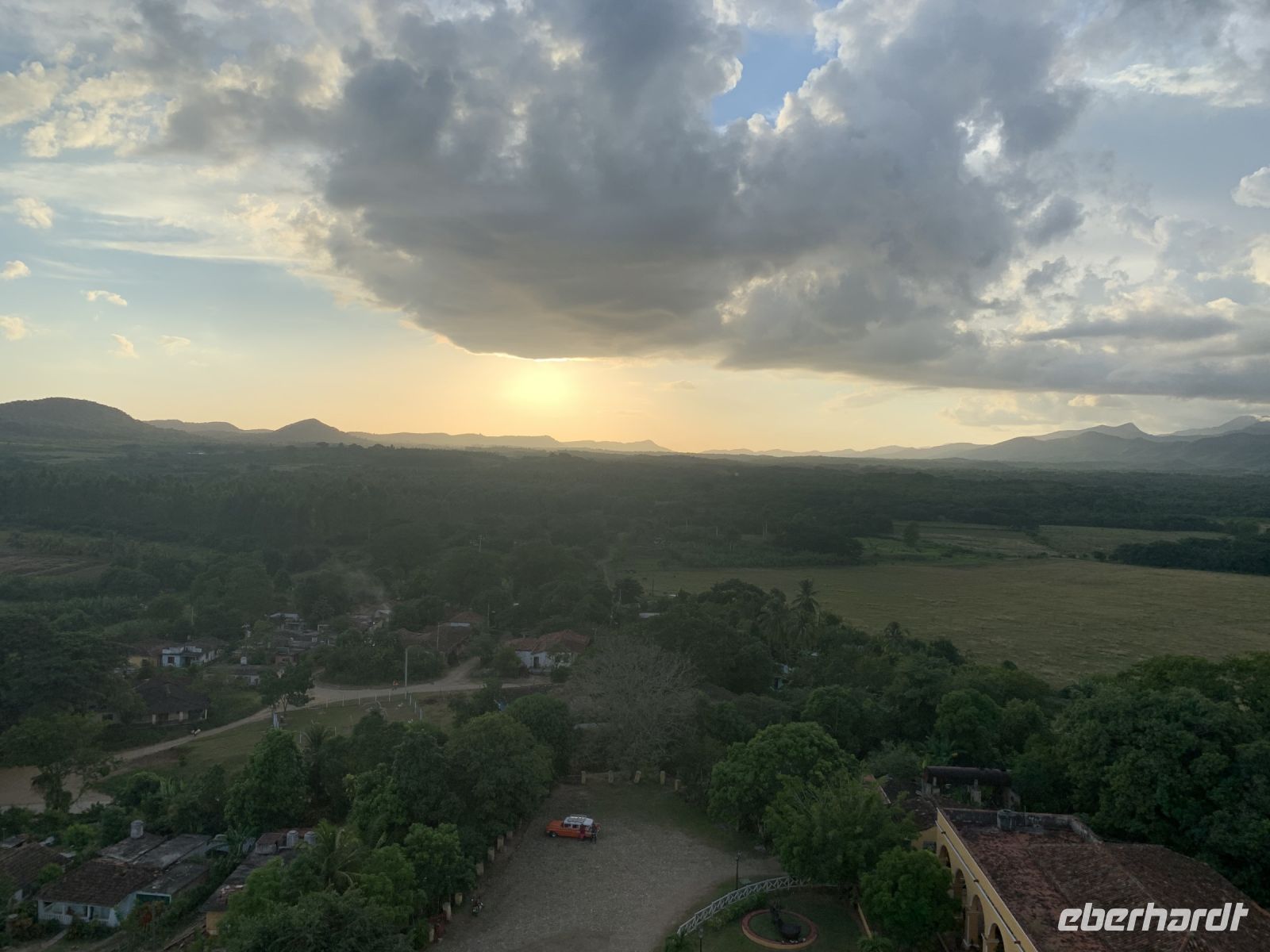 Mittlerweile ist Mittag schon vorüber und so kehren wir in das Gasthaus Taberna Yayabo am gleichnamigen Fluss ein und stärken uns für die letzte Anstrengung des Tages. Wir fahren nach Manaca Iznaga und besehen das Sommerhaus eines reichen Zuckerbarons. Auf dem Gelände befindet sich ein 45 m hoher Turm, früher diente er wohl der Überwachung der Sklaven. Gegenwärtig hat man von ihm einen schönen Rundblick in das Tal der Zuckermühlen. Wir erklimmen ihn mutig und werden mit schönen Fotomotiven belohnt. Gegen 18:00 Uhr erreichen wir Trinidad und checken im schicken Hotel "Mystique La Popa" ein. Zum Abendessen gehen wir in die Altstadt, in den Paladar "1514". Mit Musik und Tanz werden wir verwöhnt und auch das Essen ist vorzüglich.