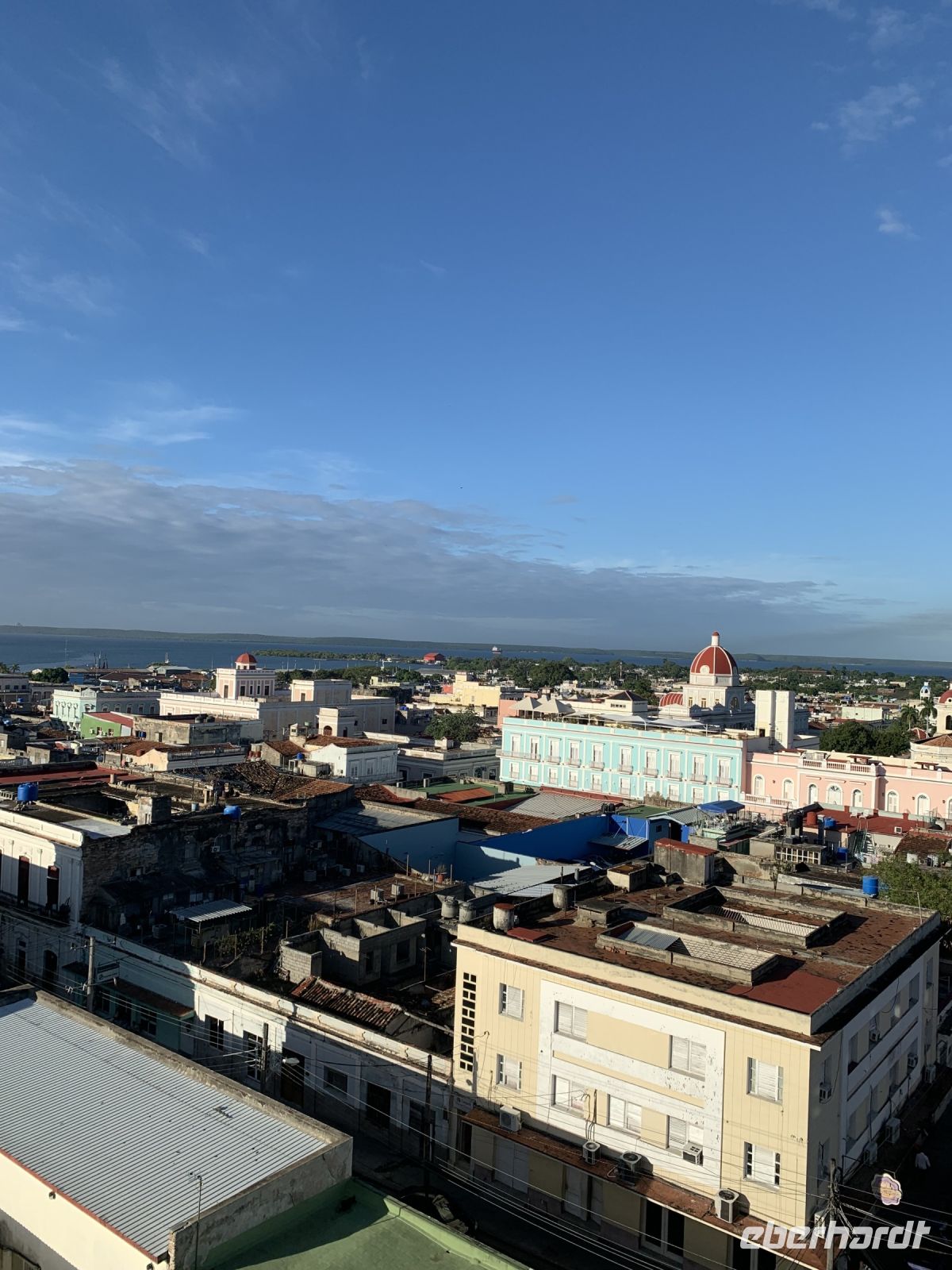 Am Ende des Weges erwartet uns eine Cafeteria und wir nehmen einen Mittagsimbiss ein, nun kann es weitergehen mit Cienfuegos. Die Stadt ist noch jung, sie wurde 1819 von französischen Siedlern gegründet und weist, im Gegensatz zu Camagüey, einen streng schachbrettartigen Grundriss auf. Wir besichtigen das Theater Terry mit seinem interessanten Deckengemälde und der ausgeklügelten Technik. Schöne Paläste am Ufer der Bucht zeugen vom Glanz vergangener Tage. Einen der schönsten Paläste besuchen wir auf einen Drink. Der wird uns auf der Dachterrasse des Palacio Valle serviert. Bei einem entspannten Blick in die ausgedehnte Bucht erfahren wir, dass der Palast 1917 für den Großgrundbesitzer Acisclo del Valle fertiggestellt wurde und in sich gotische, maurische und venezianische Elemente vereint. Mit vielen Eindrücken versehen, checken wir im Hotel Don Carlos ein und nehmen hier auch das Abendessen ein.