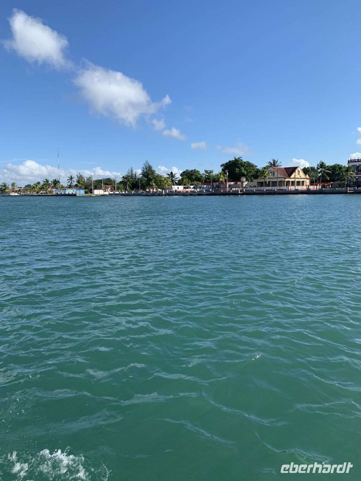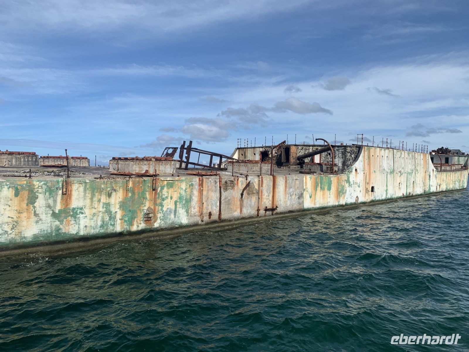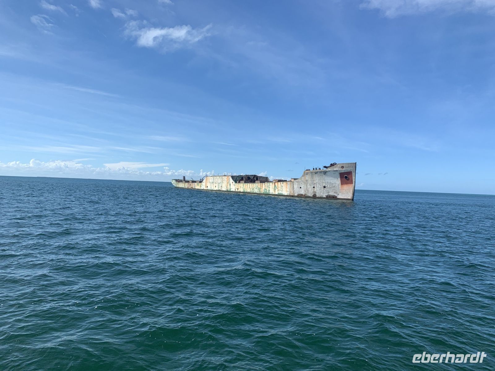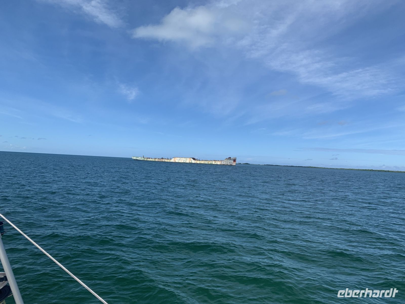 Nach 45 Minuten geht es weiter, wir kommen recht nahe an das Schiffswrack "Don Pascal" heran, es transportierte Melasse von Kuba in die USA und war aus Beton. Vor 90 Jahren lief es auf ein Riff und seitdem liegt es da im Wasser und noch befindet sich Melasse im Inneren des Schiffes, man kann es riechen. Wir umrunden das Wrack, dann ist es Zeit für ein gutes Mittagessen mit Languste, Fisch, Reis und Gemüse, dazu etwas Weißwein.