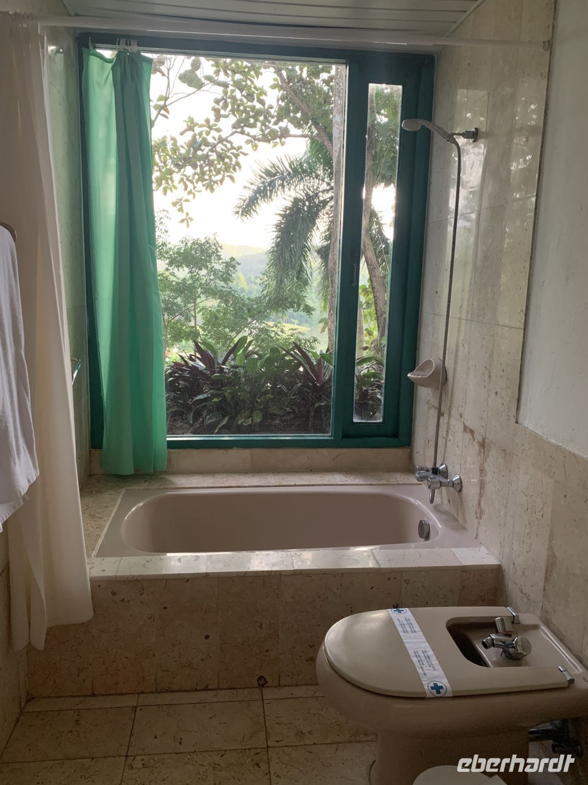 Am frühen Abend kommen wir an im Hotel Porto Santo in Baracoa, es liegt malerisch in der Bucht von Baracoa, hat einen kleinen Strand mit einem Kolumbuskreuz und gepflegte Außenanlagen mit einem Swimmingpool. Die Gäste nutzen diese Möglichkeiten und erfrischen sich mit einem Bad, danach sieht die Welt auf alle Fälle schon besser aus.