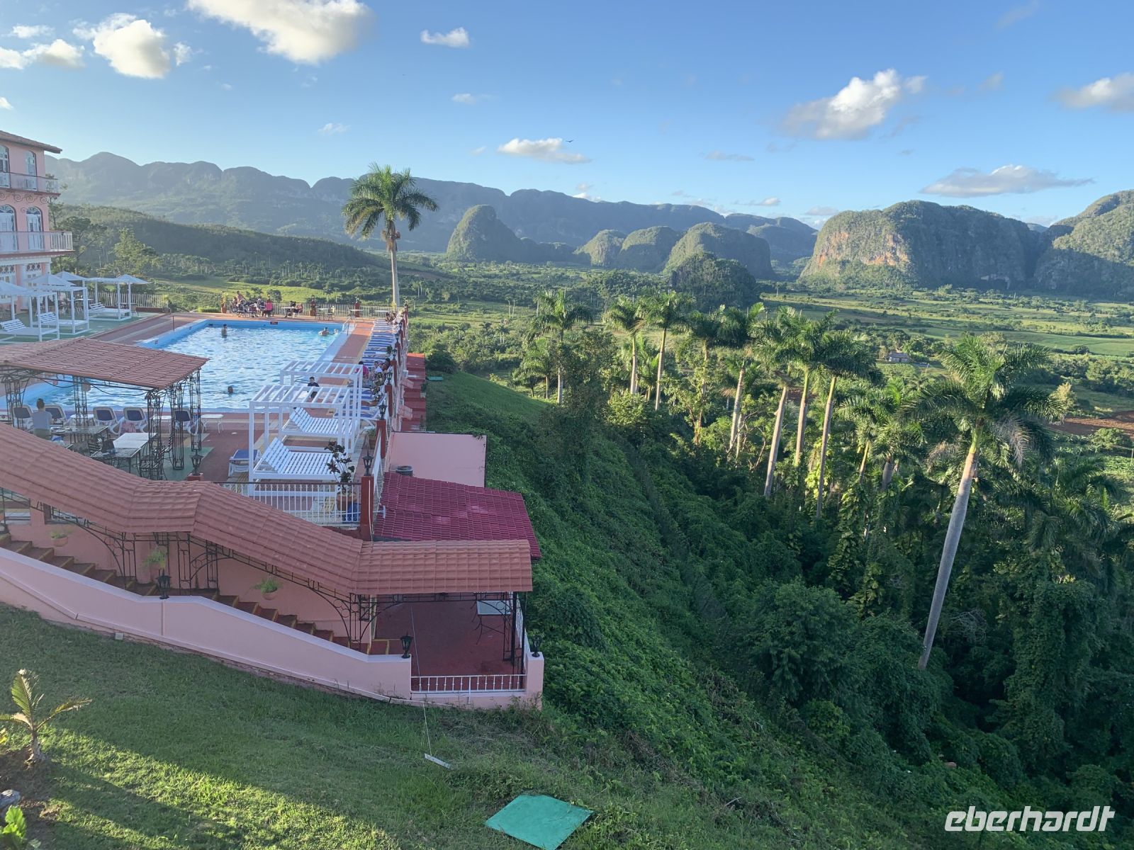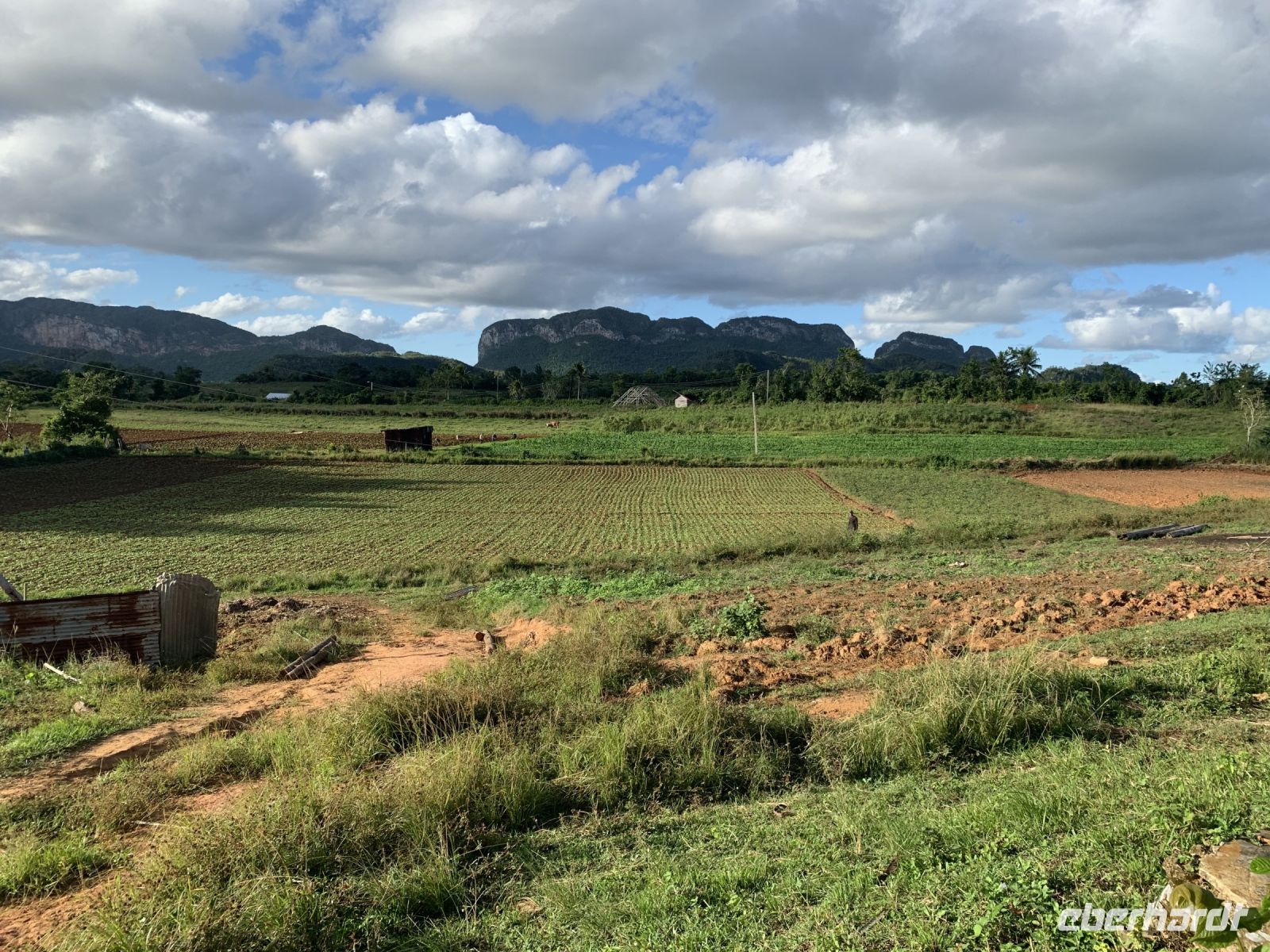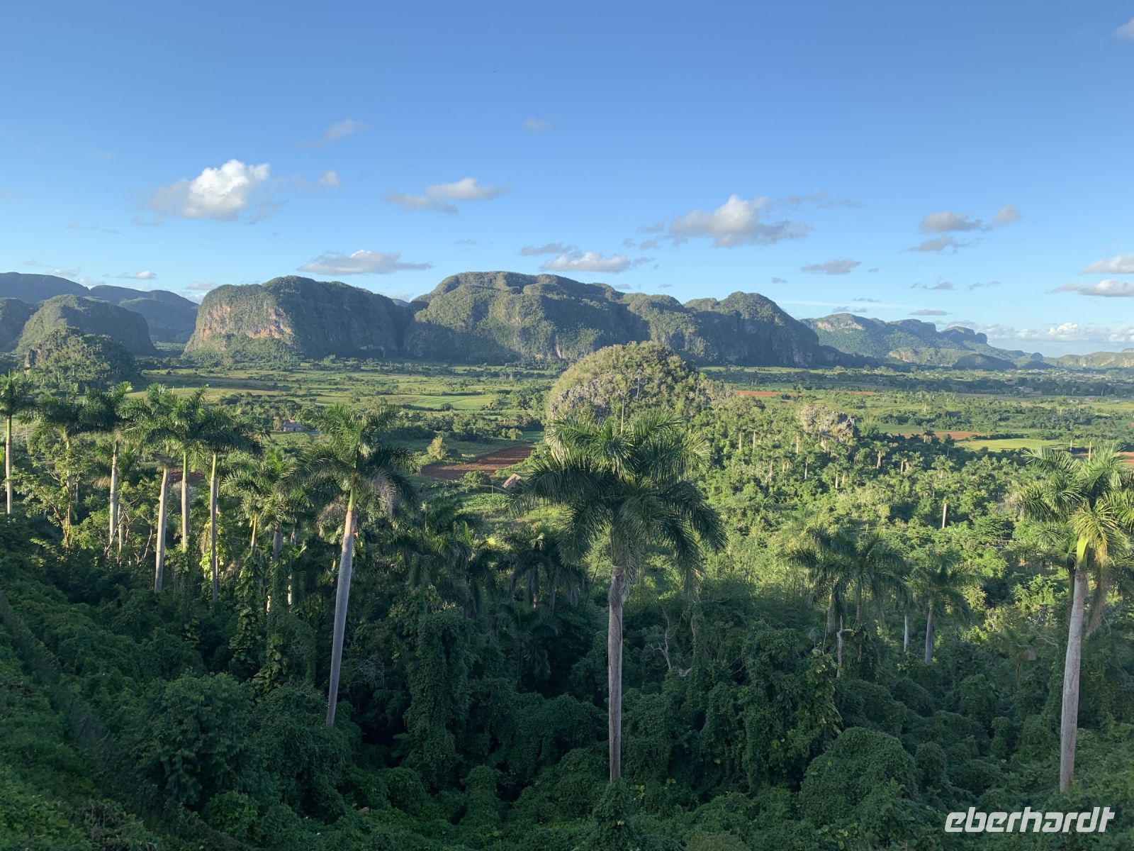 Vom Aussichtspunkt Los Jazmines können wir die Karstformationen von Vinales gut sehen, in Kuba heißen sie Mogotes und sie sind mit die Ursache für das besondere Klima, welches so günstig ist für das Gedeihen der Tabakpflanzen.