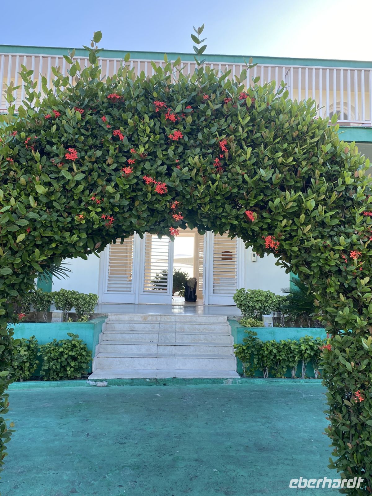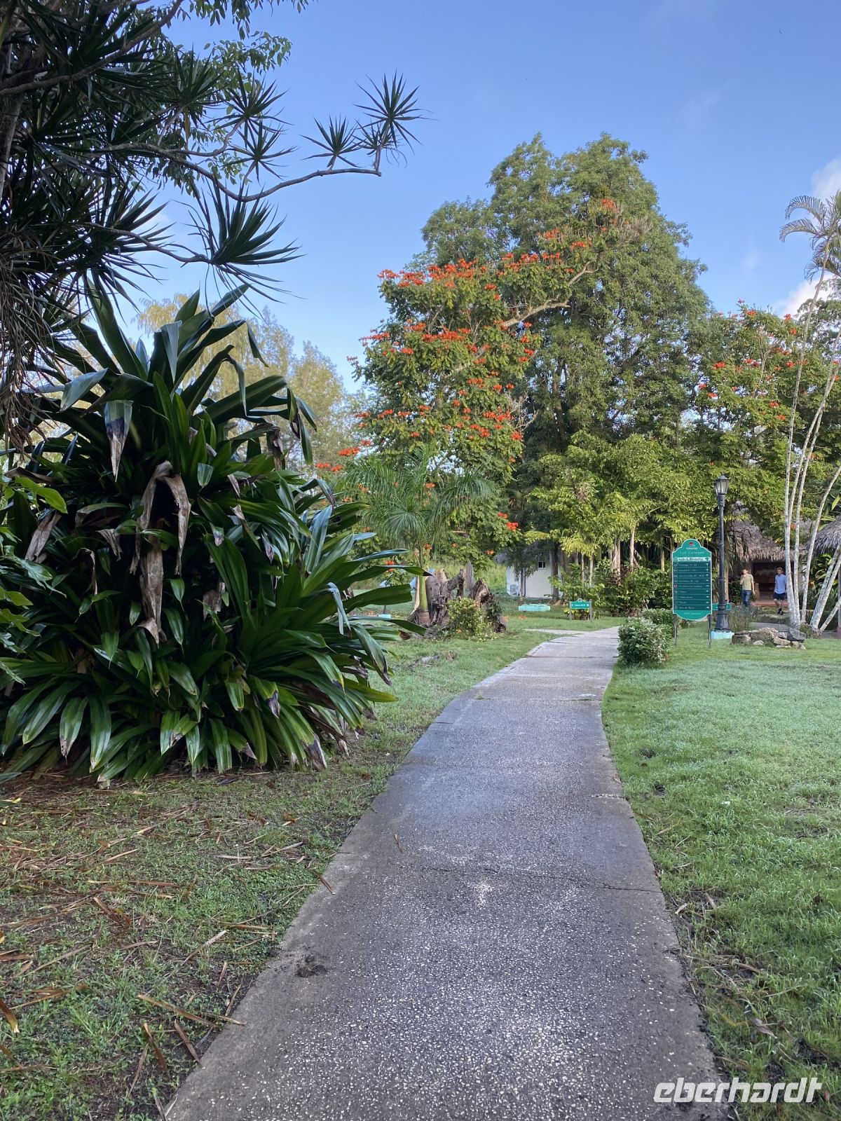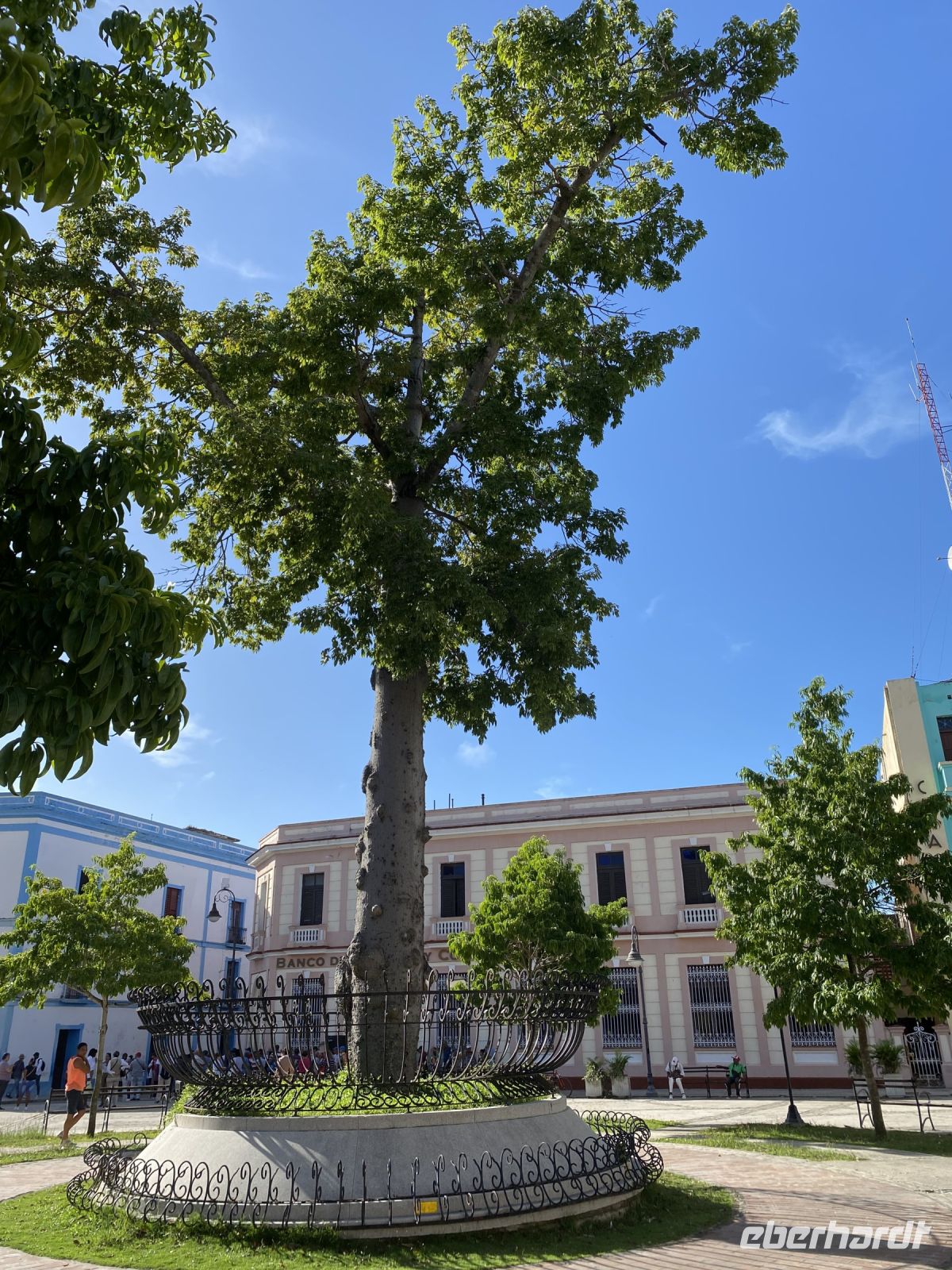 In der Bar Canchanchara trinken wir das gleichnamige Getränk aus Rum, Zitrone, Wasser und Eis und finden es recht bekömmlich. Nun entfliehen wir ein wenig der Hitze und fahren am Meer entlang in Richtung Cienfuegos. Dort sind wir pünktlich am Botanischen Garten und werden von der Führerin Hilda schon erwartet. Der Garten gehörte einem reichen Zuckerfabrikanten aus den USA, F. Atkins, der wollte zunächst Zuckerrohrsorten züchten, sammelte aber dann doch lieber Bäume. Im Garten wachsen mehr als 2.000 verschiedene Pflanzenarten aus den unterschiedlichsten Regionen der Erde. Bis Anfang der 60er Jahre nutzte die Harvard-Universität den Garten zu Forschungszwecken. Wir sehen verschiedene Palmen, Bambus und Gummibäume, den Kanonenkugelbaum und den Leberwurstbaum. Viele Hibiskusarten wachen da, auch Eisenholz und Ebenholz. Beeindruckt ob der großen Vielfalt setzen wir uns in der Cafeteria des Gartens zu einem kleinen Mittagsimbiss nieder. Danach führt uns der Weg in den Stadtteil Punta Gorda, wo es am Wasser angenehm frisch ist. Das wussten auch viele reiche Stadtbewohner, die hier ihre Paläste bauen ließen. Wie z.B. der reiche Acisclo del Valle, der das imposante Gebäude des Palacio del Valle in Auftrag gegeben hat. Es beherbergt jetzt ein exklusives Restaurant und wir nehmen auf der Dachterrasse einen guten Drink und bedanken uns höflich bei Eberhardt Travel.