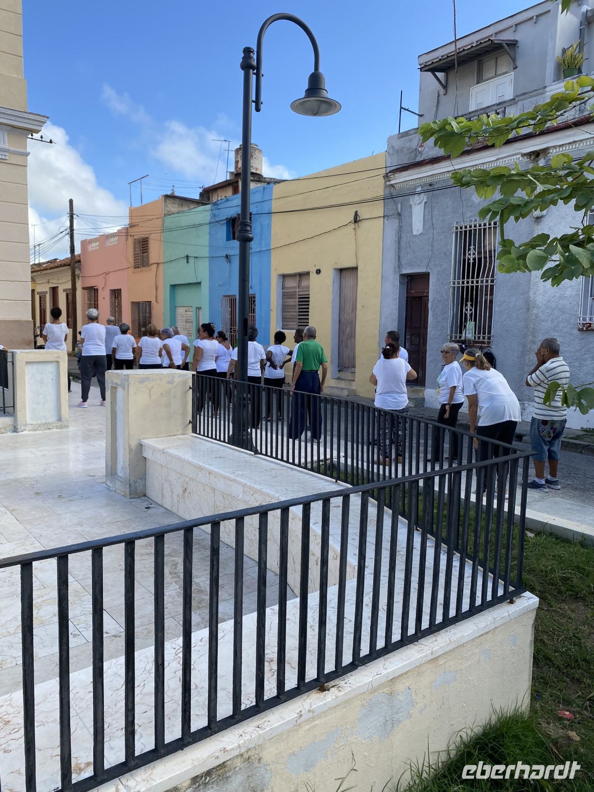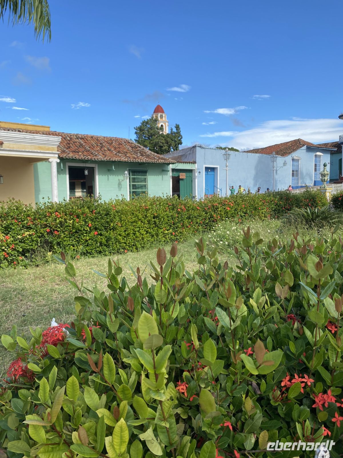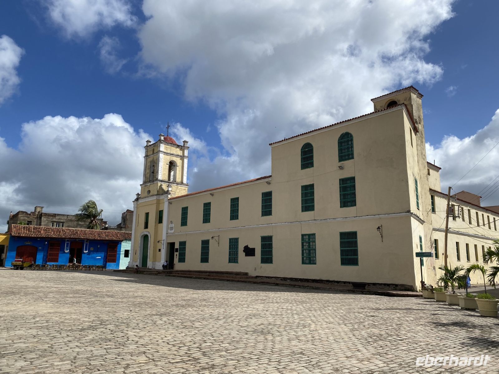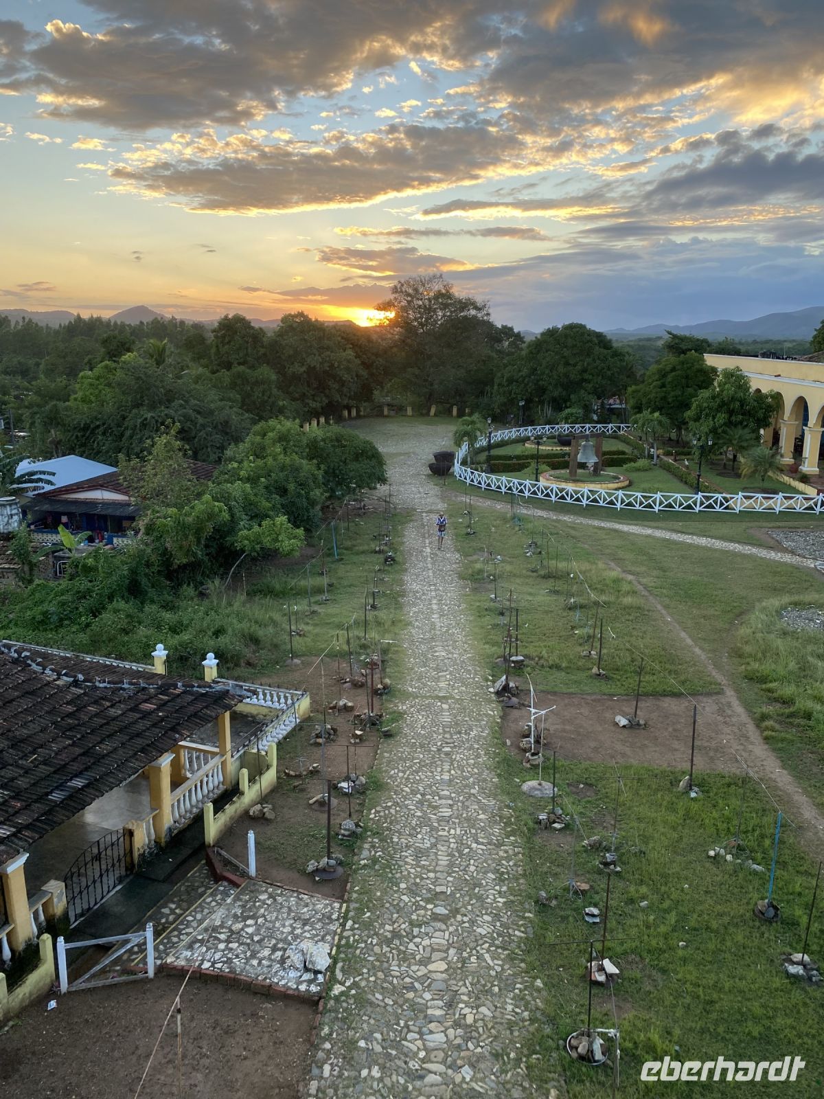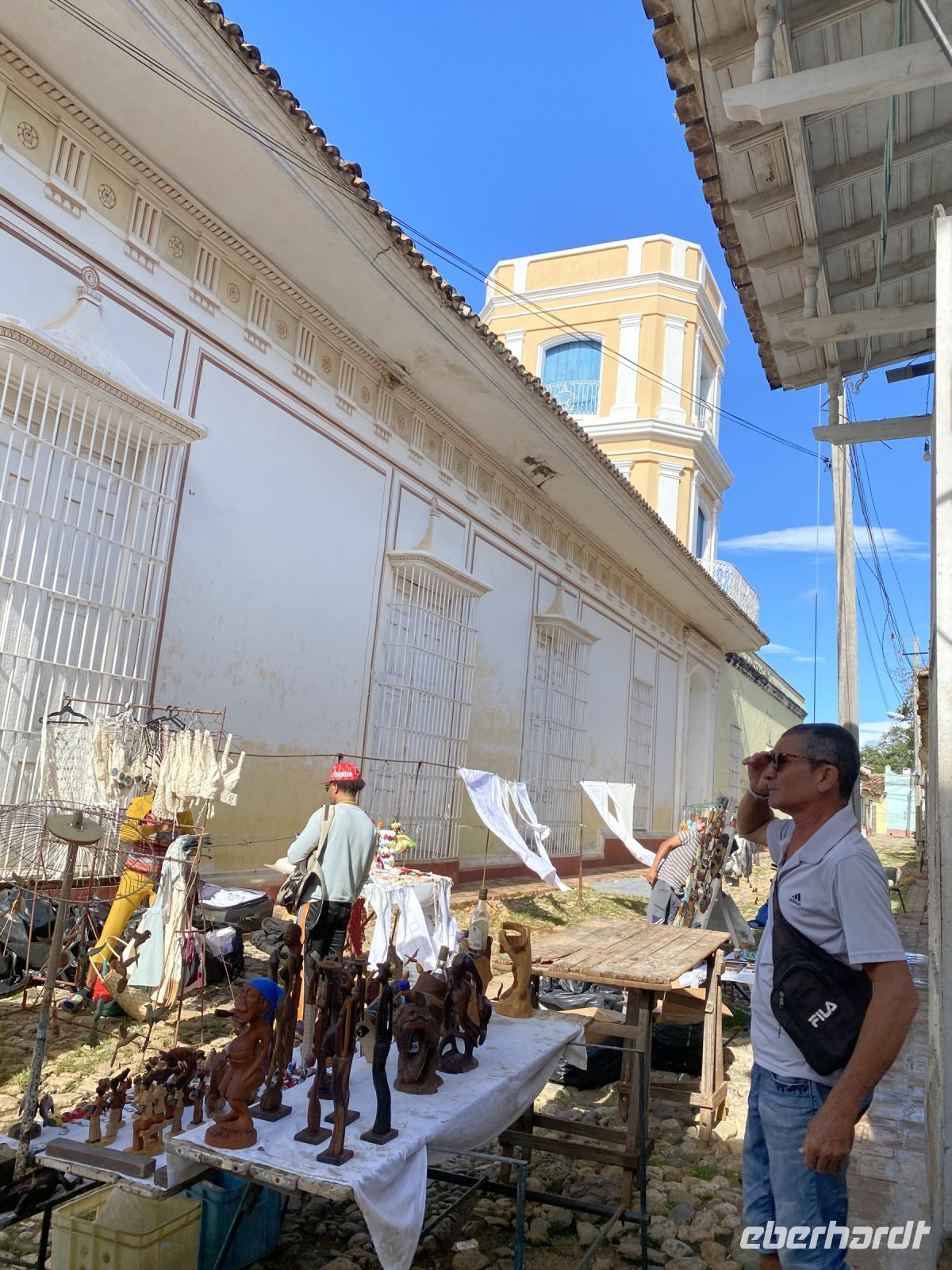 Am Morgen schauen wir uns Trinidad an, einst eine der reichsten Städte Kubas, dank seines Zuckers. Auf holprigem Kopfsteinpflaster wandern wir vorüber an den imposanten Palästen bis zum Hauptplatz mit der Kirche Santisima Trinidad. Wir stellen uns vor, wie die Damen früher hinter den kunstvollen Fenstergittern aus Holz oder Metall saßen, stickten und die Vorübergehenden beobachteten .Der Glockenturm des früheren Franziskanerklosters überragt die Stadt und ist weithin sichtbar.