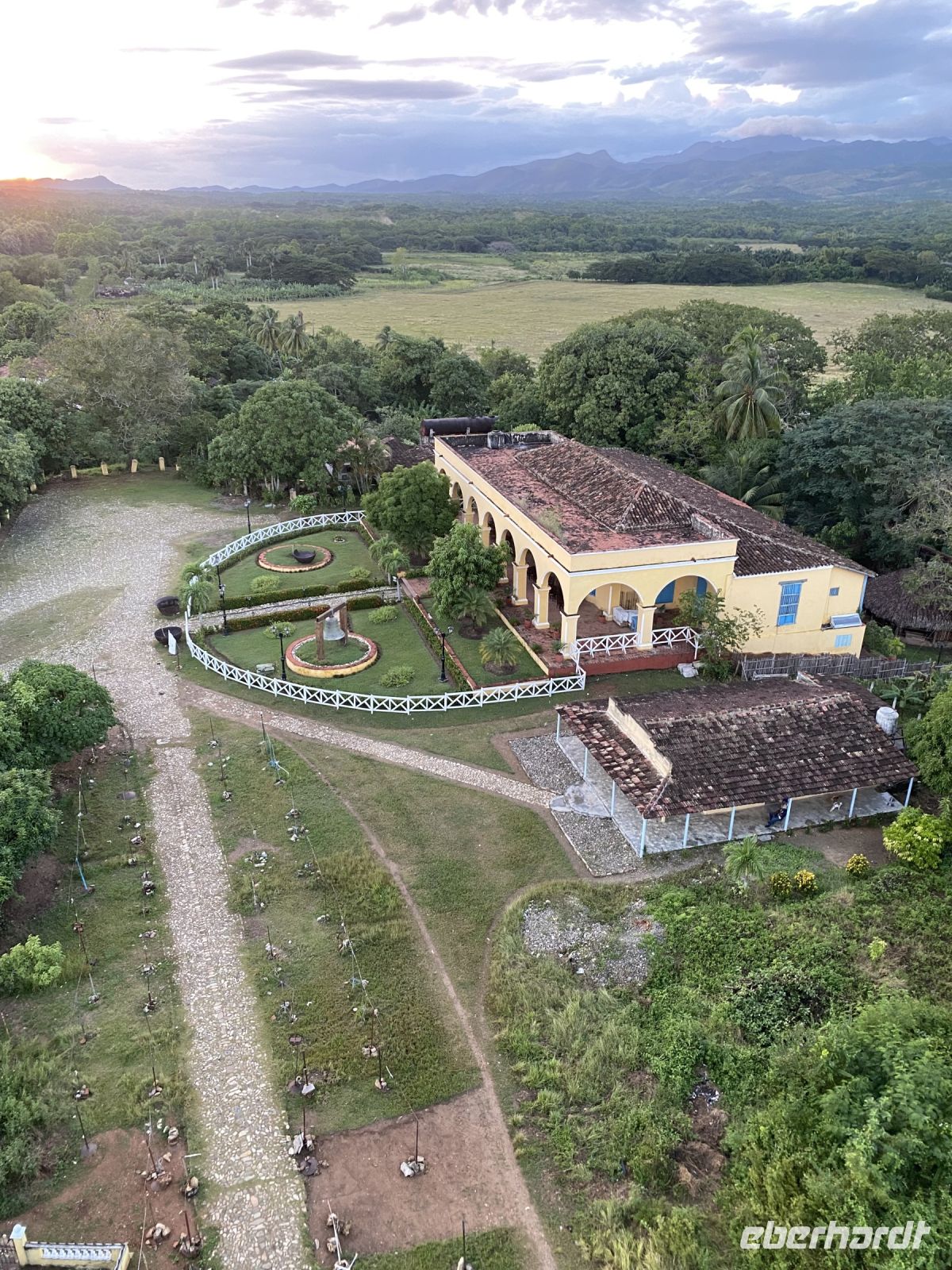 Nun heißt es, die Fahrräder mit dem Sitz im Bus zu tauschen, wir müssen noch ein gutes Stück fahren. Die erste Pause haben wir an einer hübschen Raststätte "El Vaquero", bekannt für die gute Pina Colada, danach erreichen wir bald die Stadt Sancti Spiritus, immer ein wenig im Schatten der reicheren Nachbarstadt Trinidad. Ein kleiner Stadtspaziergang und ein guter Imbiss mit dem Getränk Yayabo machen uns die Stadt sympathisch. Yayabo besteht aus Zuckerrohrsaft, Zitrone, Honig, Rum und Eis. So mit neuer Energie versehen, fahren wir noch bis Manaca Iznaga, das Landgut einer der reichsten Zuckerbarone der Region. Wir sehen sein Landhaus und besteigen den Turm, von wo aus er seine Besitzungen überwachen ließ. Danach sind wir reif für die Halbinsel Ancon bei Trinidad. Wir checken im recht neuen Hotel Melia Trinidad Peninsula ein und haben hier für 2 Tage all inclusive.