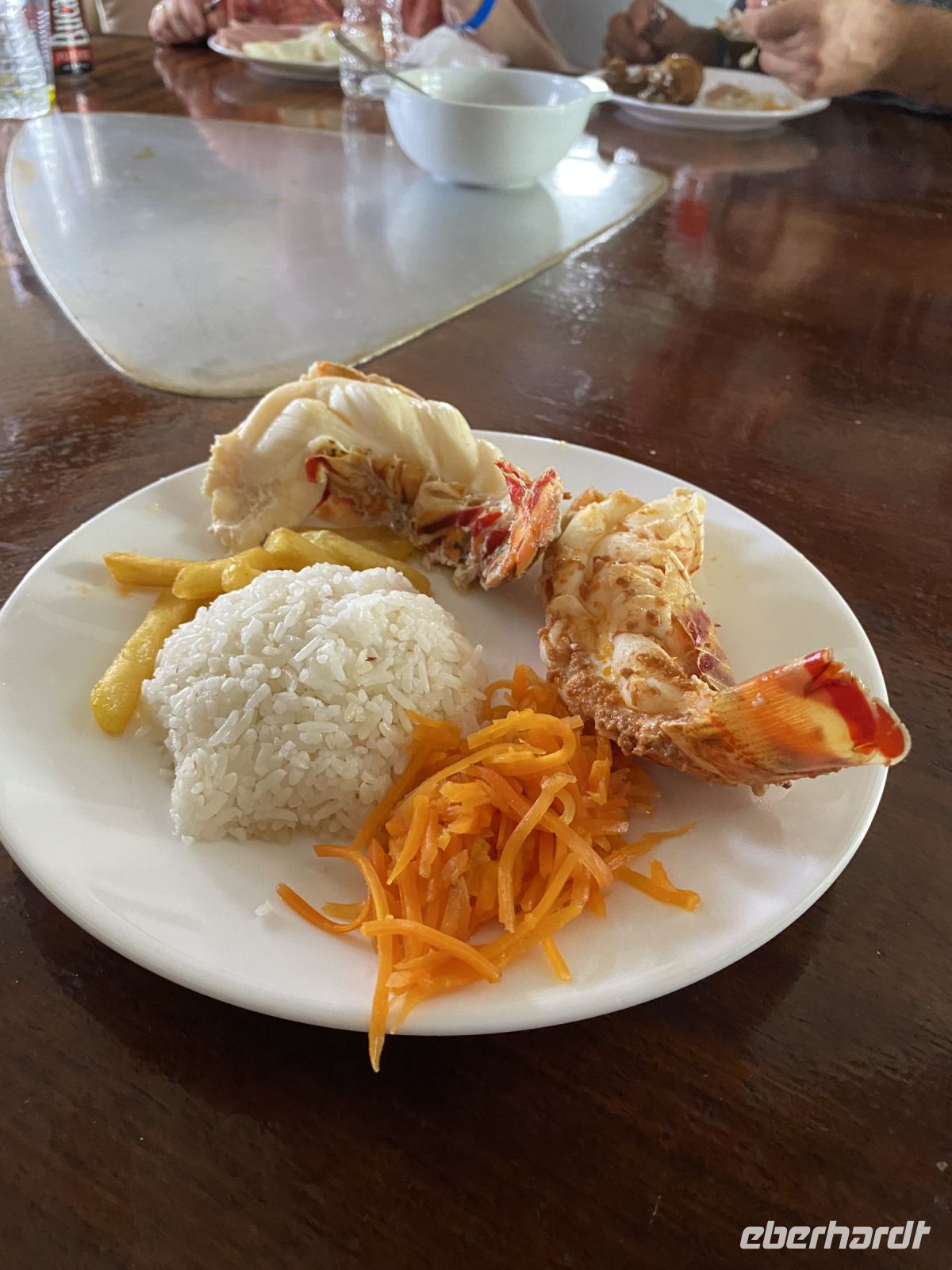 Über einen mehr als 40 m langen Damm fahren wir vorbei an Mangroven bis zu unserem Hotel, wo wir 17:00 Uhr einchecken, etwas ausruhen und dann 19:00 zum Abendessen gehen.