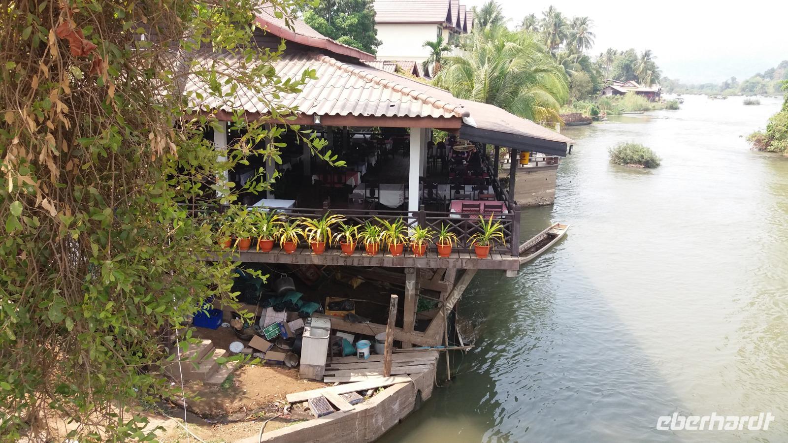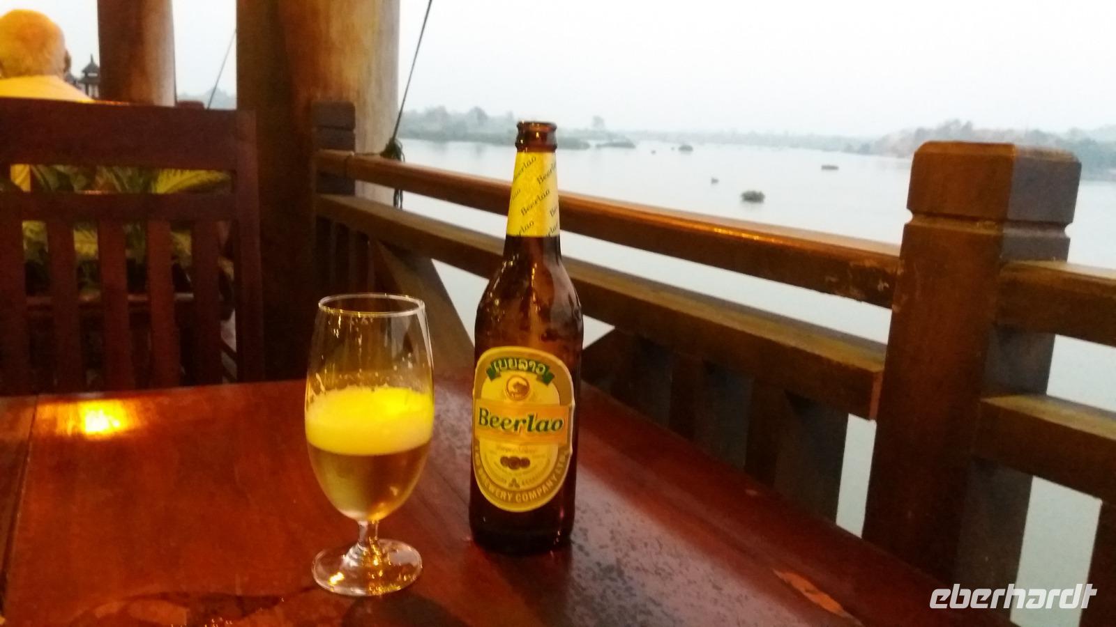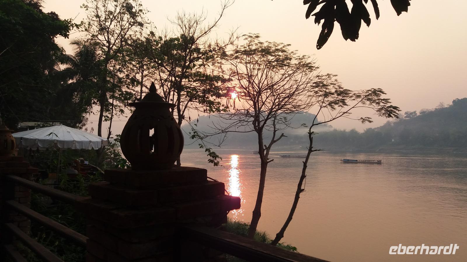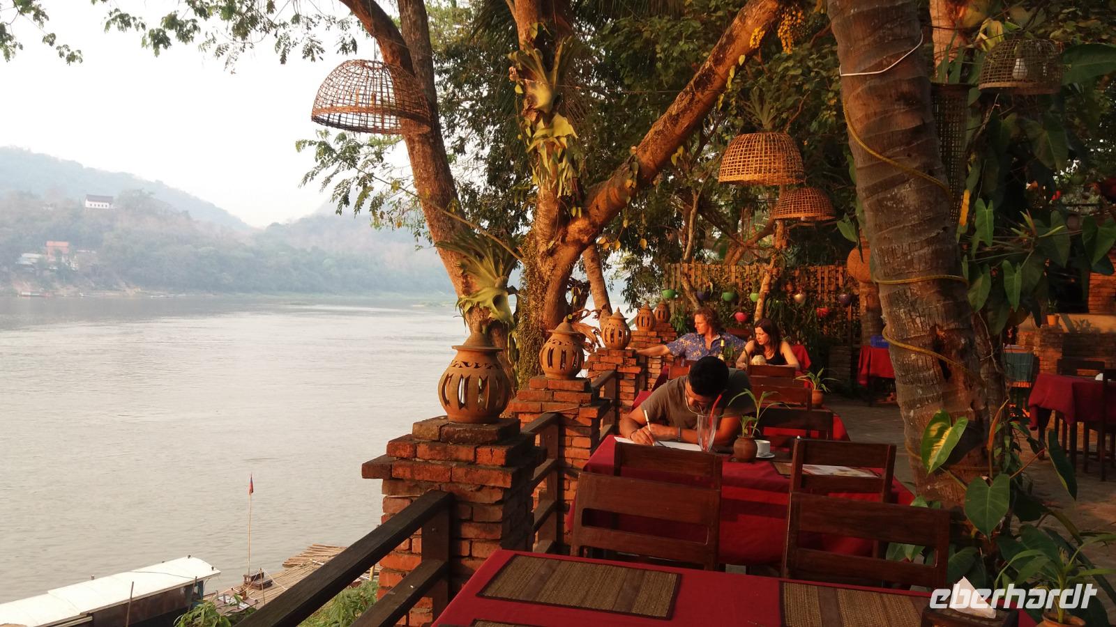 Dieses Hotel überraschte uns gleich mit seiner besonderen Atmosphäre. Eine traumhaft schöne Gartenanlage, sehr gepflegt mit exotischen Pflanzen und Teichen, ein Ruhepol nach der anstrengenden Anreise. Da unsere Zimmer aber noch nichts ganz bezugsfertig waren, führte uns Khamchang durch Luang Prabang. Er erzählte uns gleich sehr viel Persönliches, und so hatten wir ganz bald das Gefühl, ihn schon lange zu kennen. Am Mekong setzten wir uns in ein Terrassenrestaurant und genossen ein gekühltes "LaoBeer" oder einen ersten Kaffee "Lao Style", hhmm .. sau lecker mit gezuckerter Milch und so ..