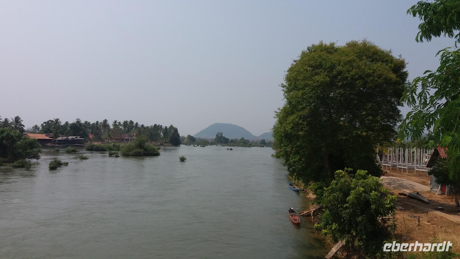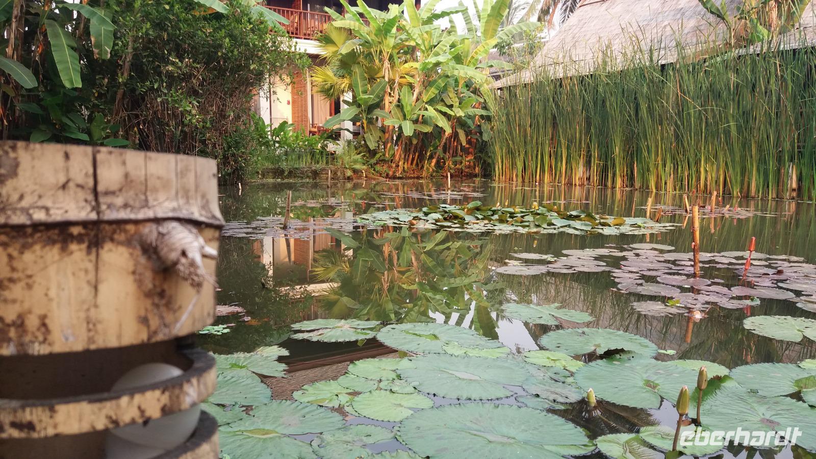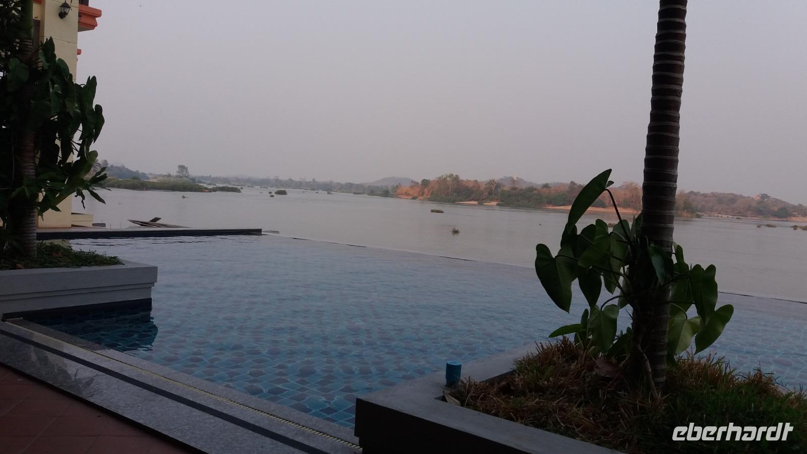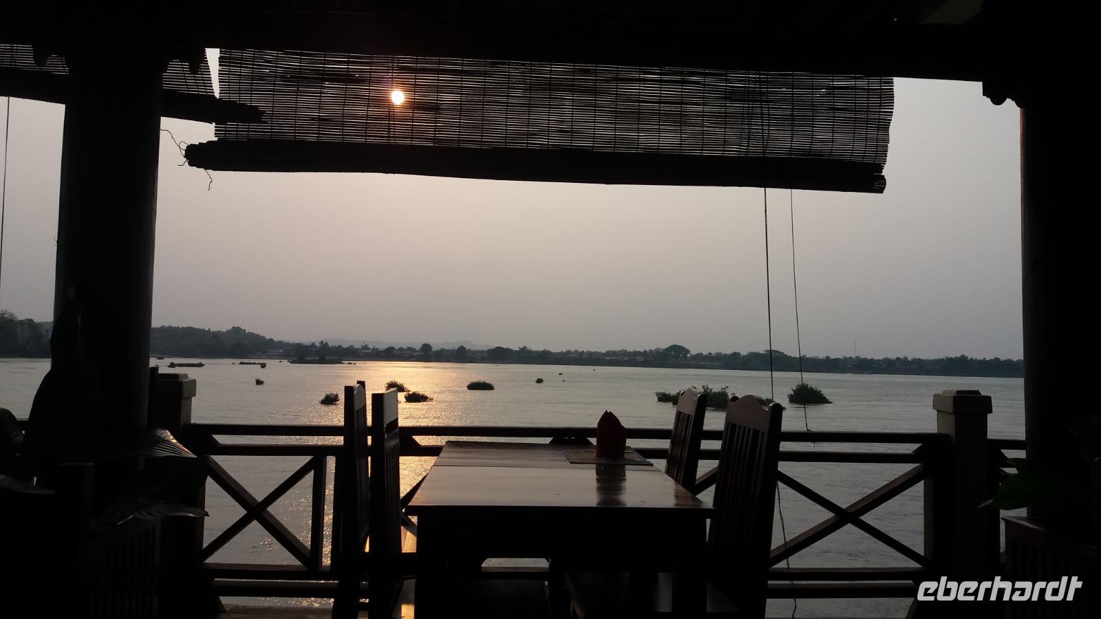 Dieses Hotel überraschte uns gleich mit seiner besonderen Atmosphäre. Eine traumhaft schöne Gartenanlage, sehr gepflegt mit exotischen Pflanzen und Teichen, ein Ruhepol nach der anstrengenden Anreise. Da unsere Zimmer aber noch nichts ganz bezugsfertig waren, führte uns Khamchang durch Luang Prabang. Er erzählte uns gleich sehr viel Persönliches, und so hatten wir ganz bald das Gefühl, ihn schon lange zu kennen. Am Mekong setzten wir uns in ein Terrassenrestaurant und genossen ein gekühltes "LaoBeer" oder einen ersten Kaffee "Lao Style", hhmm .. sau lecker mit gezuckerter Milch und so ..