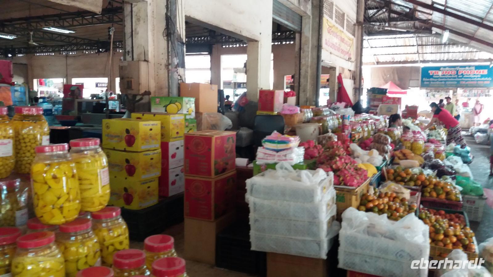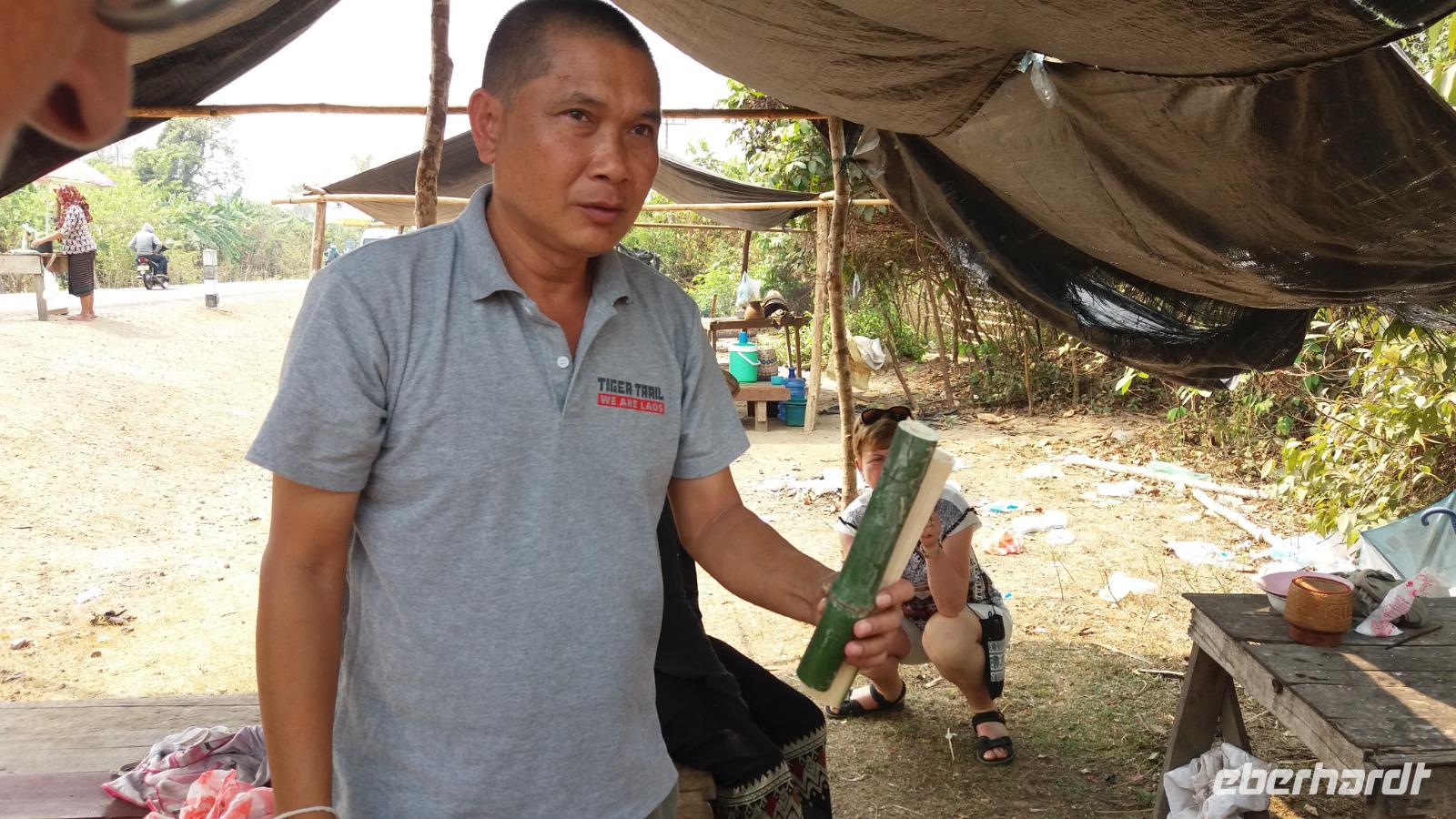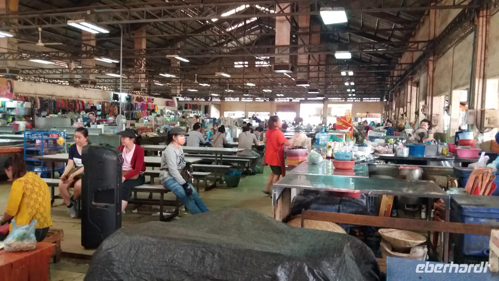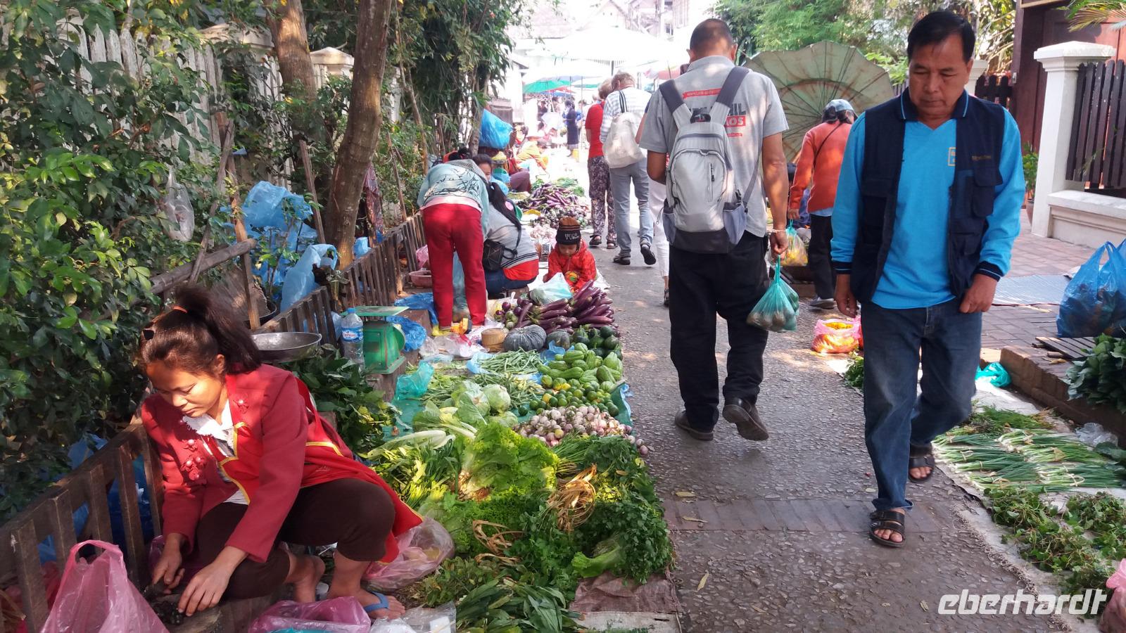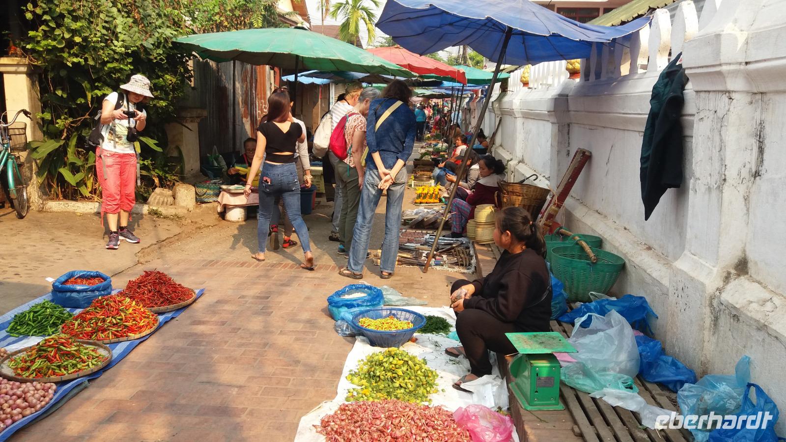 ein Markt in erster Linie für die Laoten, auf dem die Speisen für den Tag erworben werden können. Aber auch wir Touristen genossen den Spaziergang darüber, gab es doch so zahlreiche farbige und duftende Eintrücke, allerlei Gewürze oder Gemüse, die wir nicht zuordnen konnten. Khamchang kannte all dies und wusste oft heilende Wirkungen zu berichten. Auch nutzten wir den Markt als Inspiration für unser abendliches Mahl. Anschließend zeigte uns Khamchang das Munitionsmuseum, sehr spannend, denn Khamchang hat viele Jahre als Munitionsentschärfer gearbeitet und kannte alle Bomben und Minen, die die Amerikaner über Laos abwarfen. Es bedrückte uns sehr, auch mit welcher Leichtigkeit Khamchang darüber sprach. Desweiteren besuchten wir die wichtigsten Tempel von Luang Prabang.