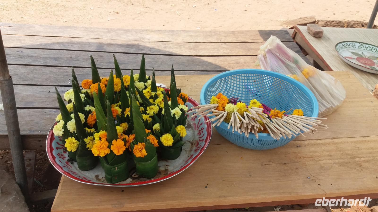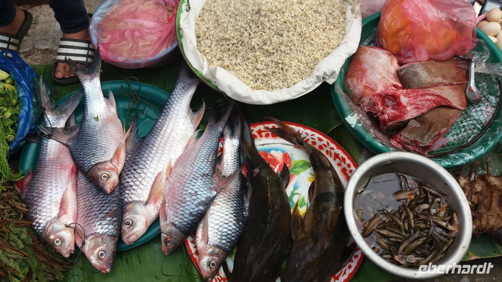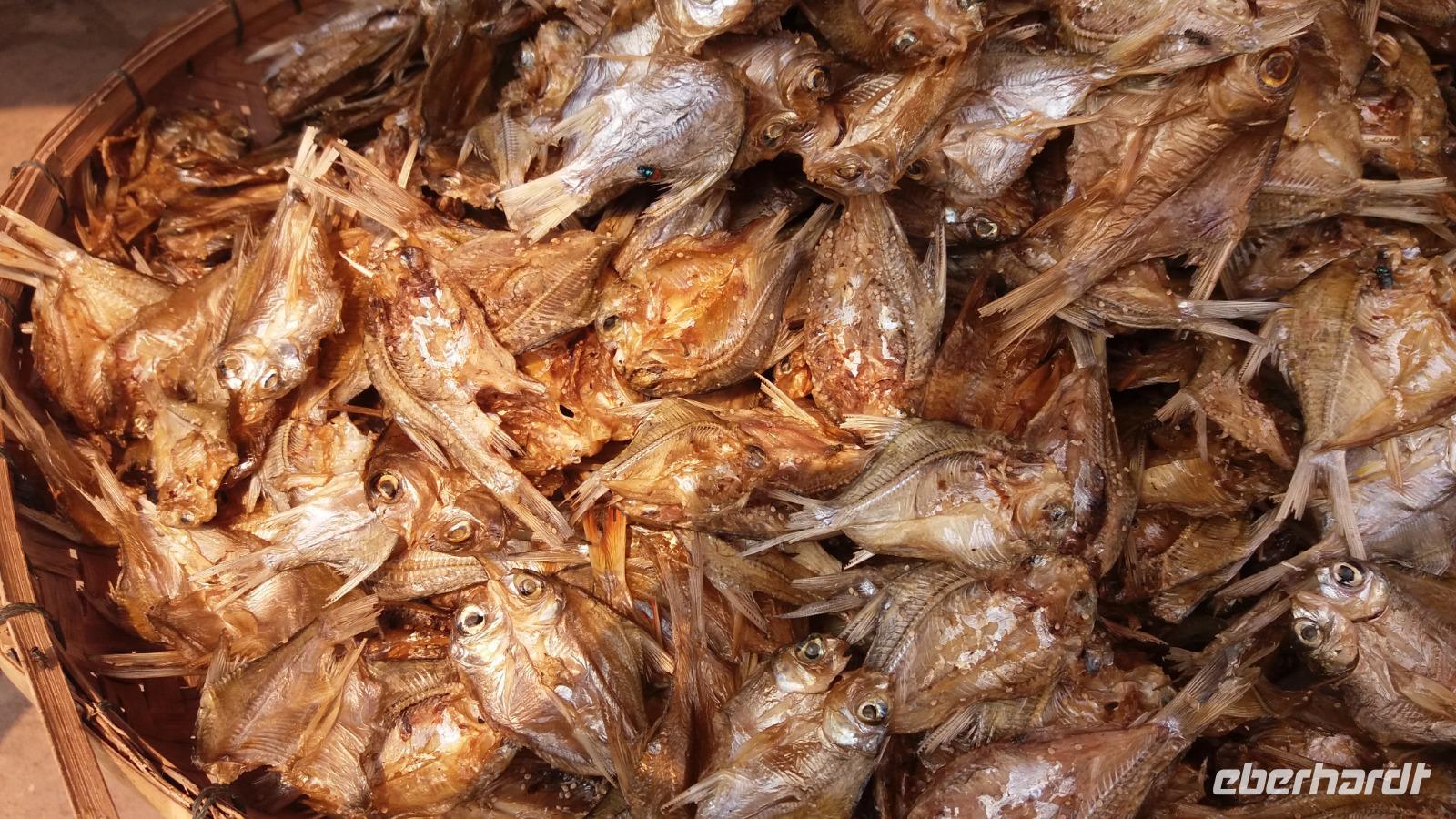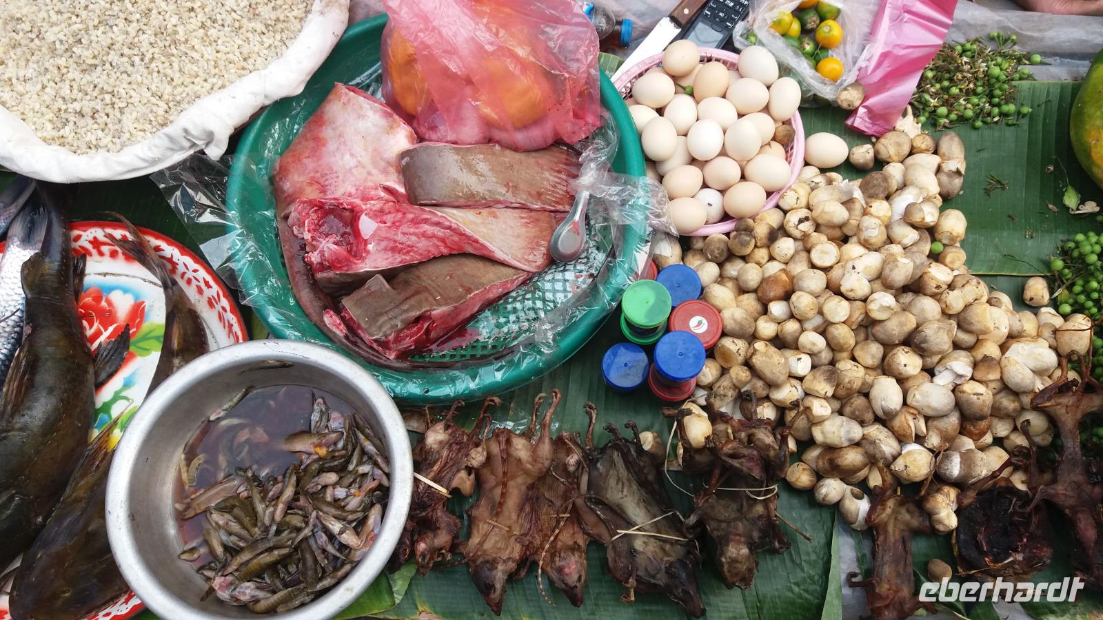 ein Markt in erster Linie für die Laoten, auf dem die Speisen für den Tag erworben werden können. Aber auch wir Touristen genossen den Spaziergang darüber, gab es doch so zahlreiche farbige und duftende Eintrücke, allerlei Gewürze oder Gemüse, die wir nicht zuordnen konnten. Khamchang kannte all dies und wusste oft heilende Wirkungen zu berichten. Auch nutzten wir den Markt als Inspiration für unser abendliches Mahl. Anschließend zeigte uns Khamchang das Munitionsmuseum, sehr spannend, denn Khamchang hat viele Jahre als Munitionsentschärfer gearbeitet und kannte alle Bomben und Minen, die die Amerikaner über Laos abwarfen. Es bedrückte uns sehr, auch mit welcher Leichtigkeit Khamchang darüber sprach. Desweiteren besuchten wir die wichtigsten Tempel von Luang Prabang.