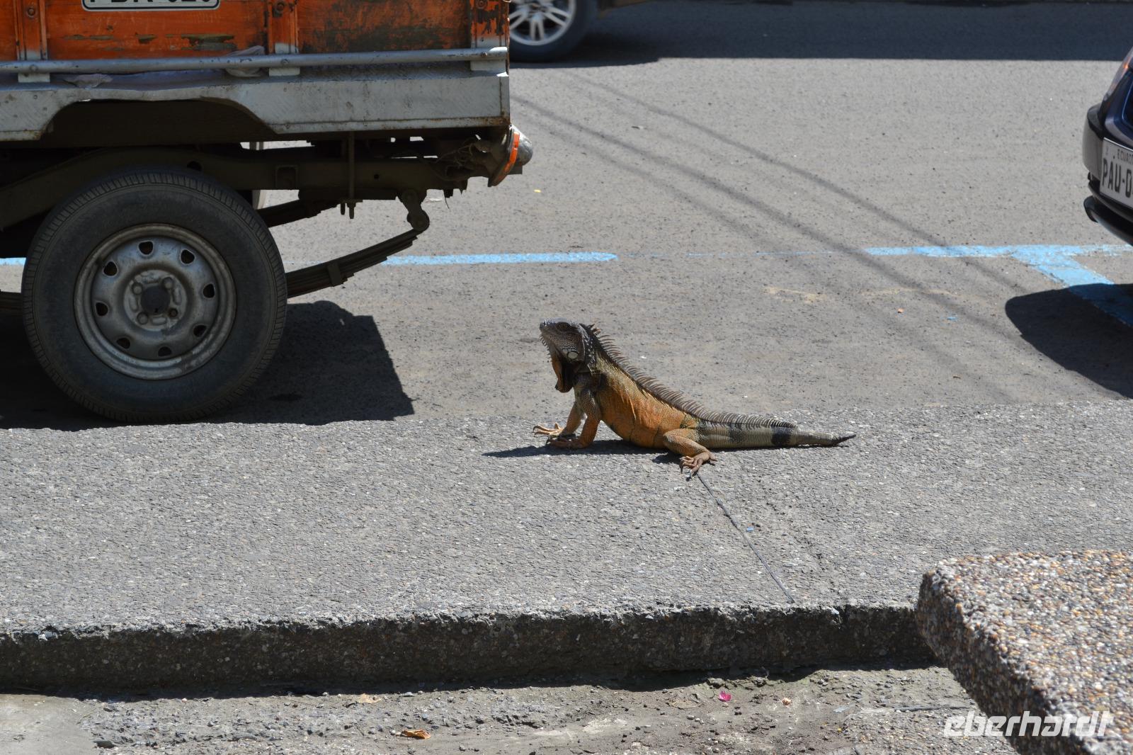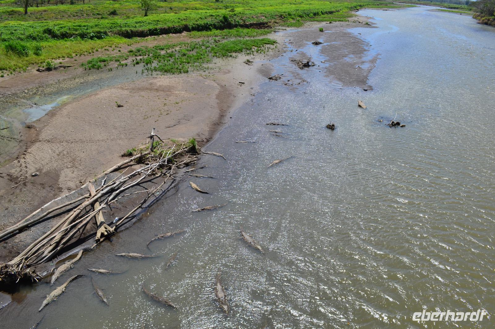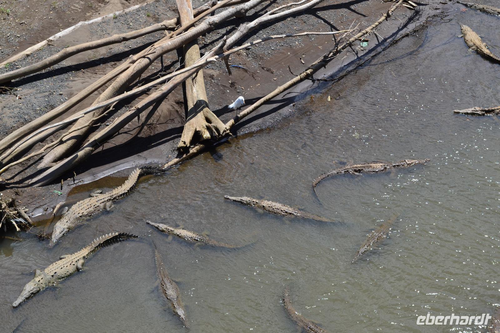 Bereits vom Schiff aus können wir die grüne Küste Costa Ricas bewundern. Was für ein Kontrast zu der kargen und trockenen Wüstenlandschaft in Peru und in Chile! Regnen tut es hier allerdings während der Wintermonate (also jetzt) auch nicht. Dafür ist es noch einmal deutlich heißer und schwüler geworden. Gut, dass uns unsere örtliche Reiseleiterin Ursula in den Carara-Nationalpark entführt, wo wir unter dem dichten Blätterdach fast immer Schatten finden. Sehr anschaulich erklärt sie uns die Kreisläufe, pflanzlichen und tierischen Bewohner des Waldes. Leider können wir die berühmten roten Aras nur hören, aber nicht sehen. Dafür treffen wir auf ganz viele Ameisenkolonien, ja Millionen von Ameisen, in verschiedenen Varianten, vor allem Armeeameisen und Blattschneideameisen. Wir können auch ein Wildhuhn und ein Nagetier im dichten Unterholz aufspüren. Kurz vor dem Mittagessen mit lokalen Spezialitäten soll dann unser Reisebegleiter (also ich) an Krokodile verfüttert werden. Doch ich rieche den Braten und lasse mich auf Angebote, die Krokodile von Nahem zu zählen und ihre Länge zu vermessen, nicht ein. Von der Tarcoles-Brücke kann ich jedoch mindestens 30 Krokodile erspähen. (Die Kenntnis der Größenordnung reicht einem Physiker ja erstmal aus.) Träge liegen sie unten im Fluss. In Wirklichkeit warten sie natürlich aber auf unvorsichtige Touristen, die sich zu weit über die Brücke lehnen, um vielleicht doch noch ein besseres Foto zu schießen (oder weniger erfahrene Reisebegleiter, die auf so ein unmoralisches Angebot hereinfallen). Heute gehen die Krokodile also erstmal leer aus, während wir wieder einmal gut gesättigt zum Schiff zurückfahren. Uns bleiben nun noch etwas mehr als zwei Stunden, um Puntarenas, die ehemals wichtigste Hafenstadt Costa Ricas, selbst zu Fuss zu erkunden.