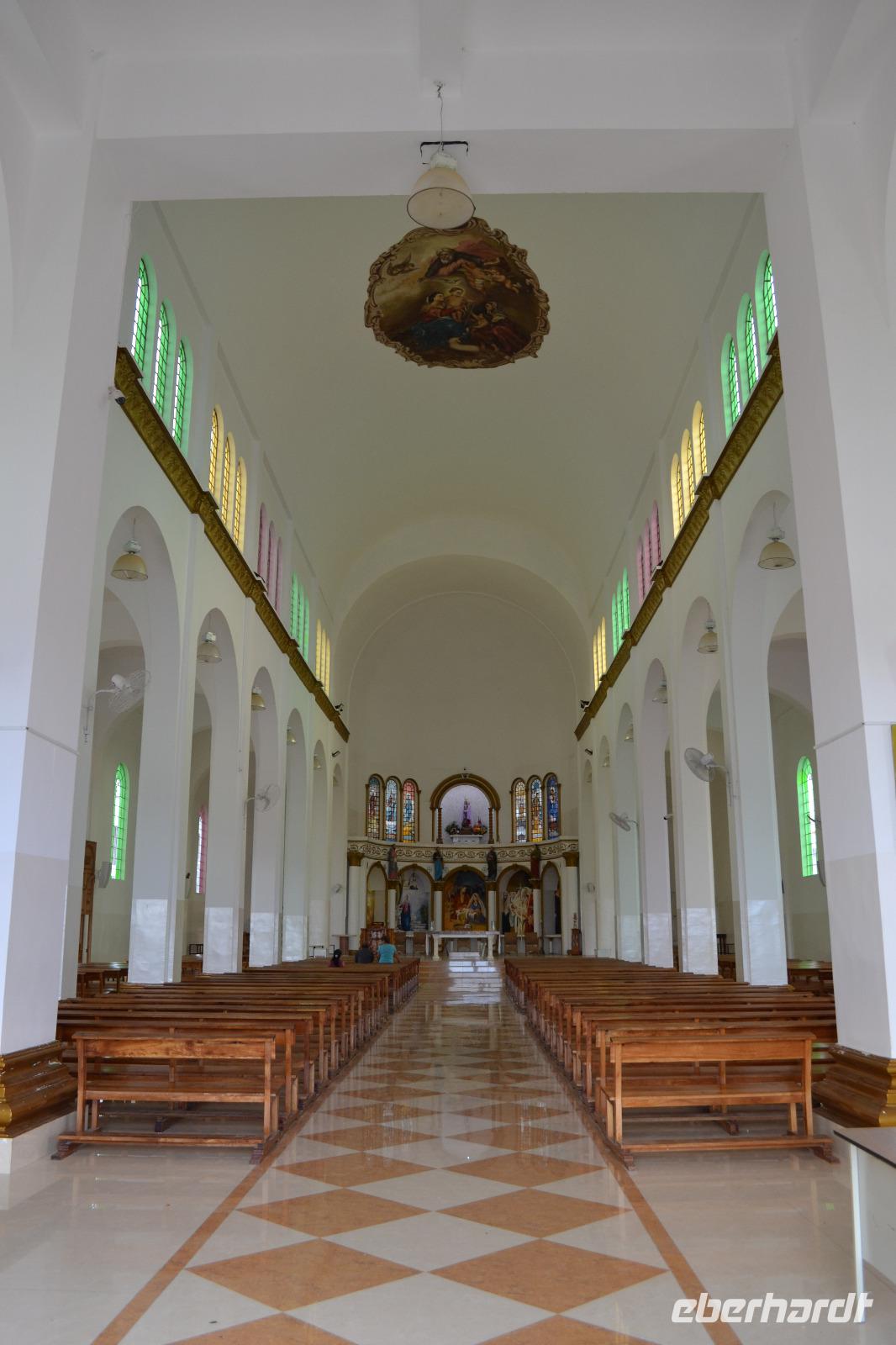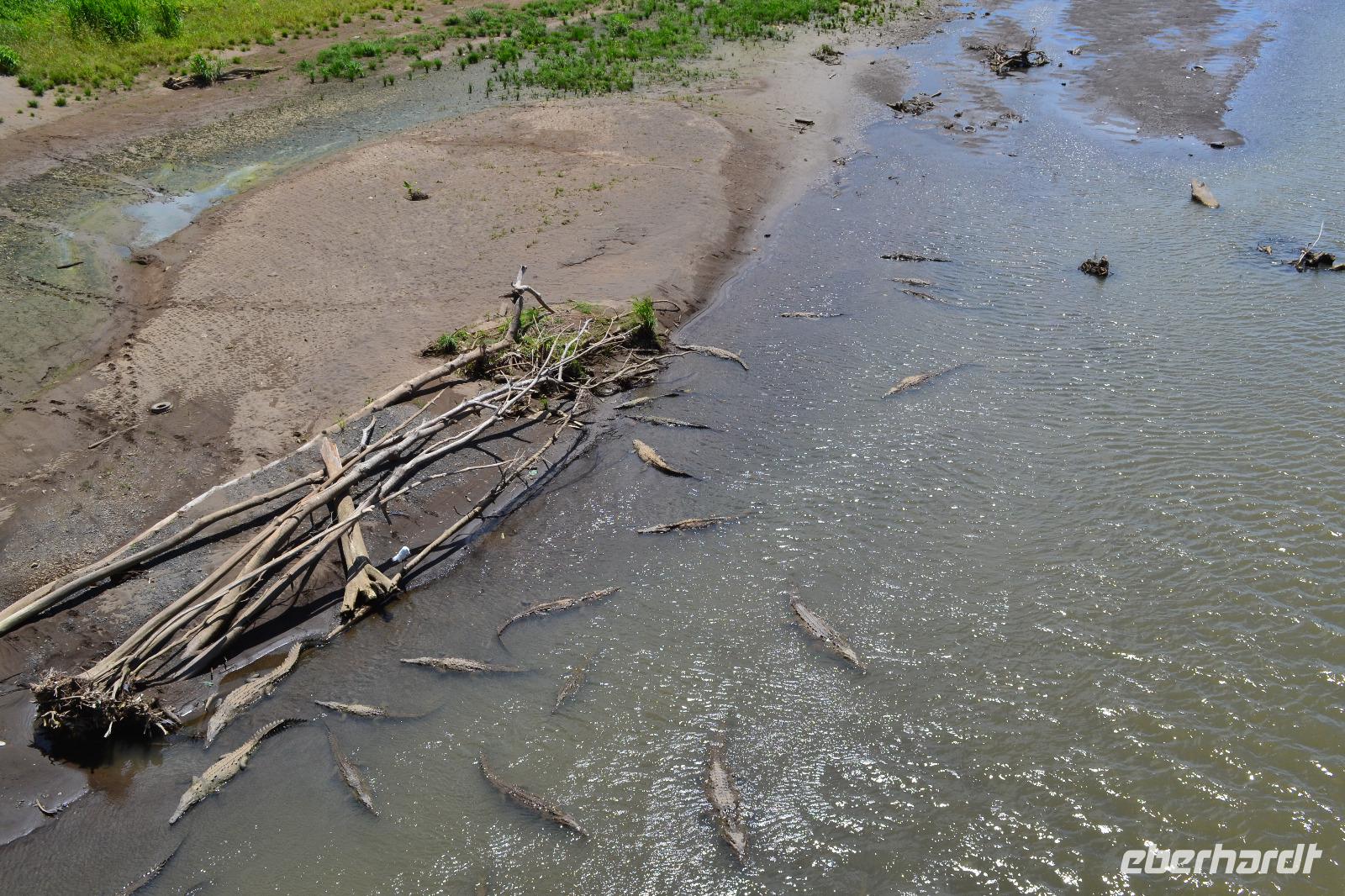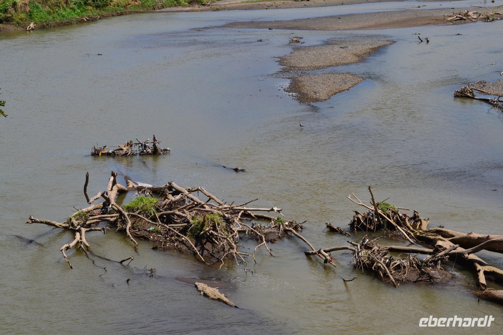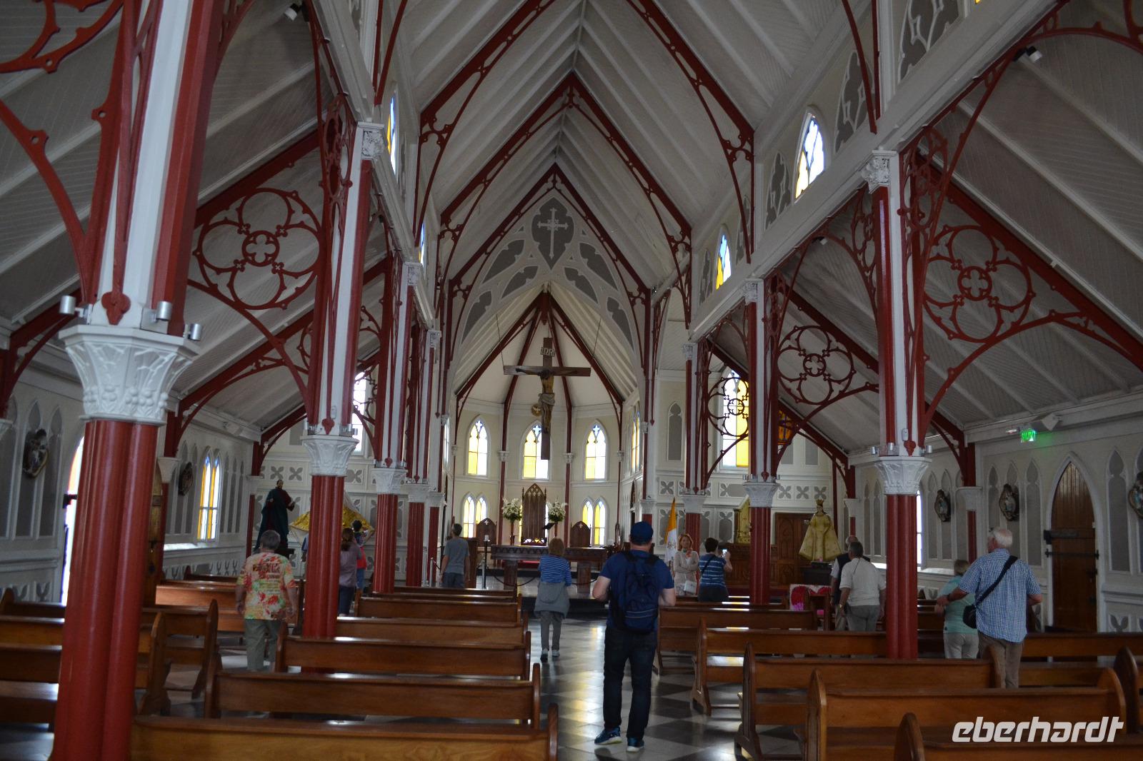 Bereits vom Schiff aus können wir die grüne Küste Costa Ricas bewundern. Was für ein Kontrast zu der kargen und trockenen Wüstenlandschaft in Peru und in Chile! Regnen tut es hier allerdings während der Wintermonate (also jetzt) auch nicht. Dafür ist es noch einmal deutlich heißer und schwüler geworden. Gut, dass uns unsere örtliche Reiseleiterin Ursula in den Carara-Nationalpark entführt, wo wir unter dem dichten Blätterdach fast immer Schatten finden. Sehr anschaulich erklärt sie uns die Kreisläufe, pflanzlichen und tierischen Bewohner des Waldes. Leider können wir die berühmten roten Aras nur hören, aber nicht sehen. Dafür treffen wir auf ganz viele Ameisenkolonien, ja Millionen von Ameisen, in verschiedenen Varianten, vor allem Armeeameisen und Blattschneideameisen. Wir können auch ein Wildhuhn und ein Nagetier im dichten Unterholz aufspüren. Kurz vor dem Mittagessen mit lokalen Spezialitäten soll dann unser Reisebegleiter (also ich) an Krokodile verfüttert werden. Doch ich rieche den Braten und lasse mich auf Angebote, die Krokodile von Nahem zu zählen und ihre Länge zu vermessen, nicht ein. Von der Tarcoles-Brücke kann ich jedoch mindestens 30 Krokodile erspähen. (Die Kenntnis der Größenordnung reicht einem Physiker ja erstmal aus.) Träge liegen sie unten im Fluss. In Wirklichkeit warten sie natürlich aber auf unvorsichtige Touristen, die sich zu weit über die Brücke lehnen, um vielleicht doch noch ein besseres Foto zu schießen (oder weniger erfahrene Reisebegleiter, die auf so ein unmoralisches Angebot hereinfallen). Heute gehen die Krokodile also erstmal leer aus, während wir wieder einmal gut gesättigt zum Schiff zurückfahren. Uns bleiben nun noch etwas mehr als zwei Stunden, um Puntarenas, die ehemals wichtigste Hafenstadt Costa Ricas, selbst zu Fuss zu erkunden.