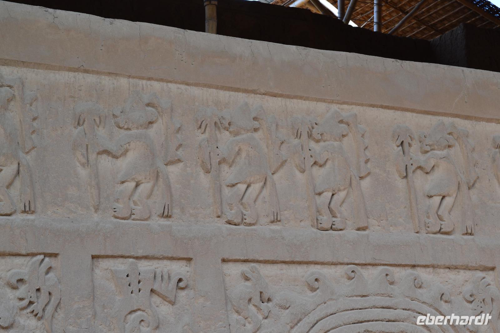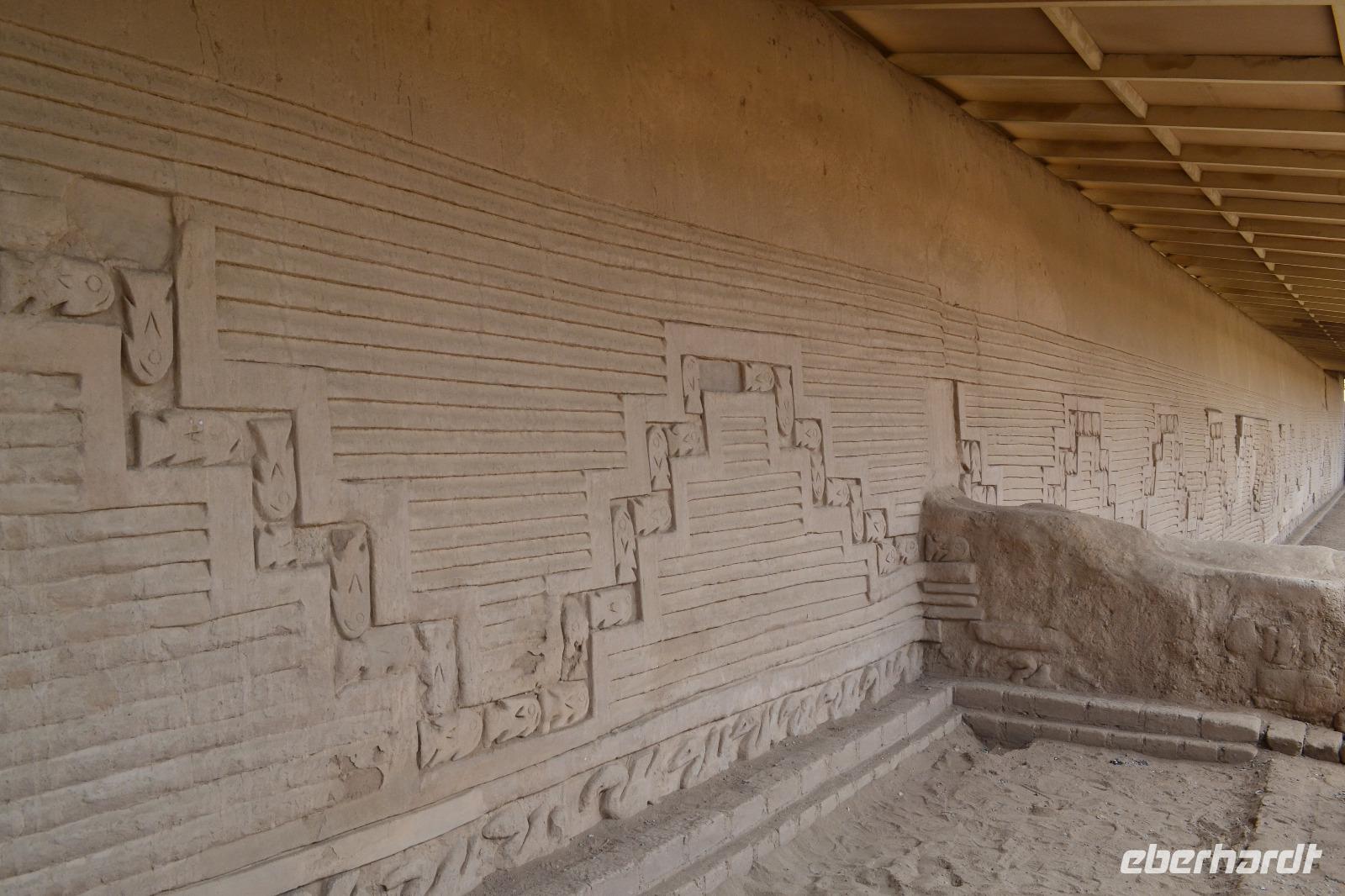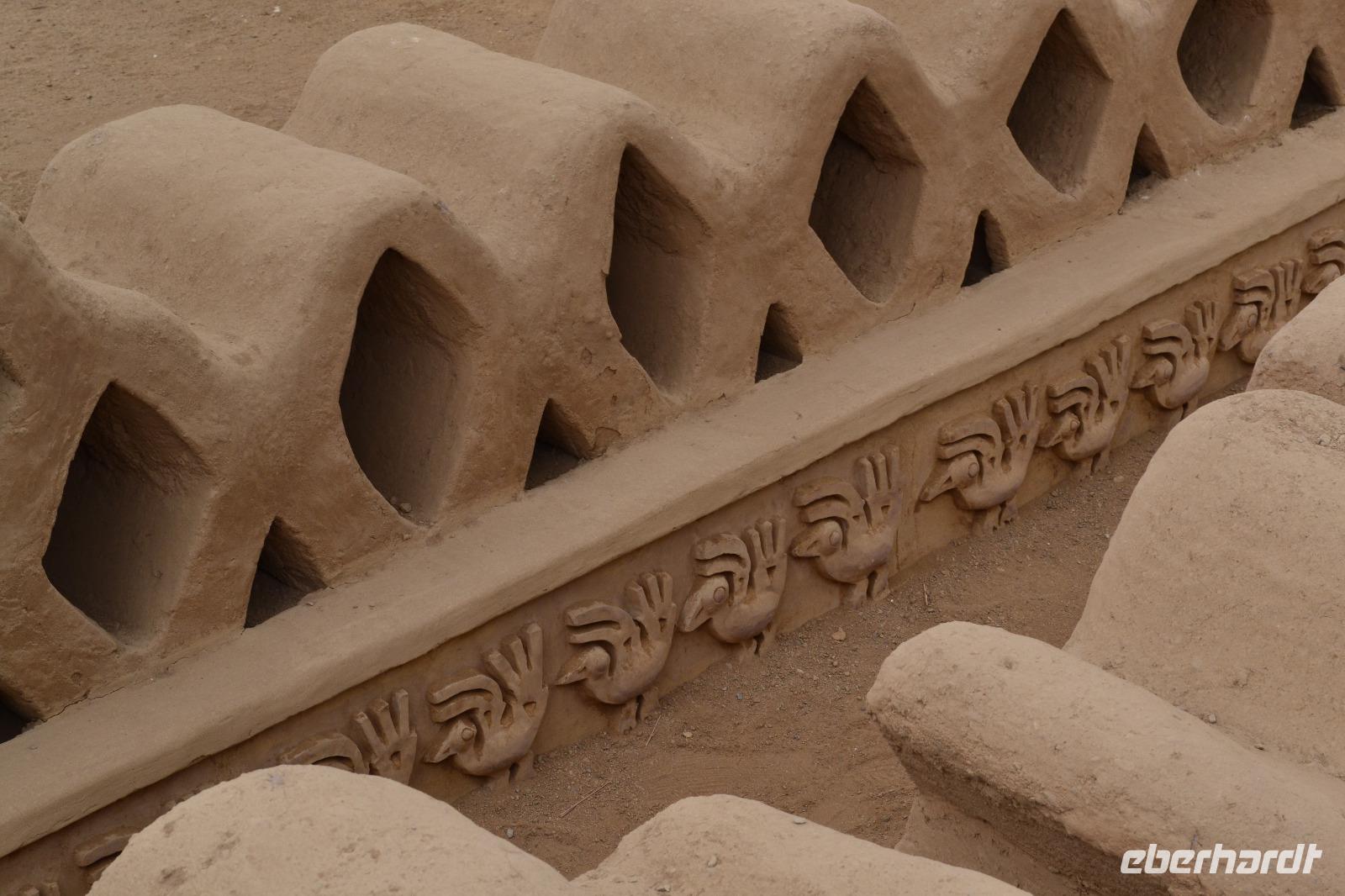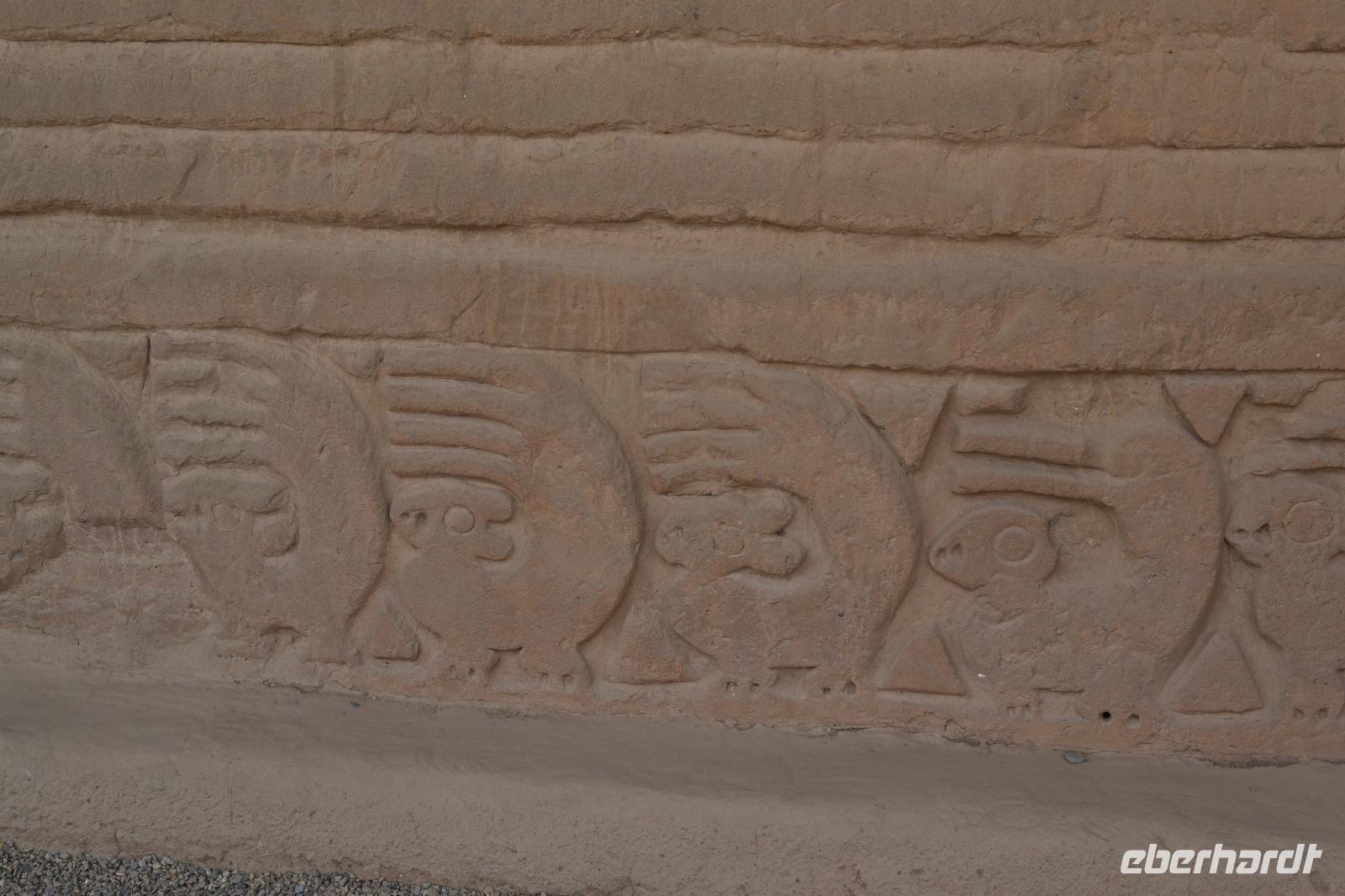 Unseren zweiten Hafen in Peru hätten wir fast verpasst, denn bei der Einfahrt nach Salaverry war es so neblig, dass selbst der Kapitän oben auf der Brücke nichts gesehen hat, wie er später noch zugeben sollte. Doch der Nebel lichtet sich allmählich und Sandwüste und die Anden tauchen wieder vor uns auf. Trujillo, die heute viertgrößte Stadt in Peru, wurde von den Spaniern 1535 gegründet und nach dem Geburtsort Francisco Pizzaros benannt. Für uns als Touristen ist jedoch vor allem die Ruinenstadt Chan Chan interessant, die 1986 UNESCO-Weltkulturerbe wurde. Sie erstreckt sich auch heute noch über eine Fläche von 28 km² und war die Hauptstadt des Chimú-Reiches. Zu ihrer Blütezeit lebten hier angeblich 60.000 Menschen (manche Quellen sprechen sogar von bis zu 100.000) - damals die größte Einwohnerzahl einer Stadt in ganz Südamerika. Auf unserem Ausflug besichtigen wir einen der insgesamt neun autonomen Bezirke, in die die Stadt untergliedert war. An einen riesigen Hauptplatz schließen sich verschiedene Bauwerke an, die unter anderem als Vorratslager und Tempel dienten. Die unterschiedlichen Reliefs an den Wänden deuten dabei auf die ursprüngliche Funktion des Raumes hin oder erzählen die Geschichte der Chimú. Das Volk der Chimú verehrte den Mond als obersten Gott, da er die Macht hatte, die Sonne zu verdecken. Die Stadt wurde letztendlich um 1470 von den Inka belagert und eingenommen, indem der Fluss durch die Oase umgeleitet und die Stadt somit ausgetrocknet wurde. Die Zerstörung der Gebäude ist aber vor allem auf die Ankunft der spanischen Conquistadoren zurückzuführen. Auf dem Stadtgebiet von Trujillo liegt der Huaco del Dragon, der Drachentempel, der unser zweites Ziel darstellt. Seine Wände sind mit Abbildungen von Kriegern und Schlangen verziert. Letztere wurden auch als Drachen fehlinterpretiert, worauf der Name letztendlich zurückgeht. Nach diesen interessanten Einblicken in eine Kultur, von der wir im Geschichtsunterricht in Deutschland eigentlich gar nichts erfahren, kehren wir der Hitze den Rücken und wieder auf das Schiff zurück, wo wir auf der Fahrt nach Ecuador einen weiteren schönen Tag auf See genießen.