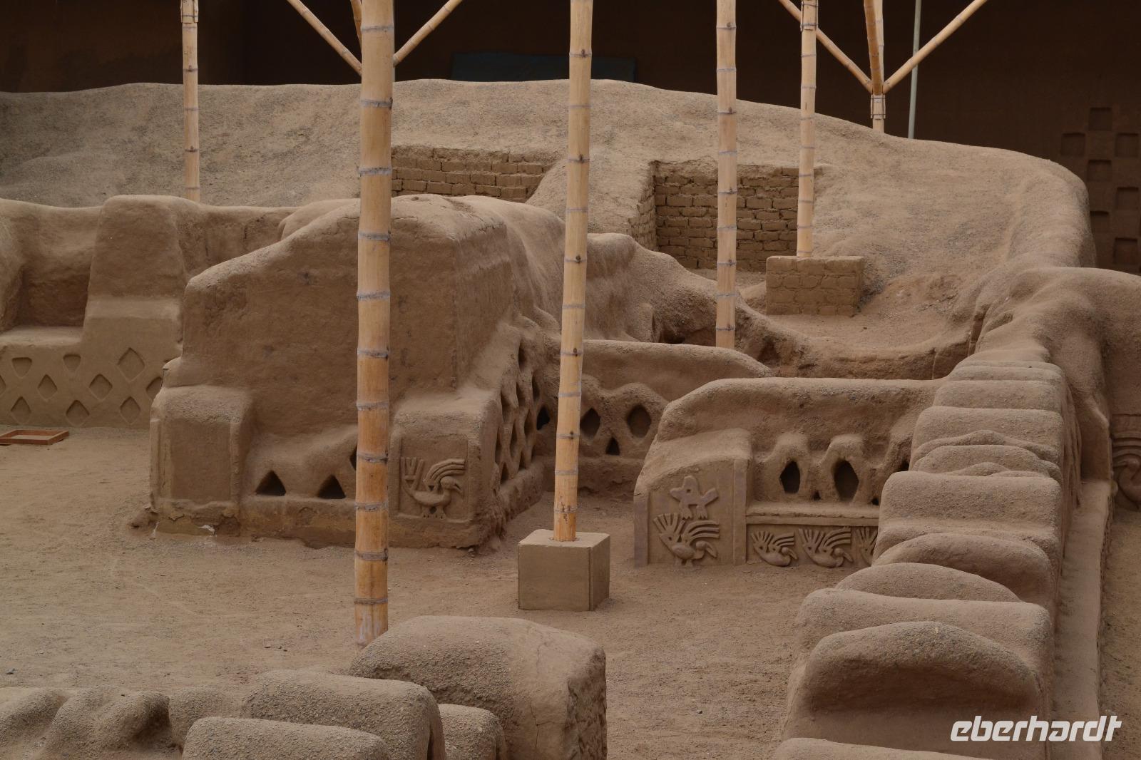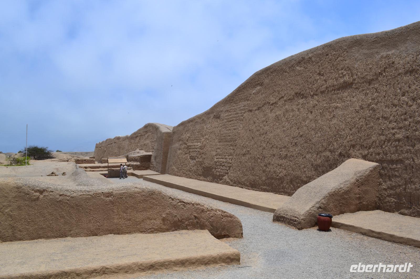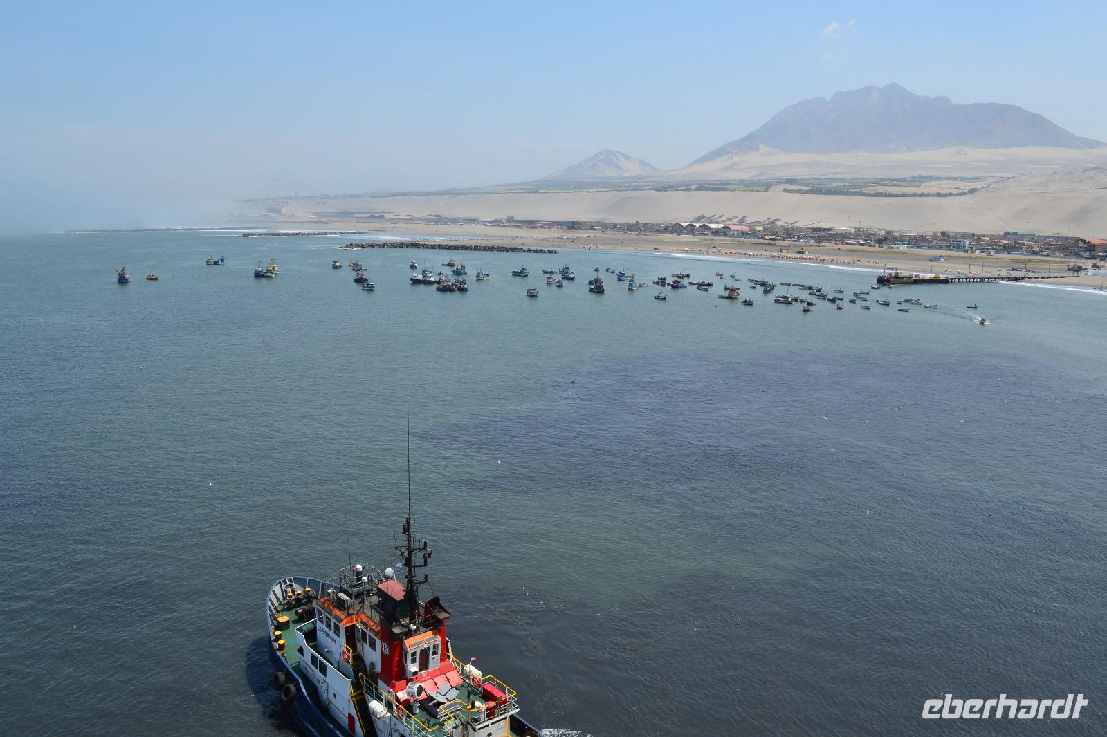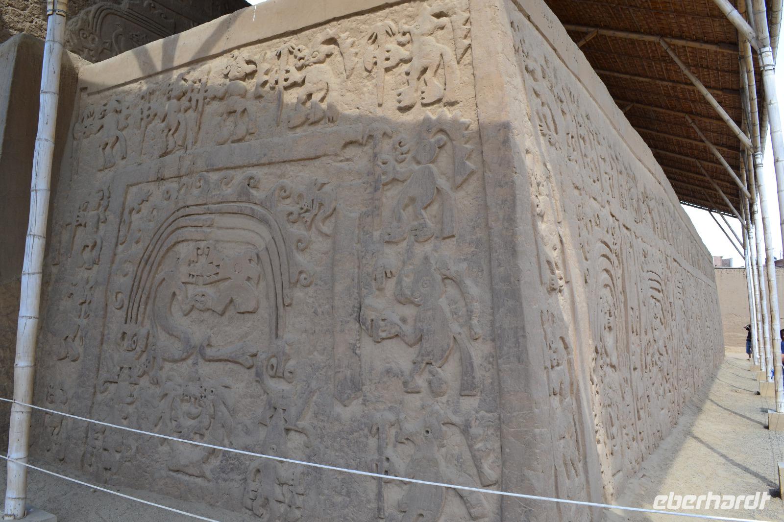 Unseren zweiten Hafen in Peru hätten wir fast verpasst, denn bei der Einfahrt nach Salaverry war es so neblig, dass selbst der Kapitän oben auf der Brücke nichts gesehen hat, wie er später noch zugeben sollte. Doch der Nebel lichtet sich allmählich und Sandwüste und die Anden tauchen wieder vor uns auf. Trujillo, die heute viertgrößte Stadt in Peru, wurde von den Spaniern 1535 gegründet und nach dem Geburtsort Francisco Pizzaros benannt. Für uns als Touristen ist jedoch vor allem die Ruinenstadt Chan Chan interessant, die 1986 UNESCO-Weltkulturerbe wurde. Sie erstreckt sich auch heute noch über eine Fläche von 28 km² und war die Hauptstadt des Chimú-Reiches. Zu ihrer Blütezeit lebten hier angeblich 60.000 Menschen (manche Quellen sprechen sogar von bis zu 100.000) - damals die größte Einwohnerzahl einer Stadt in ganz Südamerika. Auf unserem Ausflug besichtigen wir einen der insgesamt neun autonomen Bezirke, in die die Stadt untergliedert war. An einen riesigen Hauptplatz schließen sich verschiedene Bauwerke an, die unter anderem als Vorratslager und Tempel dienten. Die unterschiedlichen Reliefs an den Wänden deuten dabei auf die ursprüngliche Funktion des Raumes hin oder erzählen die Geschichte der Chimú. Das Volk der Chimú verehrte den Mond als obersten Gott, da er die Macht hatte, die Sonne zu verdecken. Die Stadt wurde letztendlich um 1470 von den Inka belagert und eingenommen, indem der Fluss durch die Oase umgeleitet und die Stadt somit ausgetrocknet wurde. Die Zerstörung der Gebäude ist aber vor allem auf die Ankunft der spanischen Conquistadoren zurückzuführen. Auf dem Stadtgebiet von Trujillo liegt der Huaco del Dragon, der Drachentempel, der unser zweites Ziel darstellt. Seine Wände sind mit Abbildungen von Kriegern und Schlangen verziert. Letztere wurden auch als Drachen fehlinterpretiert, worauf der Name letztendlich zurückgeht. Nach diesen interessanten Einblicken in eine Kultur, von der wir im Geschichtsunterricht in Deutschland eigentlich gar nichts erfahren, kehren wir der Hitze den Rücken und wieder auf das Schiff zurück, wo wir auf der Fahrt nach Ecuador einen weiteren schönen Tag auf See genießen.