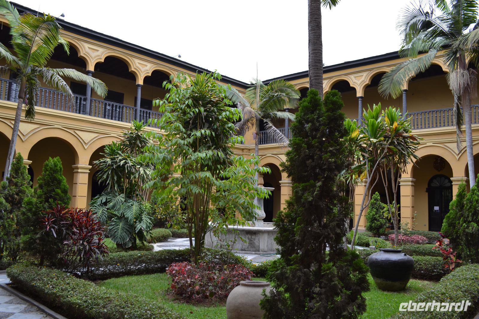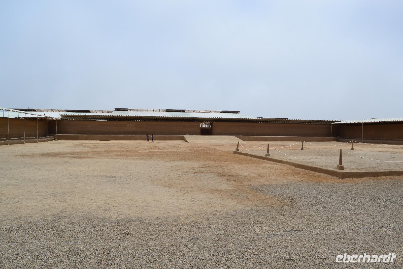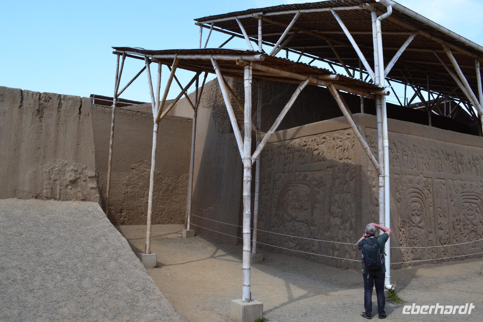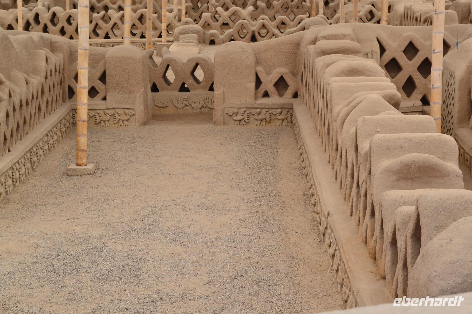 Unseren zweiten Hafen in Peru hätten wir fast verpasst, denn bei der Einfahrt nach Salaverry war es so neblig, dass selbst der Kapitän oben auf der Brücke nichts gesehen hat, wie er später noch zugeben sollte. Doch der Nebel lichtet sich allmählich und Sandwüste und die Anden tauchen wieder vor uns auf. Trujillo, die heute viertgrößte Stadt in Peru, wurde von den Spaniern 1535 gegründet und nach dem Geburtsort Francisco Pizzaros benannt. Für uns als Touristen ist jedoch vor allem die Ruinenstadt Chan Chan interessant, die 1986 UNESCO-Weltkulturerbe wurde. Sie erstreckt sich auch heute noch über eine Fläche von 28 km² und war die Hauptstadt des Chimú-Reiches. Zu ihrer Blütezeit lebten hier angeblich 60.000 Menschen (manche Quellen sprechen sogar von bis zu 100.000) - damals die größte Einwohnerzahl einer Stadt in ganz Südamerika. Auf unserem Ausflug besichtigen wir einen der insgesamt neun autonomen Bezirke, in die die Stadt untergliedert war. An einen riesigen Hauptplatz schließen sich verschiedene Bauwerke an, die unter anderem als Vorratslager und Tempel dienten. Die unterschiedlichen Reliefs an den Wänden deuten dabei auf die ursprüngliche Funktion des Raumes hin oder erzählen die Geschichte der Chimú. Das Volk der Chimú verehrte den Mond als obersten Gott, da er die Macht hatte, die Sonne zu verdecken. Die Stadt wurde letztendlich um 1470 von den Inka belagert und eingenommen, indem der Fluss durch die Oase umgeleitet und die Stadt somit ausgetrocknet wurde. Die Zerstörung der Gebäude ist aber vor allem auf die Ankunft der spanischen Conquistadoren zurückzuführen. Auf dem Stadtgebiet von Trujillo liegt der Huaco del Dragon, der Drachentempel, der unser zweites Ziel darstellt. Seine Wände sind mit Abbildungen von Kriegern und Schlangen verziert. Letztere wurden auch als Drachen fehlinterpretiert, worauf der Name letztendlich zurückgeht. Nach diesen interessanten Einblicken in eine Kultur, von der wir im Geschichtsunterricht in Deutschland eigentlich gar nichts erfahren, kehren wir der Hitze den Rücken und wieder auf das Schiff zurück, wo wir auf der Fahrt nach Ecuador einen weiteren schönen Tag auf See genießen.