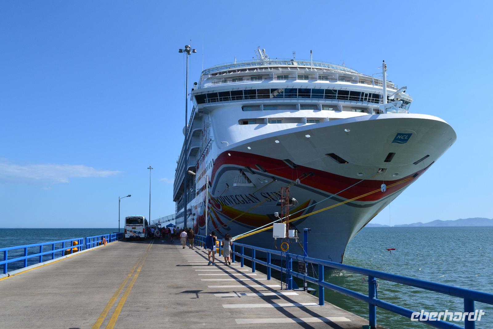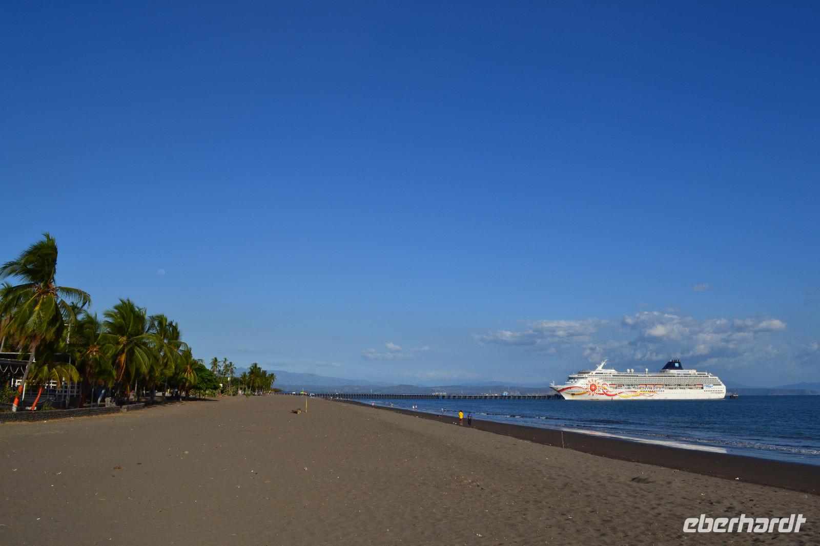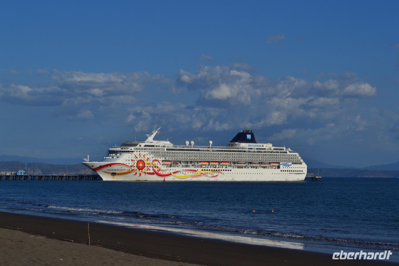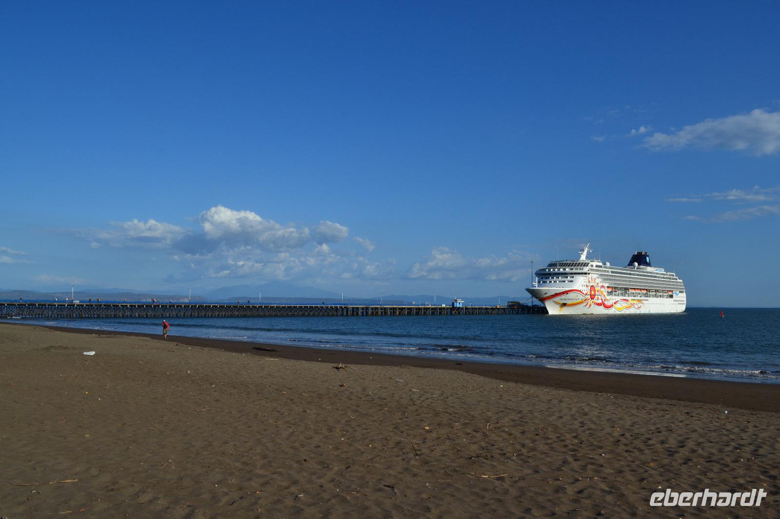 Ecuador ist das dritte südamerikanische Land auf unserer Reise, das wir besuchen. Die Hafenstadt Manta an der Pazifikküste gilt als die Thunfischhauptstadt der Welt. Während wir im Hafen liegen, wird tiefgefrorener Thunfisch aus einem Schiff entladen, das der Norwegian Sun gegenüber liegt, was den ganzen Tag dauert. Wer isst den ganzen Thunfisch nur? 2016 gab es in Ecuador ein Erdbeben, bei dem 400 Menschen starben. Auf der Fahrt durch Manta können wir immer noch Schäden sehen. Während des Ausflugs sollen wir vor allem mit einheimischen Produkten vertraut gemacht werden, die auch international von Bedeutung sind. So gilt die Stadt Montecristi unweit von Manta, die wir zuerst anfahren, als Geburtsort des Panama-Hutes, der von den Franzosen unter falschem Namen vermarktet wurde. Wir bekommen erklärt und vorgeführt, wie diese Hüte auch heute noch in mühevoller Handarbeit hergestellt werden. Anschließend besuchen wir ein kleines Familienunternehmen, in dem aus Agavenfasern Säcke für Kaffeebohnen produziert werden. Zurück in Manta lernen wir schließlich, wie aus Steinnüssen der Tagua-Palme Knöpfe hergestellt werden. Auch zur Herstellung von Schmuck wird die Steinnuss gern genutzt, die nach dem Trocknen so hart wie Knochen ist, und die Farbe von Elfenbein hat. Leider merkt man ein bisschen, dass sich die (englischsprachige) Tour vor allem an amerikanische Touristen wendet, so dass dem Erwerb von Souvenirs für unseren Geschmack ein zu großer Platz eingeräumt wird. Zum Abschluss des Schiffsausflugs geht es ins ethnologische Museum in der Innenstadt, das ein bisschen die Geschichte der Einwanderung veranschaulicht. Einige Gäste nutzen den Nachmittag für einen Strandbesuch, denn unter inländischen Touristen ist Manta vor allem für seine schönen Strände bekannt, die sich gut zum Surfen eignen. Die 6. Südamerikanische Windsurfing-Meisterschaft fand hier statt; auch Kitesurfing ist populär. Am späten Abend überqueren wir dann auch den namensgebenden Äquator und erreichen auf der Fahrt nach Costa Rica wieder die Nordhalbkugel. Doch bis Puntarenas liegt erstmal wieder ein schöner Seetag bei strahlendem Sonnenschein vor uns.