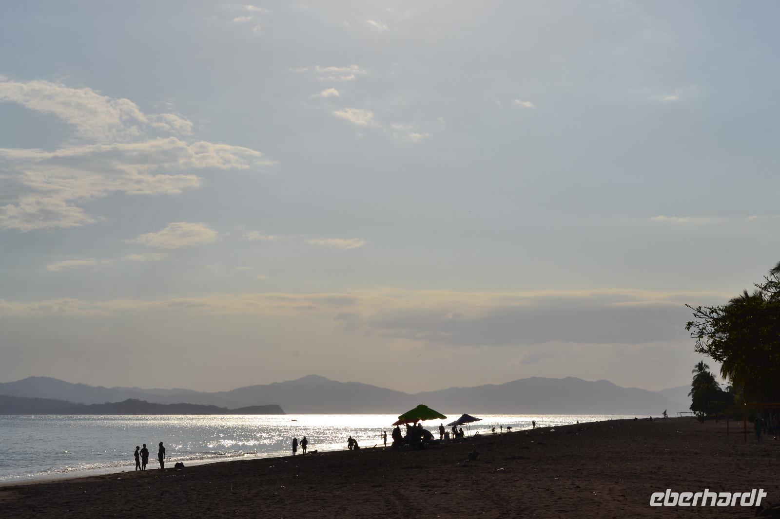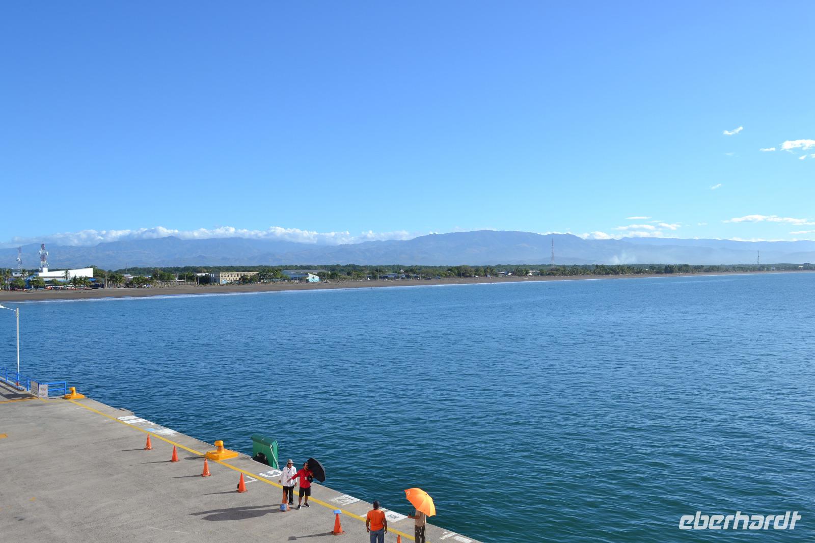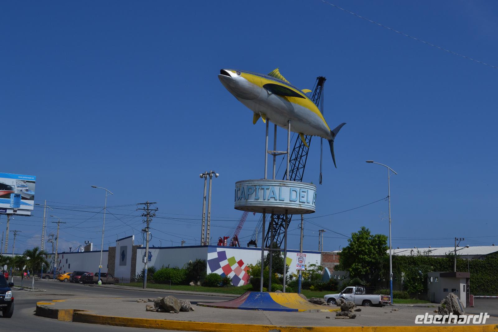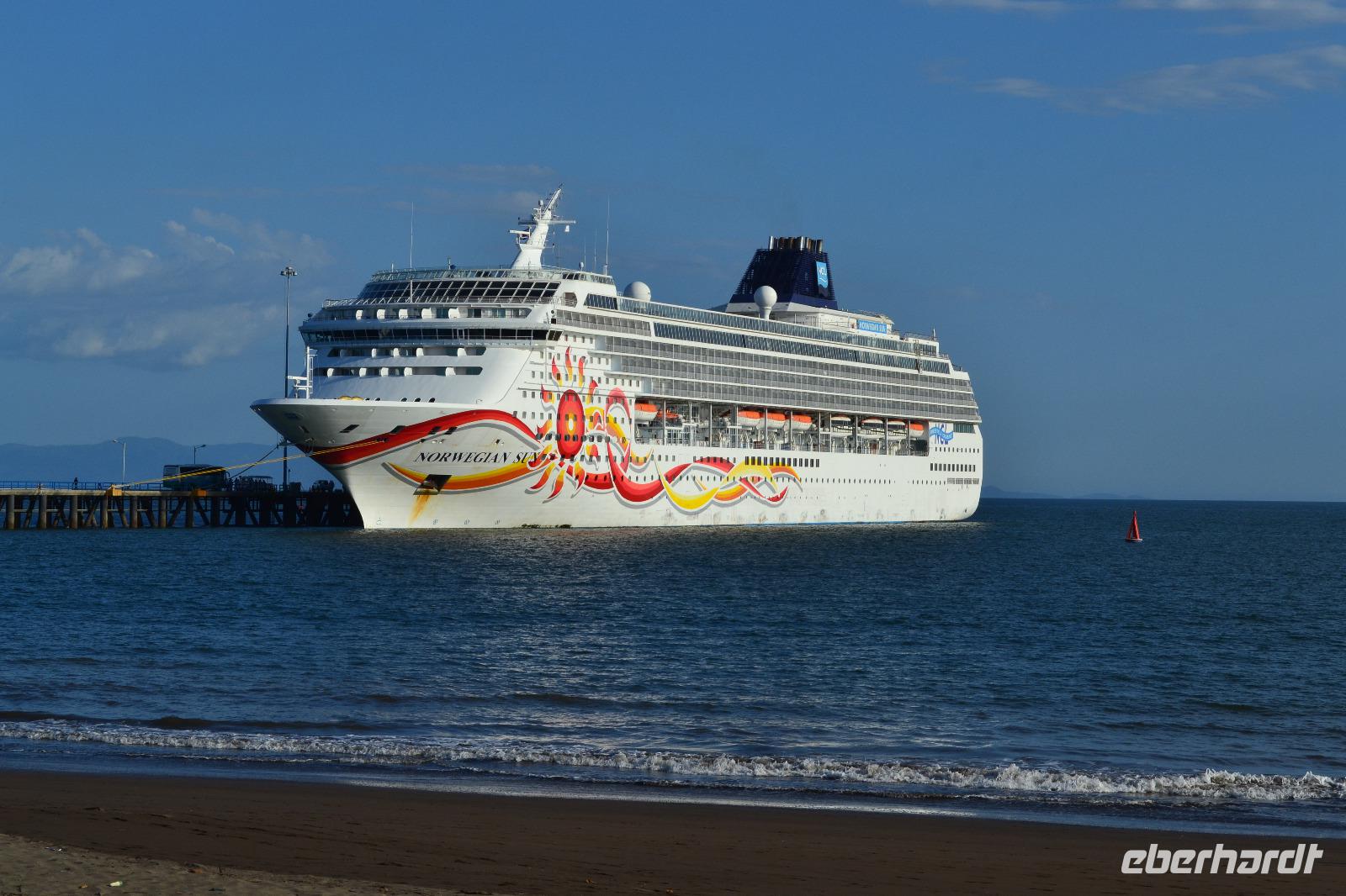 Ecuador ist das dritte südamerikanische Land auf unserer Reise, das wir besuchen. Die Hafenstadt Manta an der Pazifikküste gilt als die Thunfischhauptstadt der Welt. Während wir im Hafen liegen, wird tiefgefrorener Thunfisch aus einem Schiff entladen, das der Norwegian Sun gegenüber liegt, was den ganzen Tag dauert. Wer isst den ganzen Thunfisch nur? 2016 gab es in Ecuador ein Erdbeben, bei dem 400 Menschen starben. Auf der Fahrt durch Manta können wir immer noch Schäden sehen. Während des Ausflugs sollen wir vor allem mit einheimischen Produkten vertraut gemacht werden, die auch international von Bedeutung sind. So gilt die Stadt Montecristi unweit von Manta, die wir zuerst anfahren, als Geburtsort des Panama-Hutes, der von den Franzosen unter falschem Namen vermarktet wurde. Wir bekommen erklärt und vorgeführt, wie diese Hüte auch heute noch in mühevoller Handarbeit hergestellt werden. Anschließend besuchen wir ein kleines Familienunternehmen, in dem aus Agavenfasern Säcke für Kaffeebohnen produziert werden. Zurück in Manta lernen wir schließlich, wie aus Steinnüssen der Tagua-Palme Knöpfe hergestellt werden. Auch zur Herstellung von Schmuck wird die Steinnuss gern genutzt, die nach dem Trocknen so hart wie Knochen ist, und die Farbe von Elfenbein hat. Leider merkt man ein bisschen, dass sich die (englischsprachige) Tour vor allem an amerikanische Touristen wendet, so dass dem Erwerb von Souvenirs für unseren Geschmack ein zu großer Platz eingeräumt wird. Zum Abschluss des Schiffsausflugs geht es ins ethnologische Museum in der Innenstadt, das ein bisschen die Geschichte der Einwanderung veranschaulicht. Einige Gäste nutzen den Nachmittag für einen Strandbesuch, denn unter inländischen Touristen ist Manta vor allem für seine schönen Strände bekannt, die sich gut zum Surfen eignen. Die 6. Südamerikanische Windsurfing-Meisterschaft fand hier statt; auch Kitesurfing ist populär. Am späten Abend überqueren wir dann auch den namensgebenden Äquator und erreichen auf der Fahrt nach Costa Rica wieder die Nordhalbkugel. Doch bis Puntarenas liegt erstmal wieder ein schöner Seetag bei strahlendem Sonnenschein vor uns.