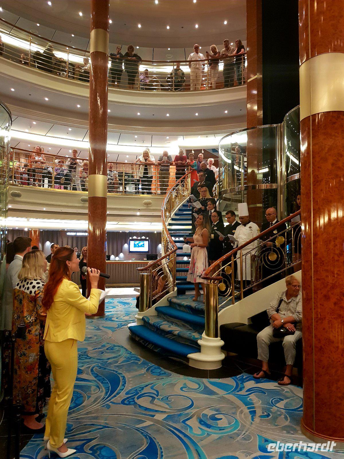 Heute ist unser erster Seetag. Es gibt eigens für unsere Gruppe eine Schiffsbesichtigung durch die öffentlichen Bereiche, um uns ein bisschen mehr Orientierung zu verschaffen. Schließlich hat die Norwegian Sun, die 2001 in Bremerhaven fertiggestellt wurde, eine Länge von 260 Metern. Knapp 2.000 Passagiere finden Platz auf dem Schiff, darunter 958 Crew Mitglieder mit über 64 Nationalitäten.