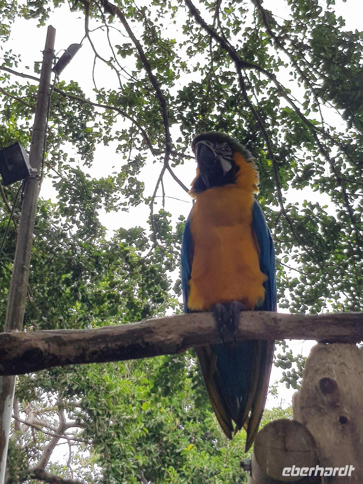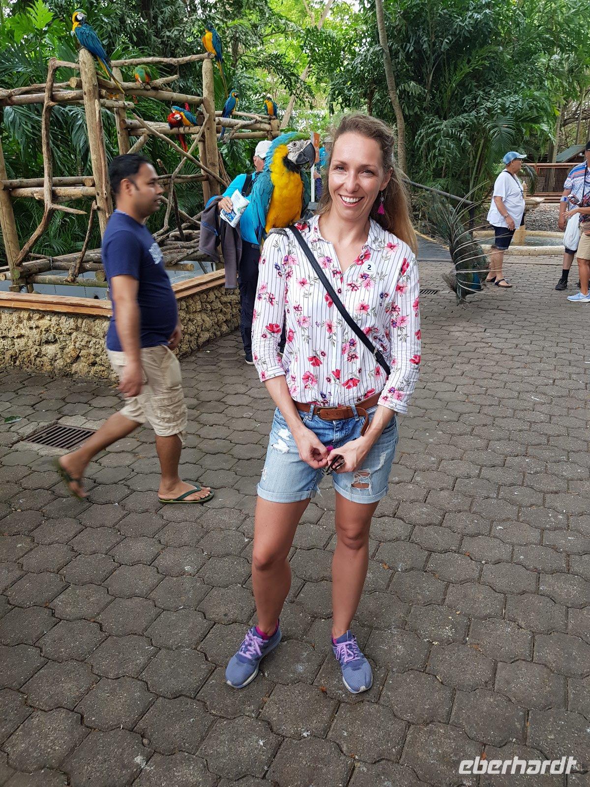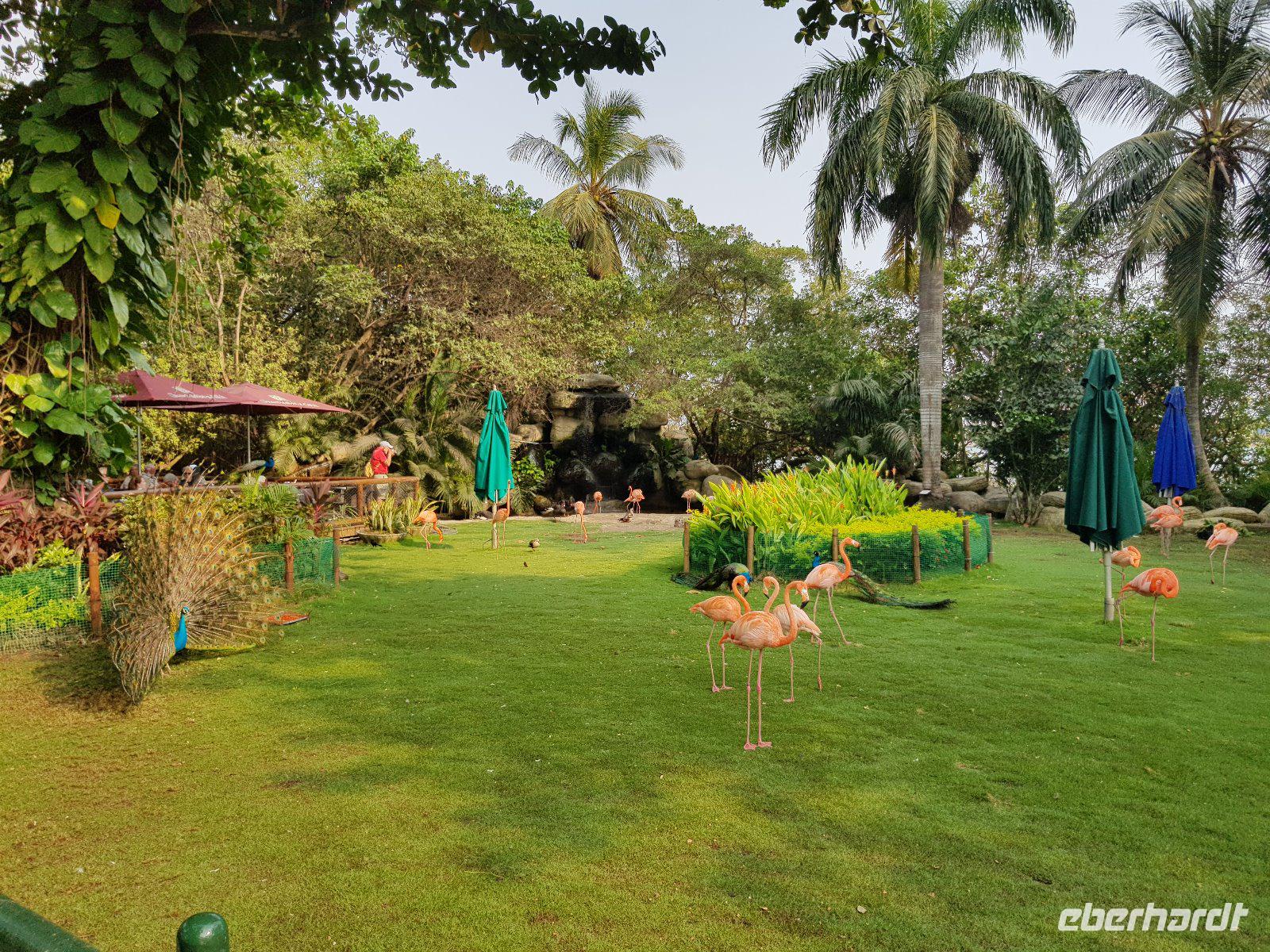 Zurück am Terminal erwartet uns eine kleine grüne Oase. Der Vogelpark liegt direkt am Terminal und es wimmelt hier nur so von wunderschönen Aras, Papageien, Flamingos, kleinen Äffchen, Pfauen und vielen anderen Tieren mehr. Wer noch kein Souvenir aus Cartagena erworben hat, hat hier die letzte Gelegenheit, bevor es zurück zum Schiff geht. Ein schöner Abschluss eines doch sehr anstrengenden und wuseligen Tages in Cartagena.