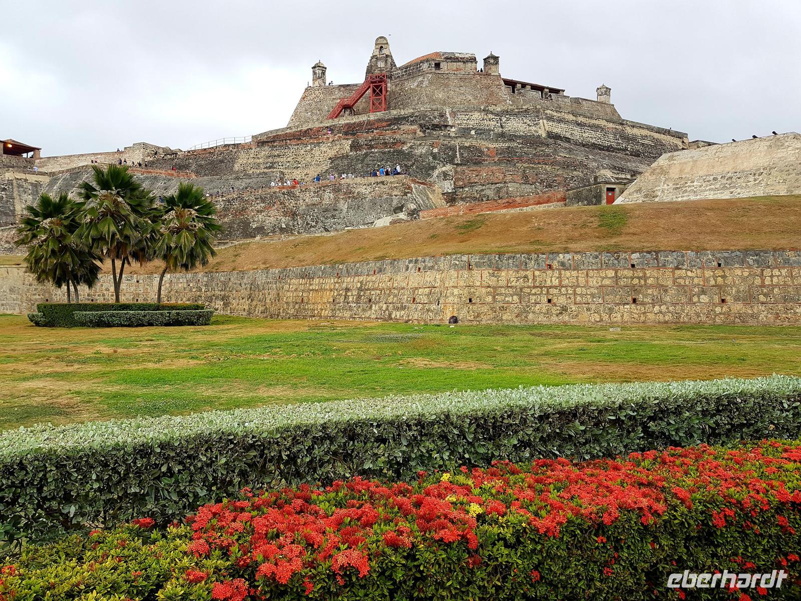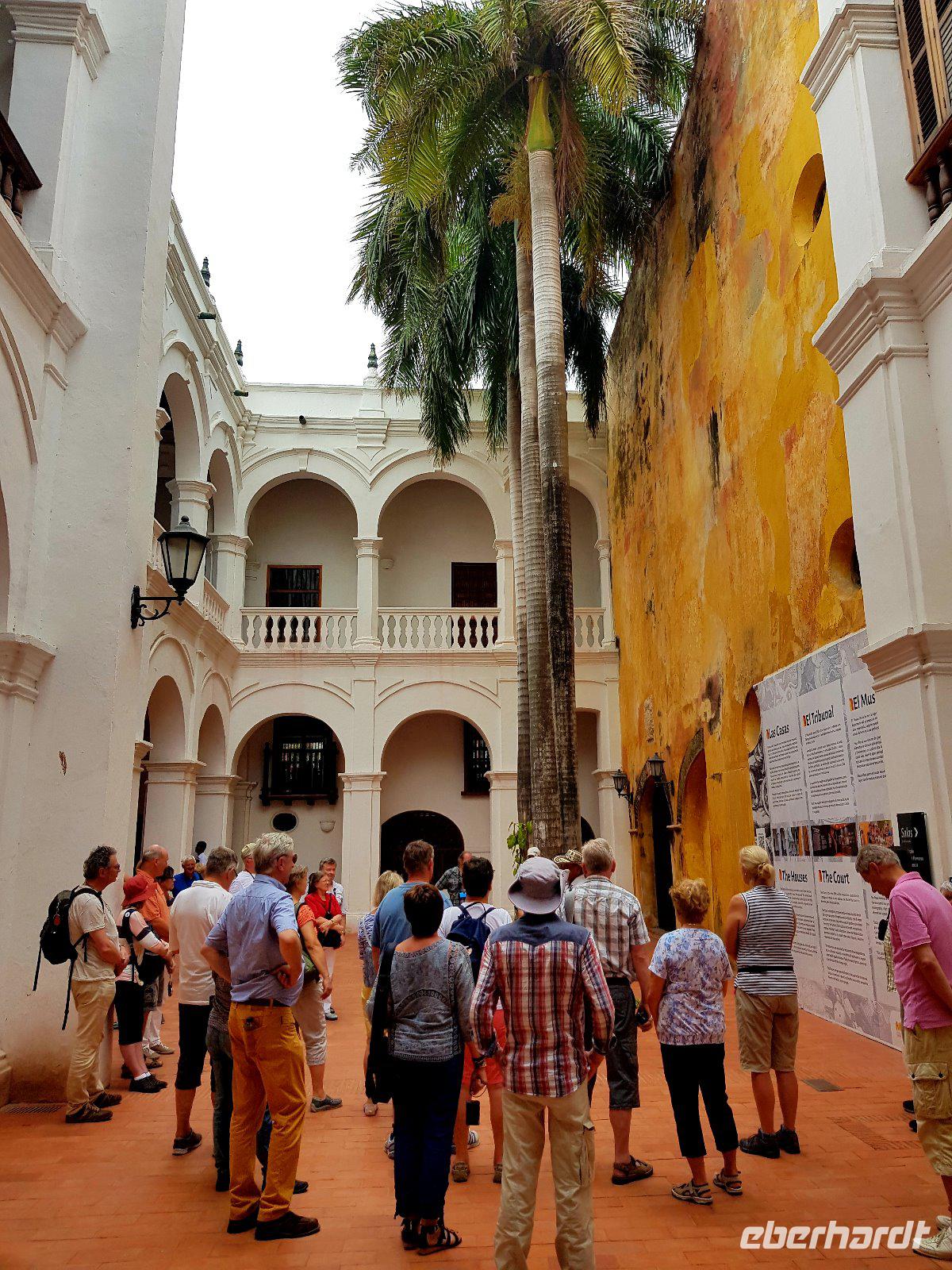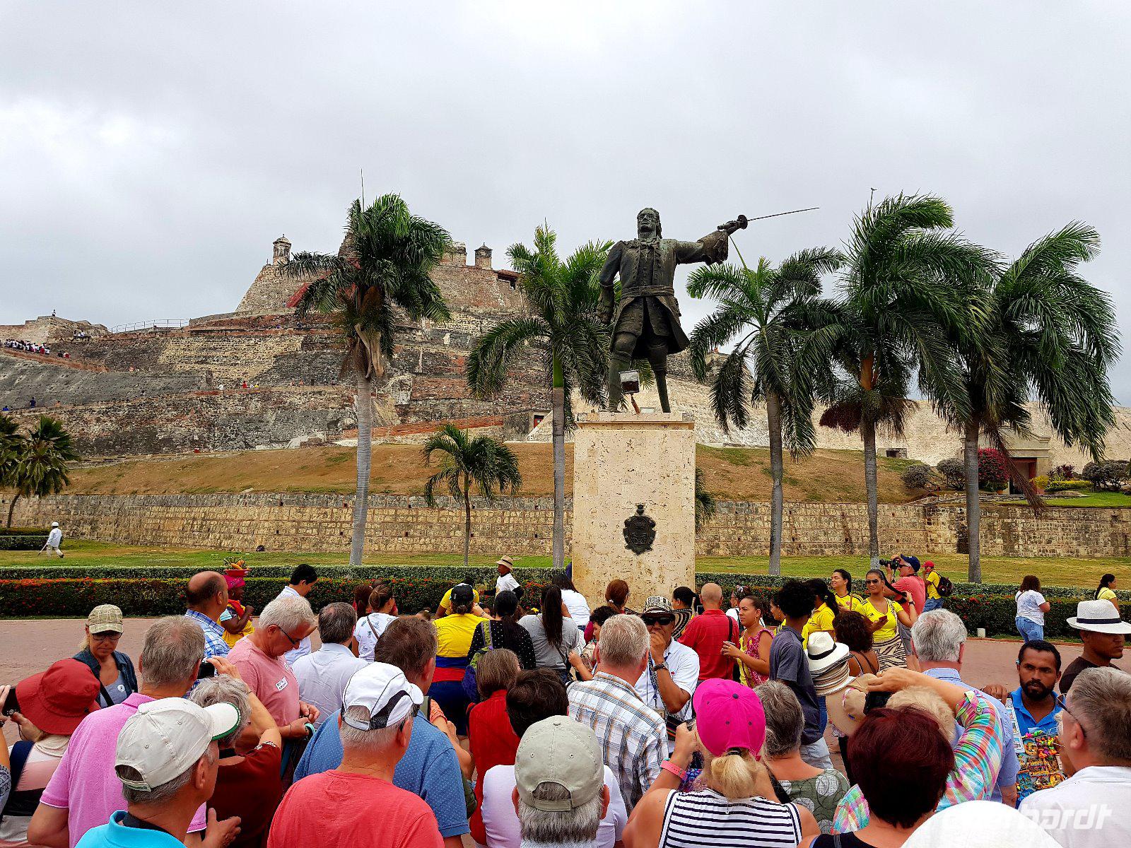 Unseren gebuchten Ausflug starten wir bei der Festung San Felipe de Barajas mit der einarmigen Statue von Don Blas de Lezo. Auf den weiteren Programmpunkten stehen die Einkaufsmeile Las Bovedas, welche früher als Kerker genutzt wurde, ein Spaziergang durch die Altstadt mit Besuch der Kirche Santa Domingo und der wohlgeformten Frauenstatue gestiftet von Fernando Botero, die St. Katharinen Kathedrale mit dem Plaza de Bolivar, wo die Reiterstatue vom selbigen zu finden ist, das Inquisition Museum MUHCA (hier erhalten wir eine anschauliche Vorstellung über Folter und Hexenverbrennung), im Navy Museum haben wir dann eine kolumbianische Folklore Show sehen können und uns geschichtlich über die Piraten Zeit in Cartagena informiert. Anschließend noch schnell die Kirche des San Pedro besichtigen und ein bisschen Freizeit für einen Besuch im Hard Rock Café lassen. Oder einfach nur ein wenig durch die Gassen der schönen Altstadt bummeln.