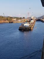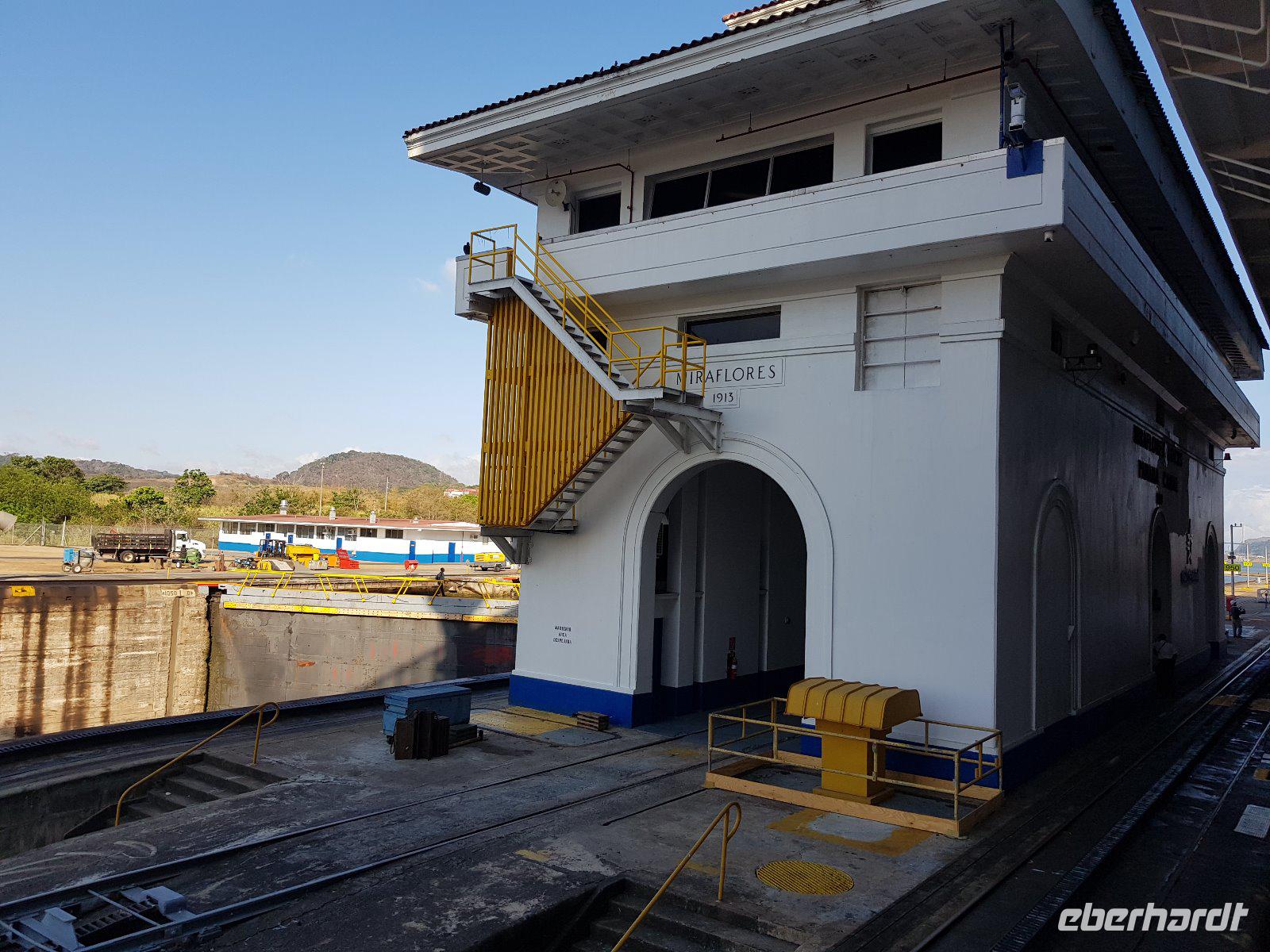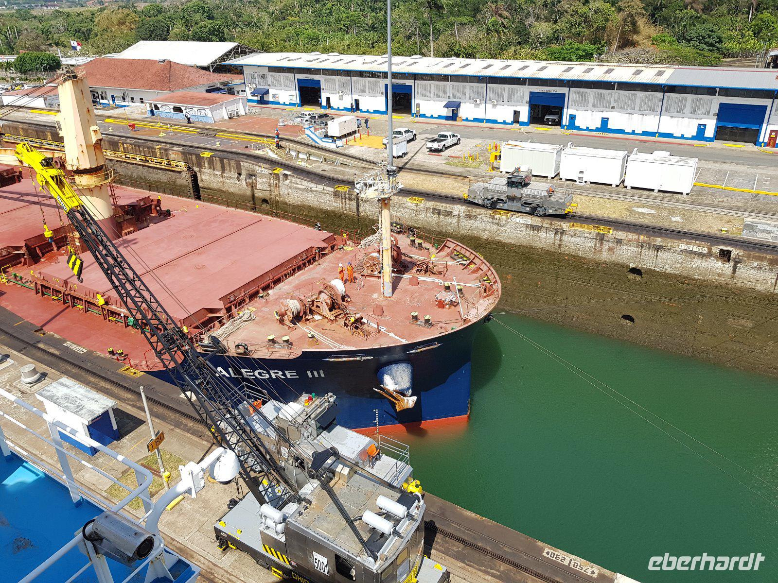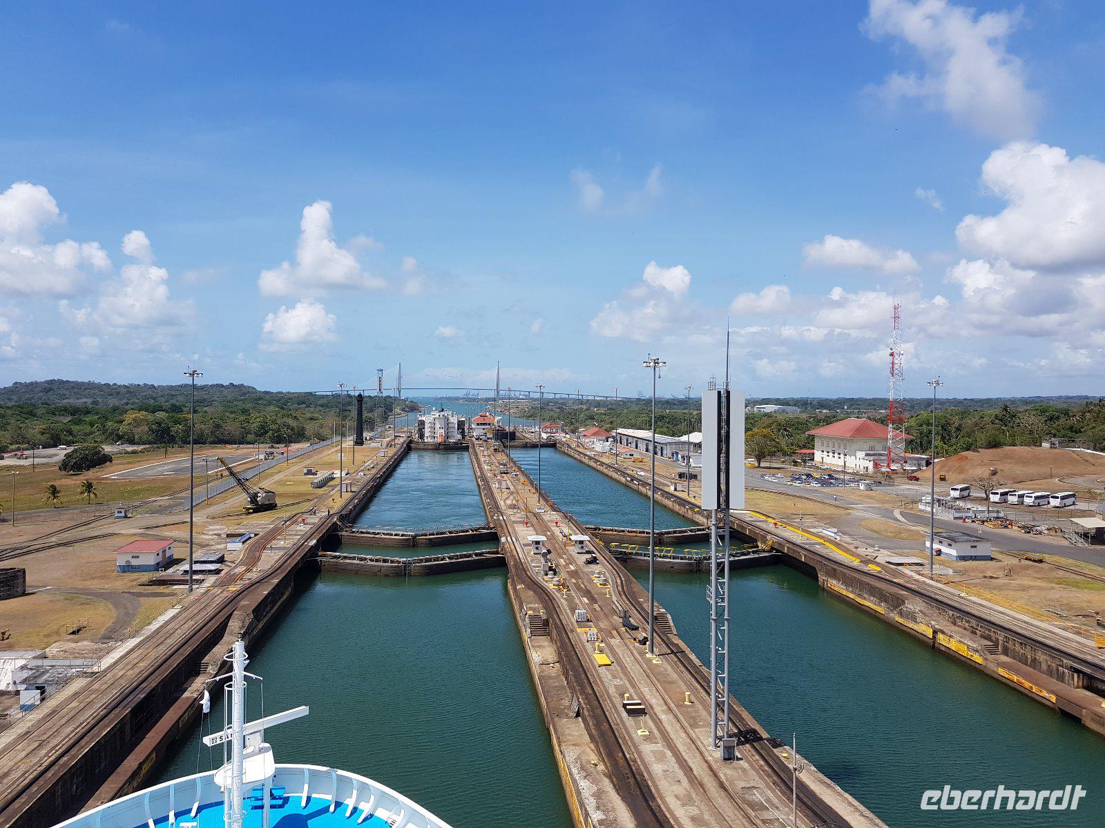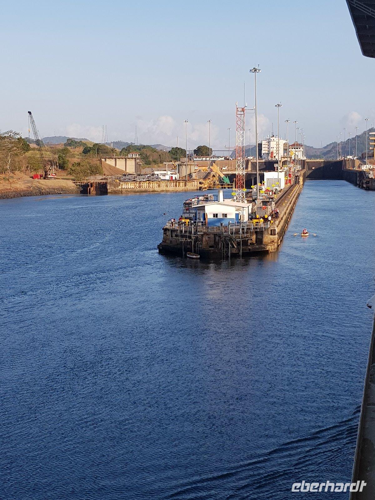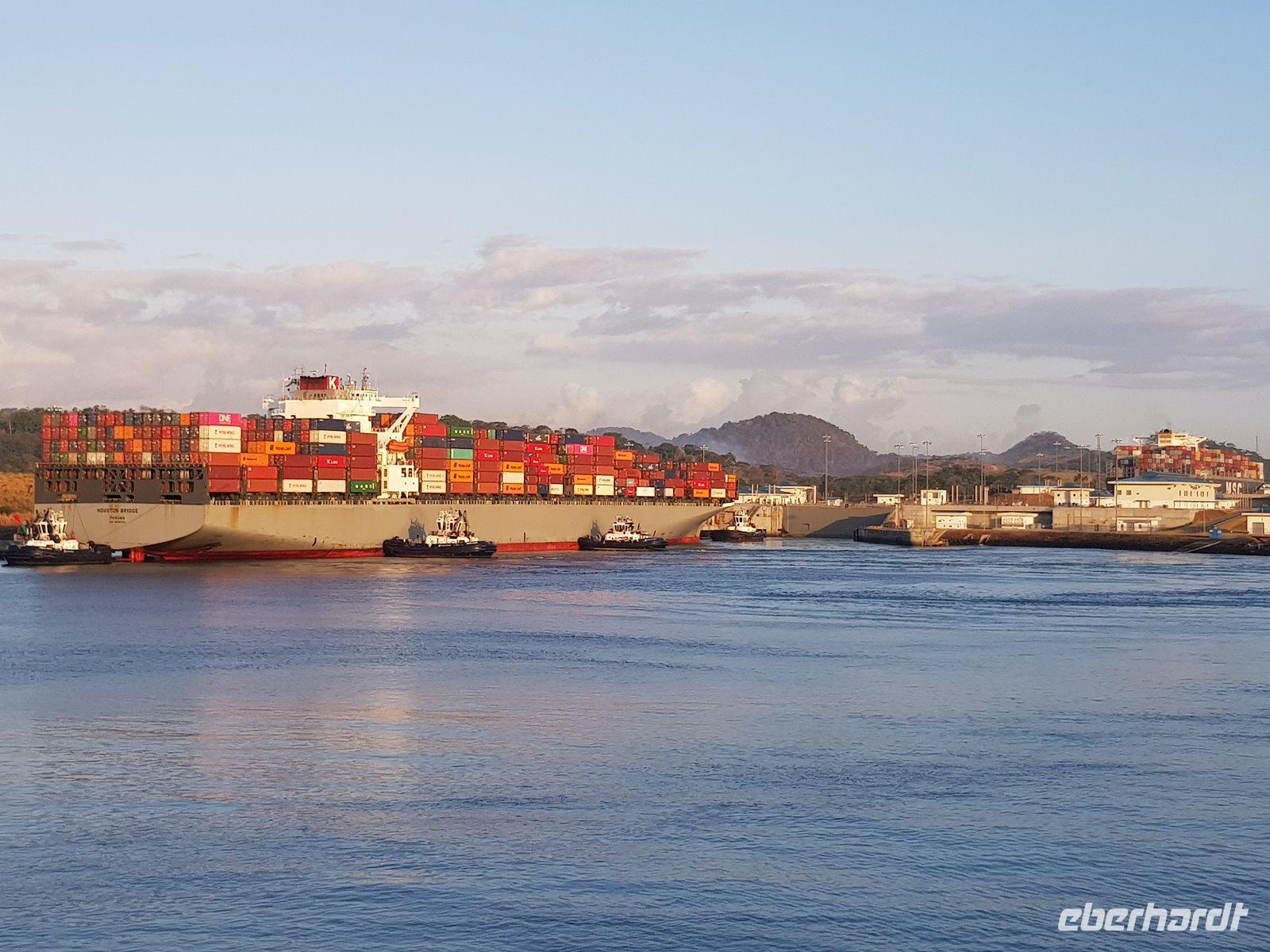 Am Ende des Gatun Sees befindet sich die letzte Schleuse, die sogenannte Gatun Schleuse. Wir müssen hier ein wenig warten, da vor uns bereits ein Containerschiff in die erste Kammer gefahren ist. Wenn dieses sich in der zweiten von drei Kammern befindet, dürfen wir auch in die erste Kammer einfahren. Wir benutzen die alte Schleuse aus dem Jahr 1914. Neben uns gibt es bereits die neue Schleuse aus 2016. Im Vergleich: Unsere Schleuse hat eine Breite von anfangs 33,5m (erste Kammer) und 32,3m (zweite Kammer). Die Fahrrinnentiefe beträgt 12,8m. Die neue Schleuse erbaut für die Panmaxschiffe hat eine Breite von 55m und erlaubt einen Tiefgang von 18,3m. Der Bau des neuen Kanals begann am 3. September 2007 und wurde am 26. Juni 2016 fertiggestellt. Durch den neuen Kanal können nun doppelt so große Schiffe fahren, die gebaut wurden, um die steigenden Mengennachfrage am Weltmarkt decken zu können.