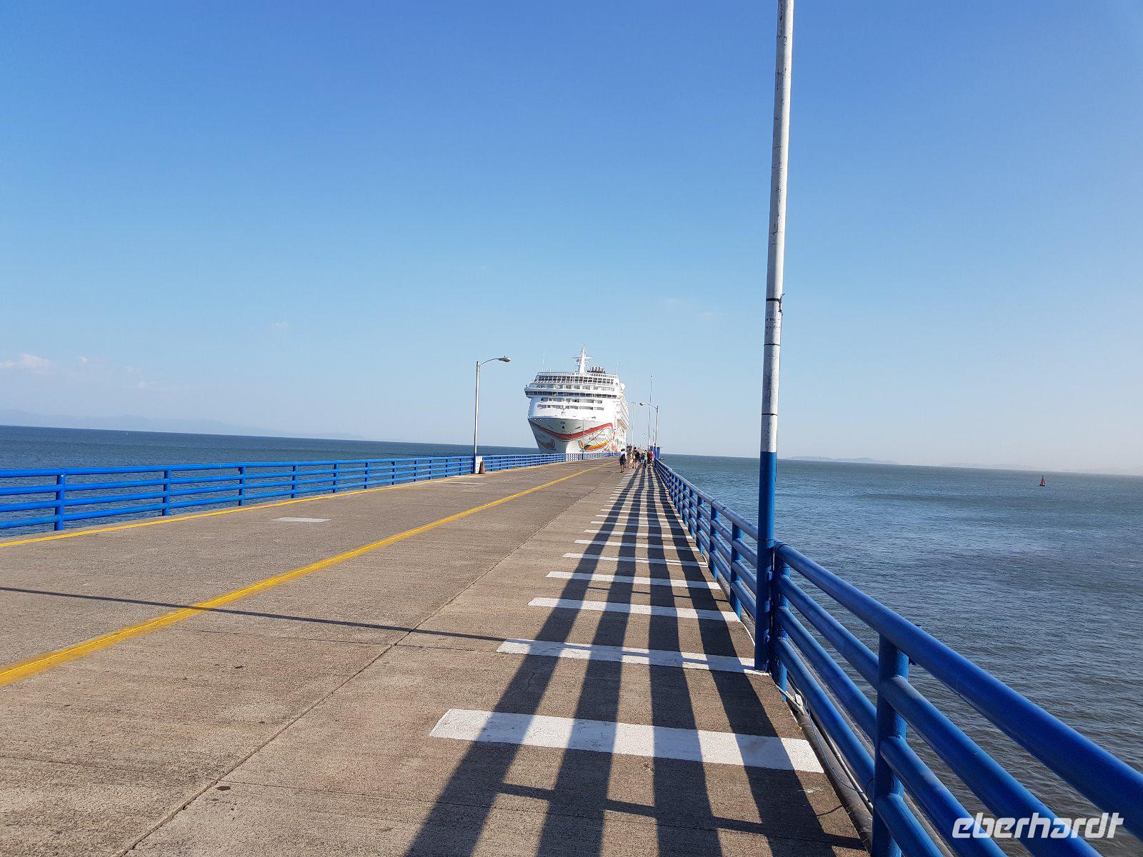 Wir erreichen früh den Hafen von Puntarenas in Costa Rica. Wir sehen einen schmalen Landstrich mit Palmen und Strand, der wie eine Halbinsel in das Meer ragt. In weiter Ferne erheben sich die Berge von Costa Rica empor - der höchste Punkt des Landes ist ca. 6.000m hoch. Vom höchsten Punkt ist es möglich sowohl den Pazifischen Ozean im Westen als auch das Karibische Meer im Osten zu sehen. Costa Rica selbst hat eine Fläche so groß wie unser Bundesland Niedersachsen mit ca. 1 Million Einwohner. Die Wirtschaft besteht hauptsächlich aus dem Anbau von Bananen, Ananas, Zuckerrohr und Kaffee. Eine bedeutende Haupteinnahmequelle ist allerdings der Tourismus geworden. Mit ca. 3 Millionen Touristen jedes Jahr macht das einen Anteil am Bruttoinlandsprodukt von 6% aus (geschätzt für 2019: 4 Mrd. US$). Die Anziehungskraft liegt in der ökologischen Vielfältigkeit, die das Land zu bieten hat. Obwohl Costa Rica weniger als 0,03% der gesamten Erdoberfläche ausmacht, so finden sich hier fast 5% der Pflanzen- und Tierarten unserer Erde wieder.