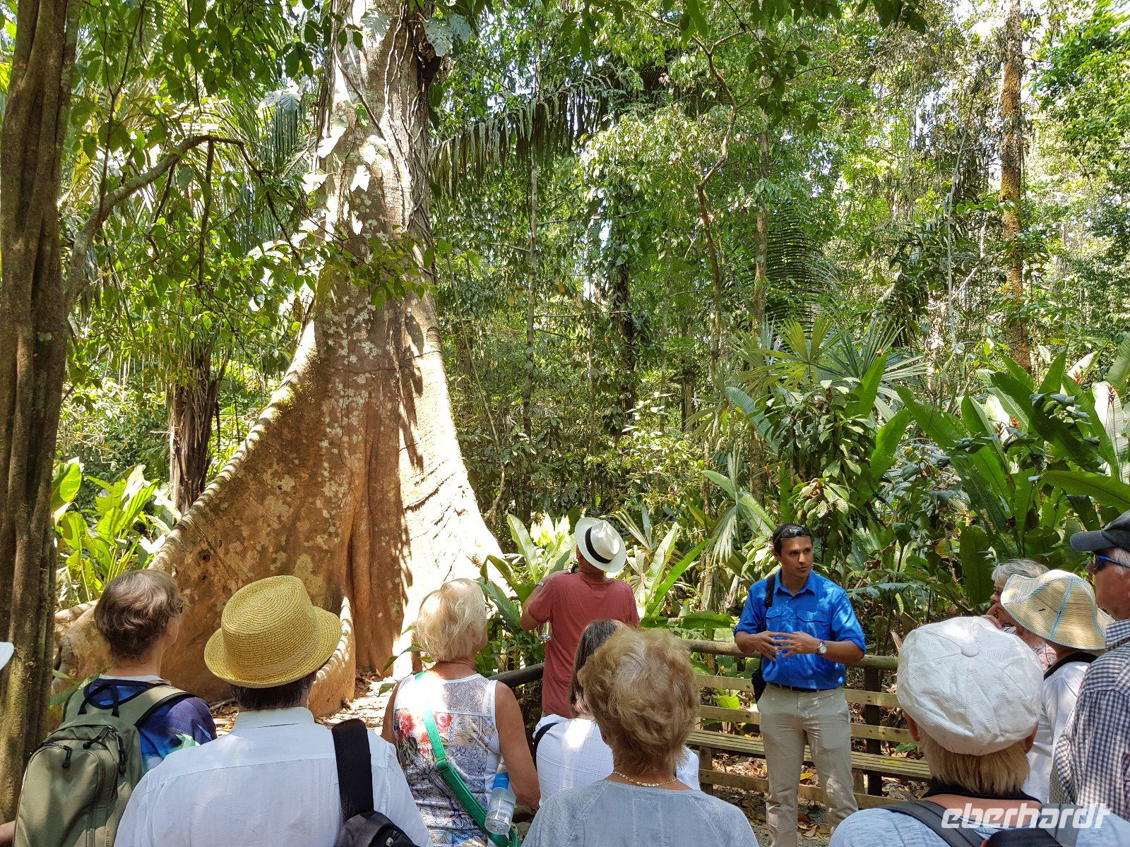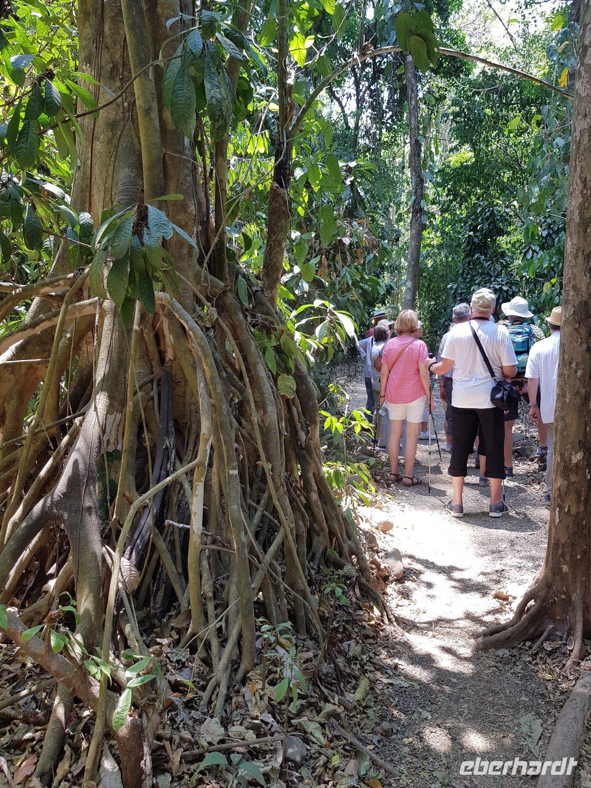 Vor dem Mittagessen sehen wir noch aus sicherer Entfernung von einer Brücke Krokodile im Fluss liegen. Diese können auch bis zu 3m lang werden und waren lange Zeit fast ausgerottet. Heute findet man wieder an die 200 Krokodile auf ca. 20km Fluss. Beim Mittagessen verschnaufen wir dann ein wenig - die hohe Luftfeuchtigkeit sind wir in unseren Breiten einfach nicht gewöhnt.