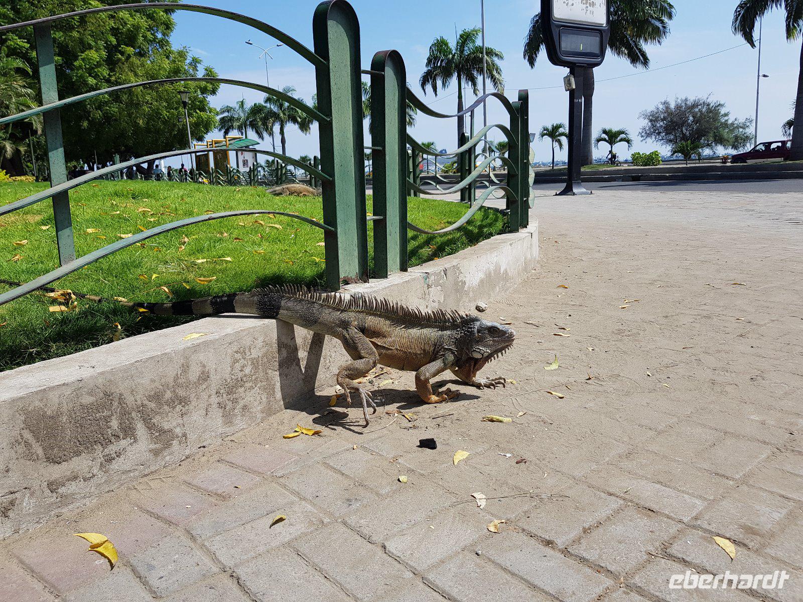 Das Kreuzfahrtterminal ist super modern und von hier aus starten wir unseren Spaziergang Richtung Norden auf der Malecón Avenue vorbei am Yacht Hafen an der Uferpromenade entlang. Wir erreichen auf der rechten Seite einen kleinen Park, in dem wir ungewohnte Bewohner vorfinden: Leguane. Die Reptilien findet man nahezu an jedem Baum oder krabbelnd am Boden auf der Wiese. Eine schöne Abwechslung an diesen doch sehr heißen Tag. Wir setzen unseren Landgang fort hinauf Richtung Zentrum vorbei an einem einheimischen Markt bis zur Kathedrale „La Dolorosa". Von dort aus geht es wieder runter zur Pacific Mall - wo es doch die beliebten Panama Hüte geben soll. Wir werden fündig und fast alle Herren der Gruppe können sich nun mit dieser einheimischen Kopfbedeckung vor der intensiven Sonne schützen.