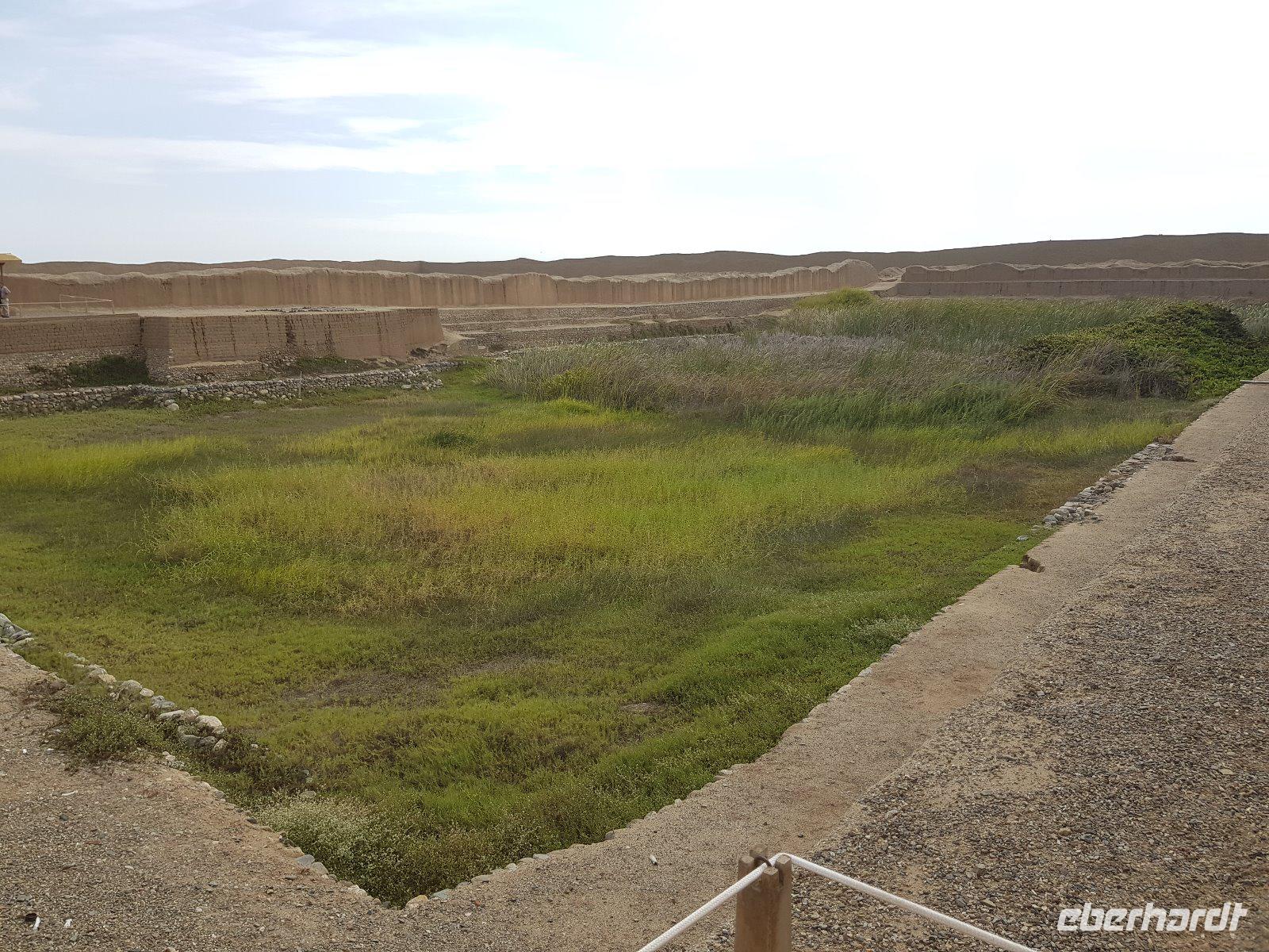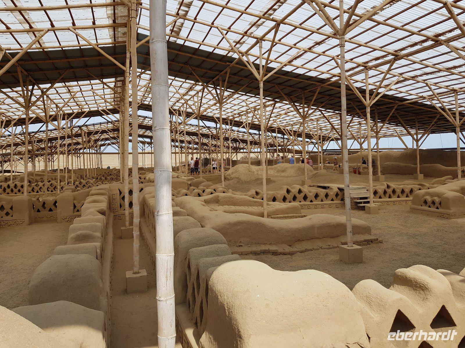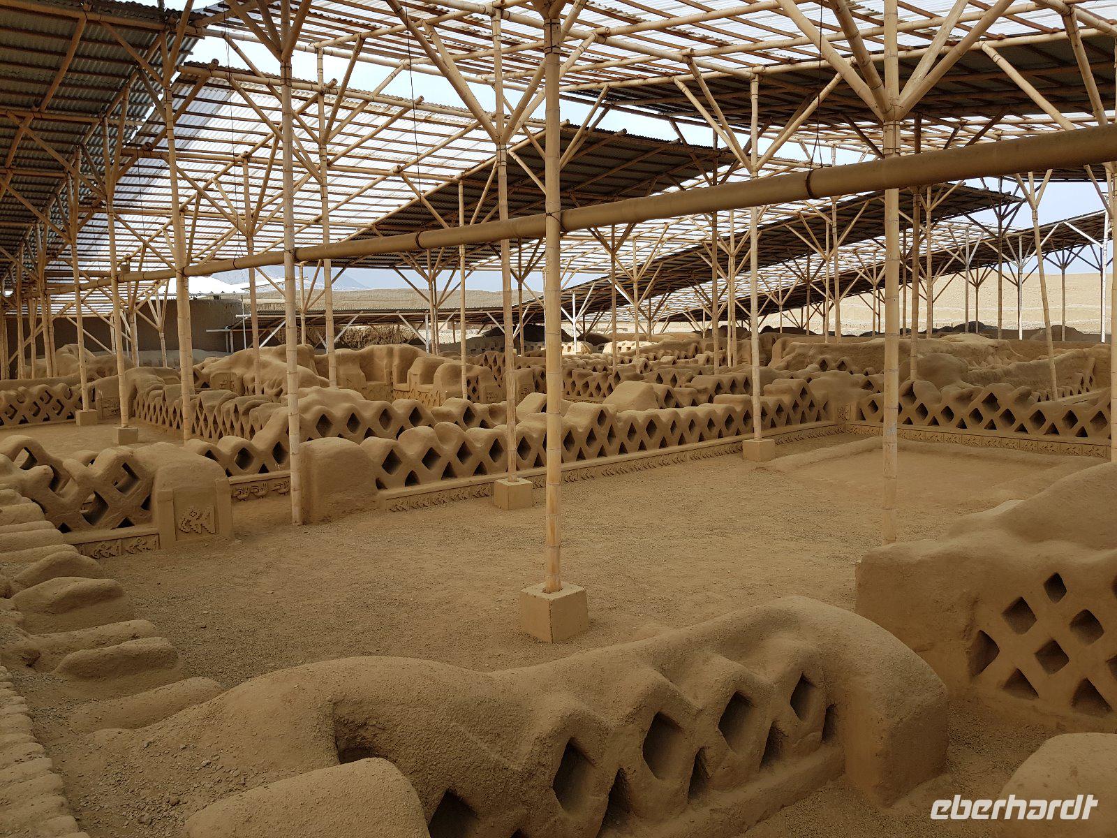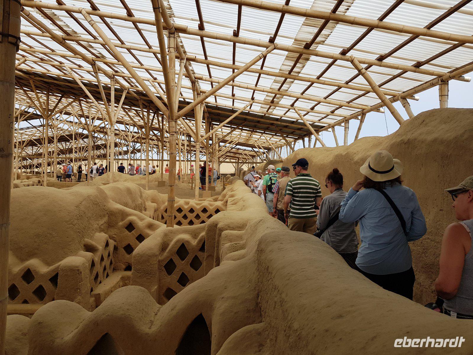 Weiter geht es in das nächste weltweit größte zeremonielle Zentrum, das aus Adobe erbaut wurde. Im archäologischen Komplex von Chan Chan erkunden wir die größte präkolumbianische Stadt Amerikas, welche 1986 zum UNESCO Weltkulturerbe erklärt wurde. Chan Chan war die Hauptstadt des Chimu-Königreichs. Archäologen schätzen, dass es in seinen Räumen, Häusern, Lagerhäusern, Mauern und Pyramidentempeln mehr als 100.000 Menschen beherbergte. Die bis zu 8m hohen Wände sind reich an geometrischen Figuren, Tieren und mythologischen Wesen dekoriert. Wir laufen durch die Anlage mit seinen riesigen Außenplätzen und verschachtelten Gängen. Es ist definitiv ein gigantisches Erbe, welches die Chimu Kultur der heutigen Zeit hinterlassen hat.
