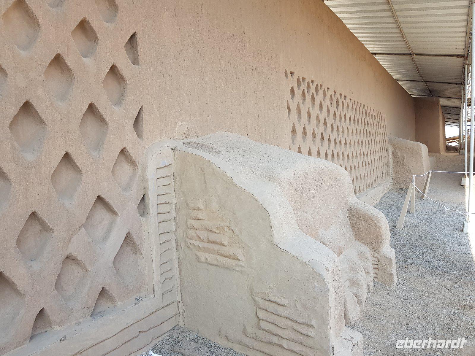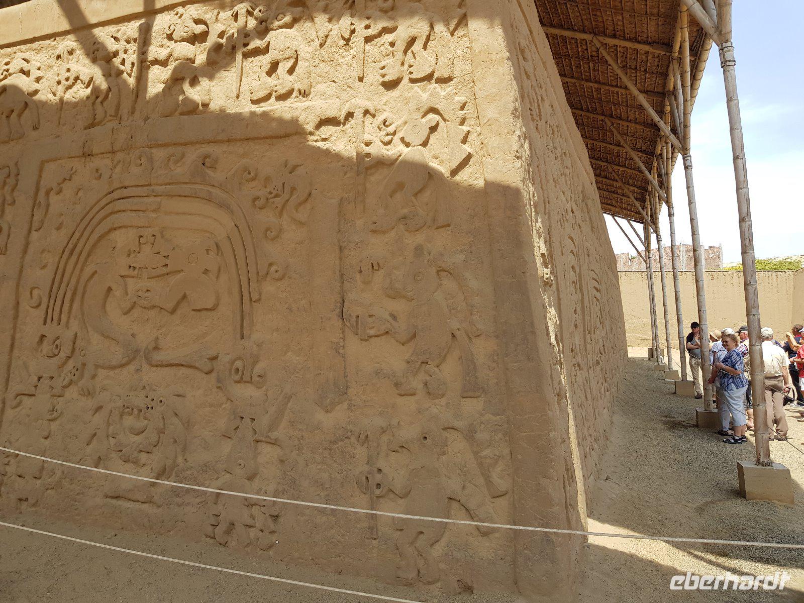 Wir fahren zuerst ein wenig nach Trujillo rein und beobachten das geschäftige Treiben der Peruaner. Die Stadt zählt ca. 1 Million Einwohner. Als erstes besuchen wir die gut erhaltenen Tempel des Drachens (Huaca del Dragon) mit seinen Schnitzereien an den Wänden. Der Tempel war das zeremonielle Zentrum der Chimu.