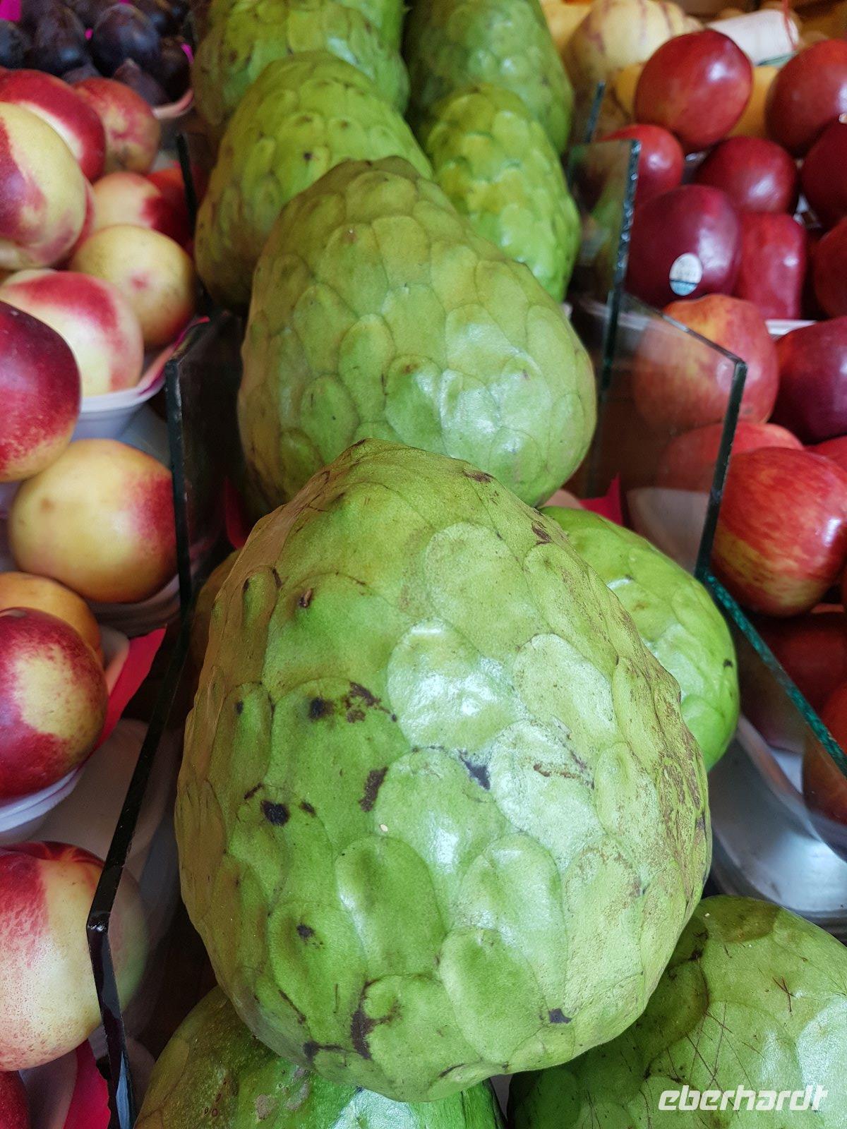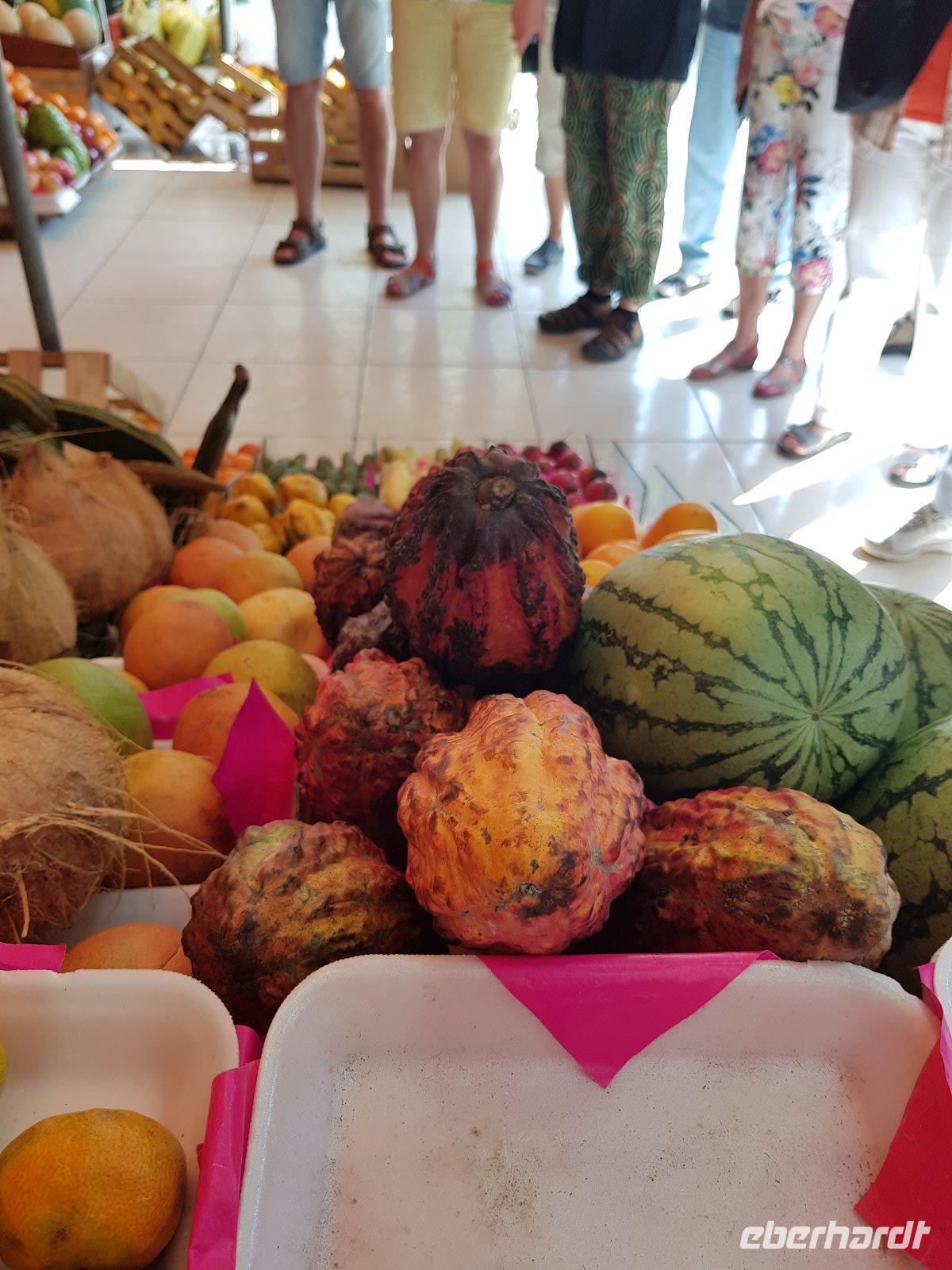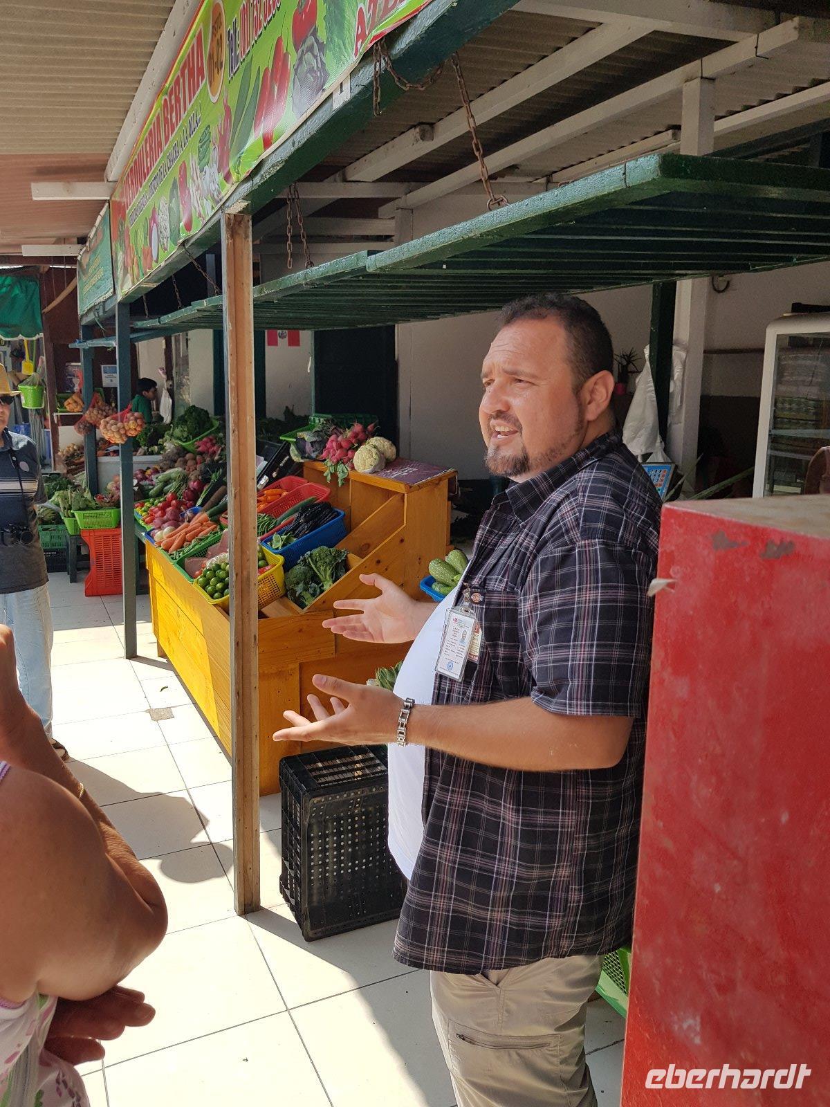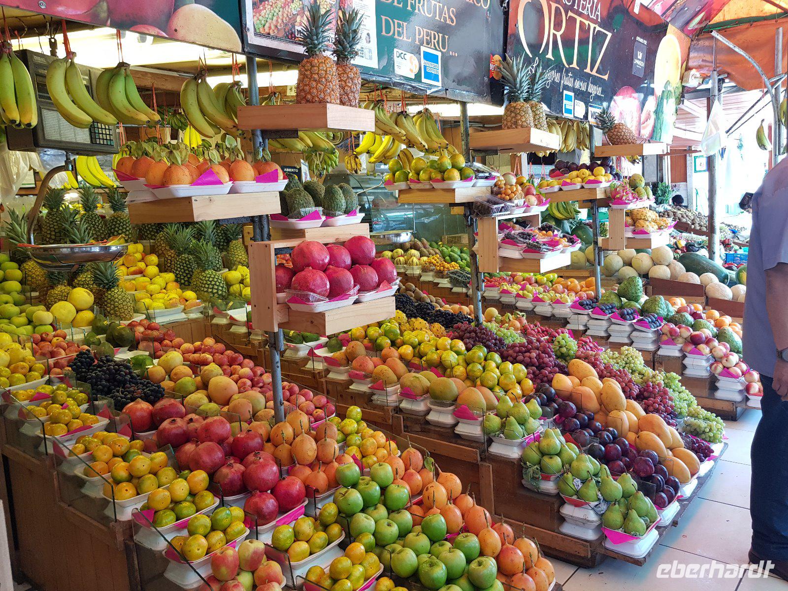 Der letzte Stopp des Tages ist der bekannteste Markt in Lima. Franz zeigt und erklärt uns hier allerlei exotische Gemüse und Obstsorten. Wir sehen unter anderem Avocados, Maniokwurzeln, schwarzen Mais, riesigen weißen Mais, frischen Fisch und Jakobsmuscheln und machen einen Halt an dem Obststand von Pedro Ortiz. Hier verköstigen wir exotische Früchte, wie wir sie in Deutschland so nicht kennen oder sehen. Selbst die Physalis ist hier einfach viel geschmackvoller und süßer als sie es jemals bei uns sein kann. Es landen Guave, Drachenfrüchte, Mangos, Physalis, Mini-Bananen, Mandarinen und Chirimoya auf unserem Teller. Ein toller Abschluss eines Erlebnistages im historischen Lima.