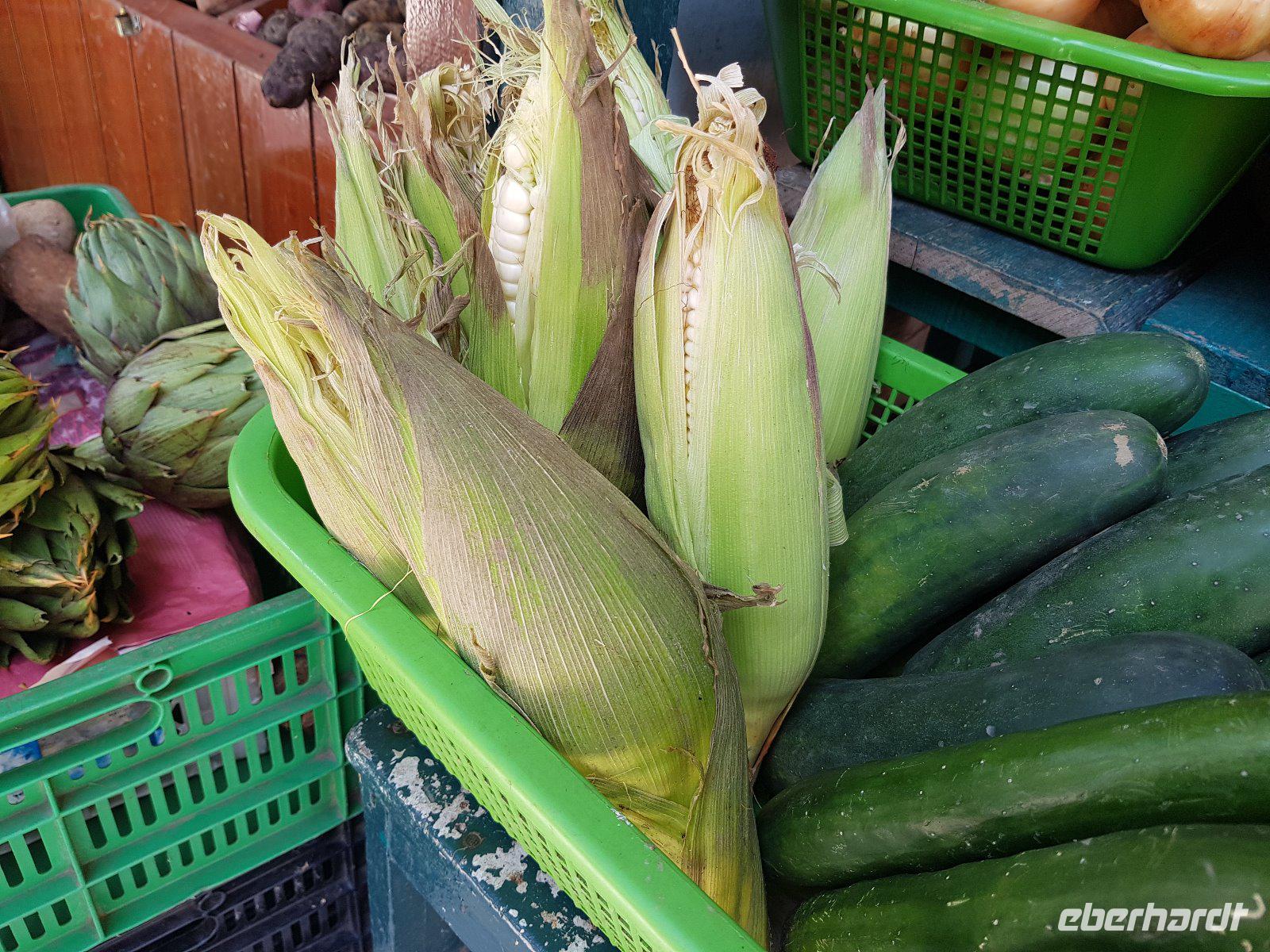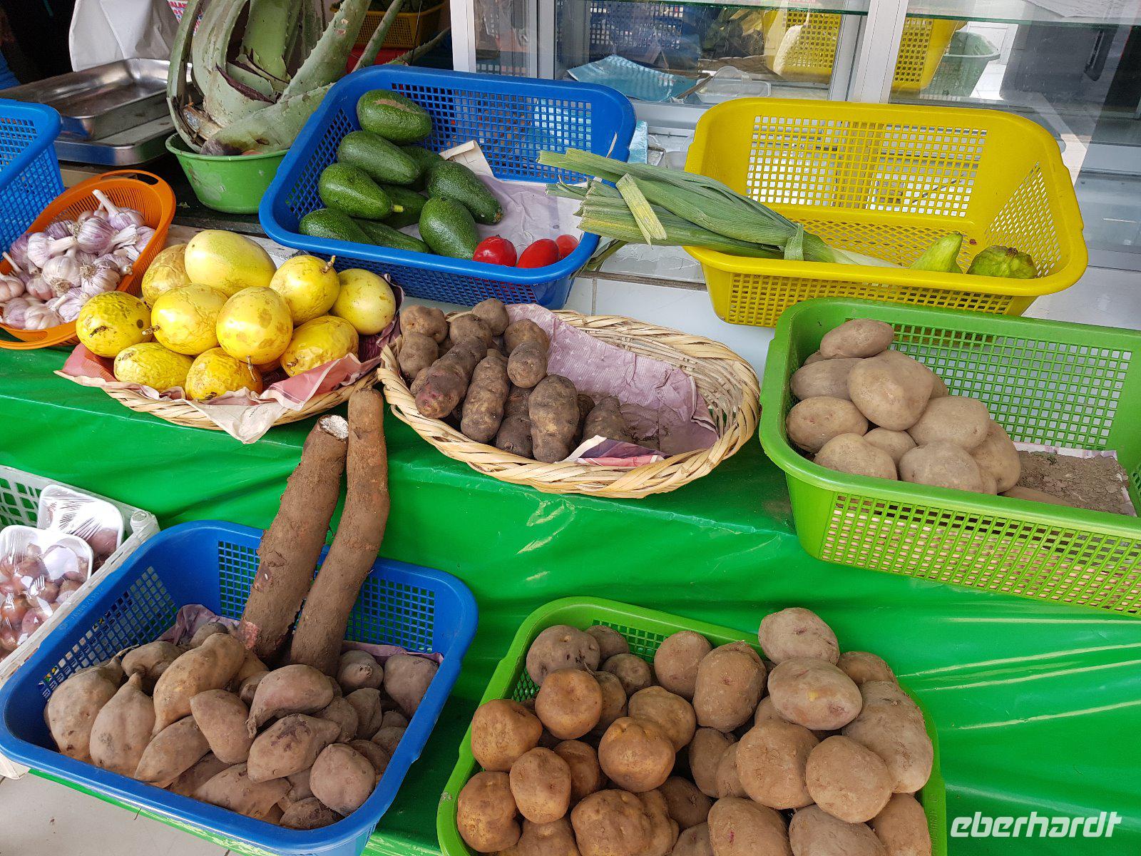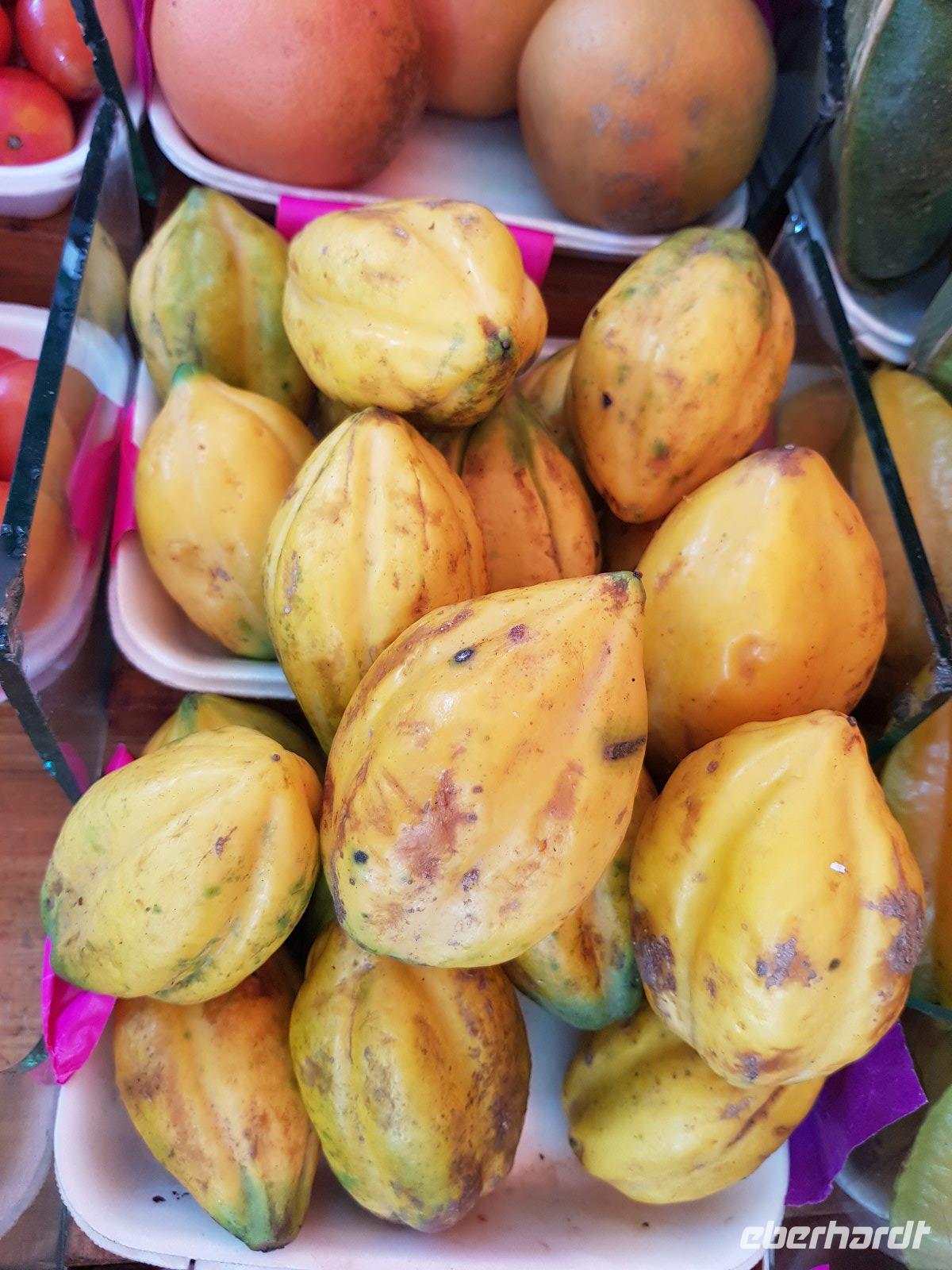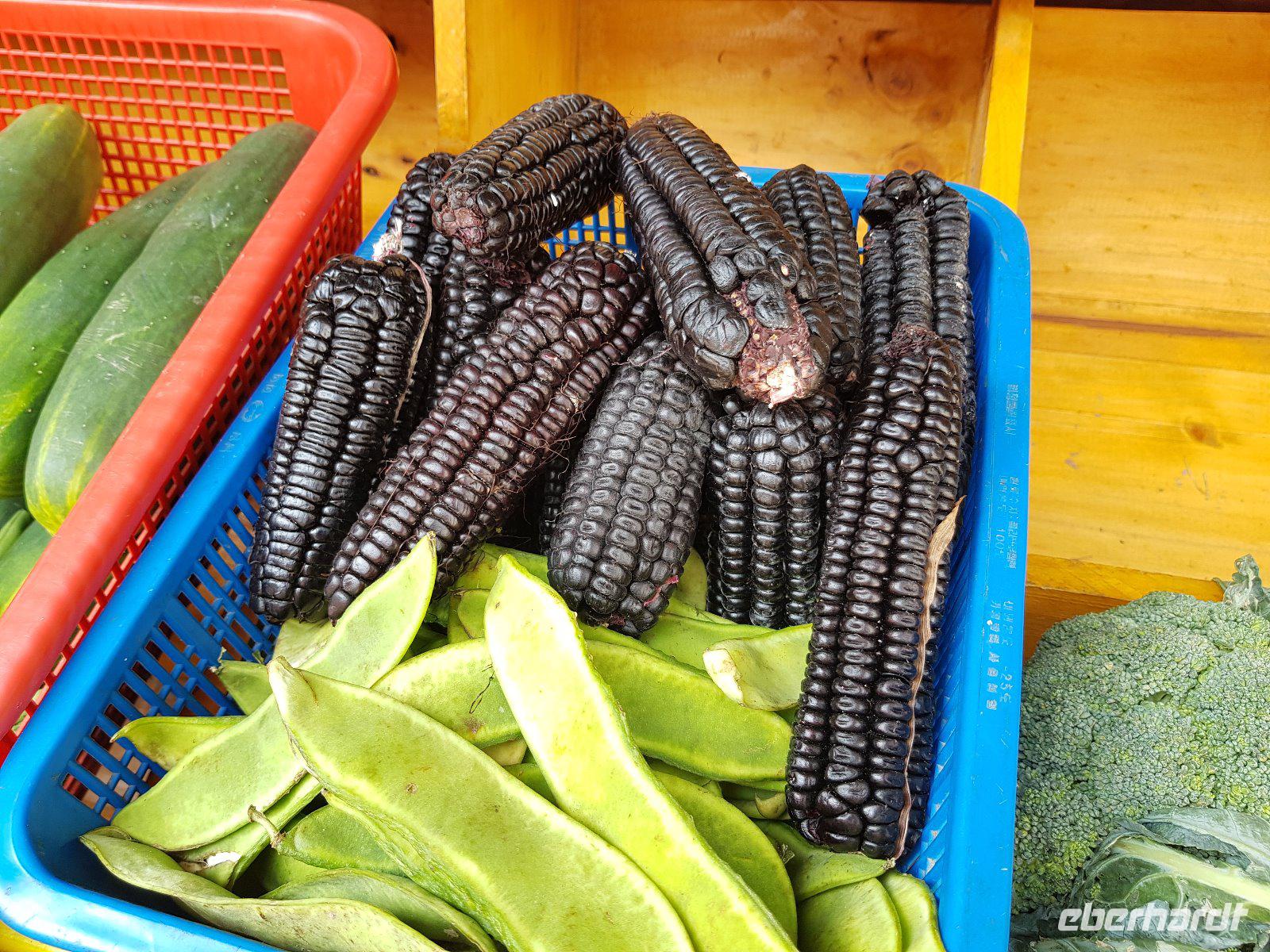 Der letzte Stopp des Tages ist der bekannteste Markt in Lima. Franz zeigt und erklärt uns hier allerlei exotische Gemüse und Obstsorten. Wir sehen unter anderem Avocados, Maniokwurzeln, schwarzen Mais, riesigen weißen Mais, frischen Fisch und Jakobsmuscheln und machen einen Halt an dem Obststand von Pedro Ortiz. Hier verköstigen wir exotische Früchte, wie wir sie in Deutschland so nicht kennen oder sehen. Selbst die Physalis ist hier einfach viel geschmackvoller und süßer als sie es jemals bei uns sein kann. Es landen Guave, Drachenfrüchte, Mangos, Physalis, Mini-Bananen, Mandarinen und Chirimoya auf unserem Teller. Ein toller Abschluss eines Erlebnistages im historischen Lima.