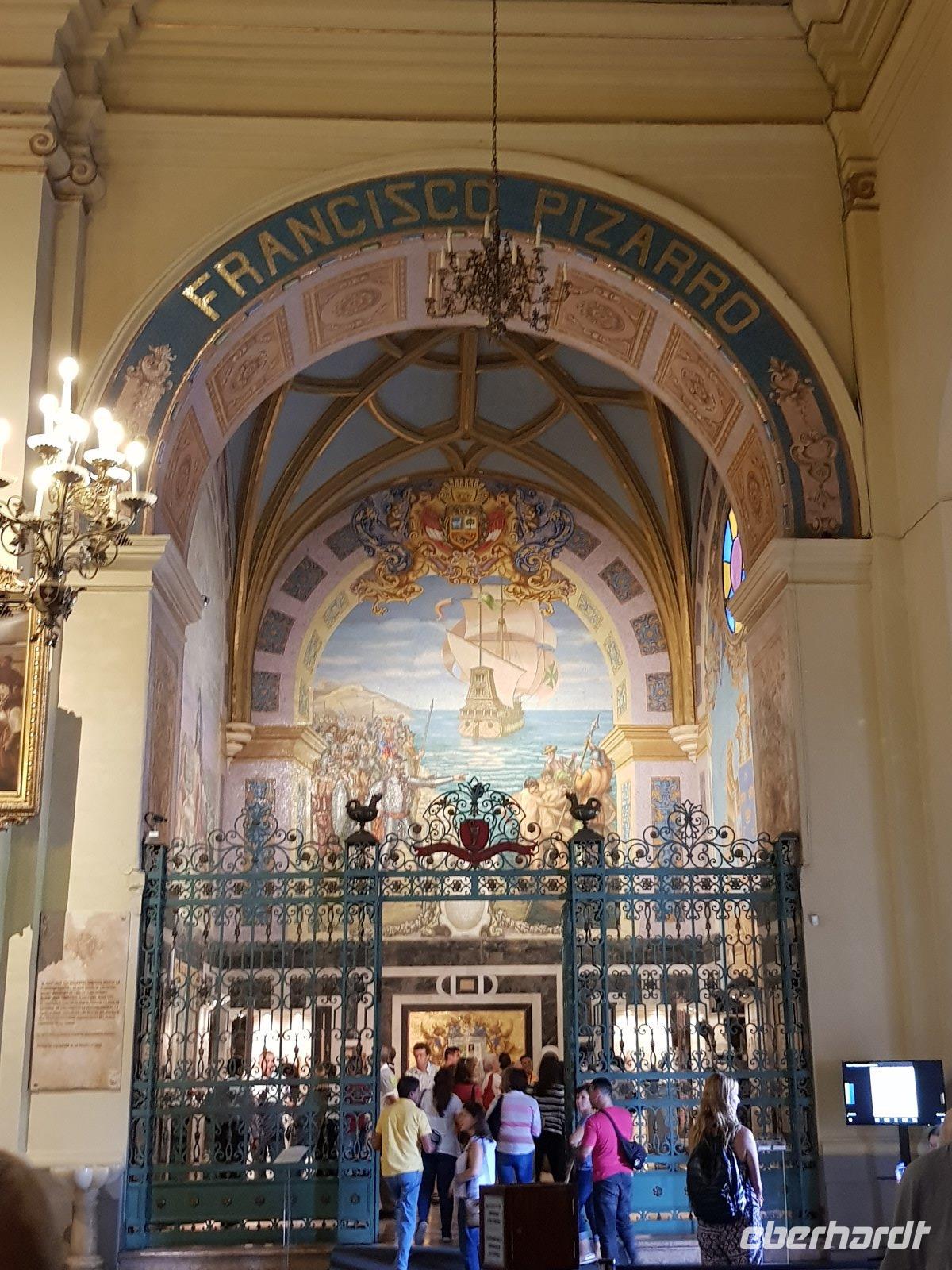 Hervorzuheben ist hier vor allem das Mausoleum von Francisco Pizarro, der als Gründer der Stadt Lima gesehen und verehrt wird. Zwei Jahre nach dem Einmarsch der Spanier in das Inkaimperium, gründete Francisco Pizarro 1535 die Stadt Lima am Ufer des Rimaq Flusses. Pizarro gründete auch die Hafenstadt Callao, die zum wichtigsten Hafen Spaniens in der Neuen Welt wurde. Bis Mitte des 18. Jahrhunderts war Lima die wohlhabendste Hauptstadt der spanischen Herrschaft in Südamerika. Pizarro wurde während eines Bürgerkriegs brutal ermordet, seine Gebeine hat man unter der Kirche begraben. Erst in den 70iger Jahren wurden diese durch Zufall entdeckt. Sein Skelett kann man heute besichtigen.