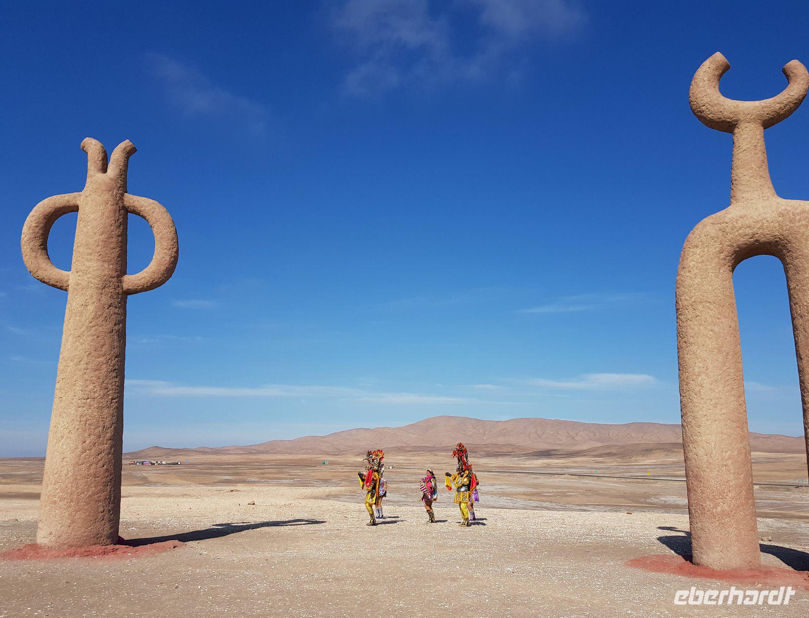 Wir fahren mit dem Bus erst einmal in das Stadtzentrum und spazieren über den Platz Cristobal Colon. Am Ende befindet sich die Kirche San Marcos, welche 1876 im gotischen Stil erbaut wurde. Anschließend fahren wir auf der Pan-Amerika Richtung Süden in die Atacama Wüste bis Pampa Chaca. Dort erwarten uns die riesigen Tutelar Skulpturen des Künstlers Diaz Fleming. Die Skulpturen zählen zu den größten in Chile und sind eine Hommage an das Anden Volk. Man sieht eine Frau und einen Mann verbunden mit der Sonne und dem Mond. Der Kreativität sind hier keine Grenzen gesetzt.