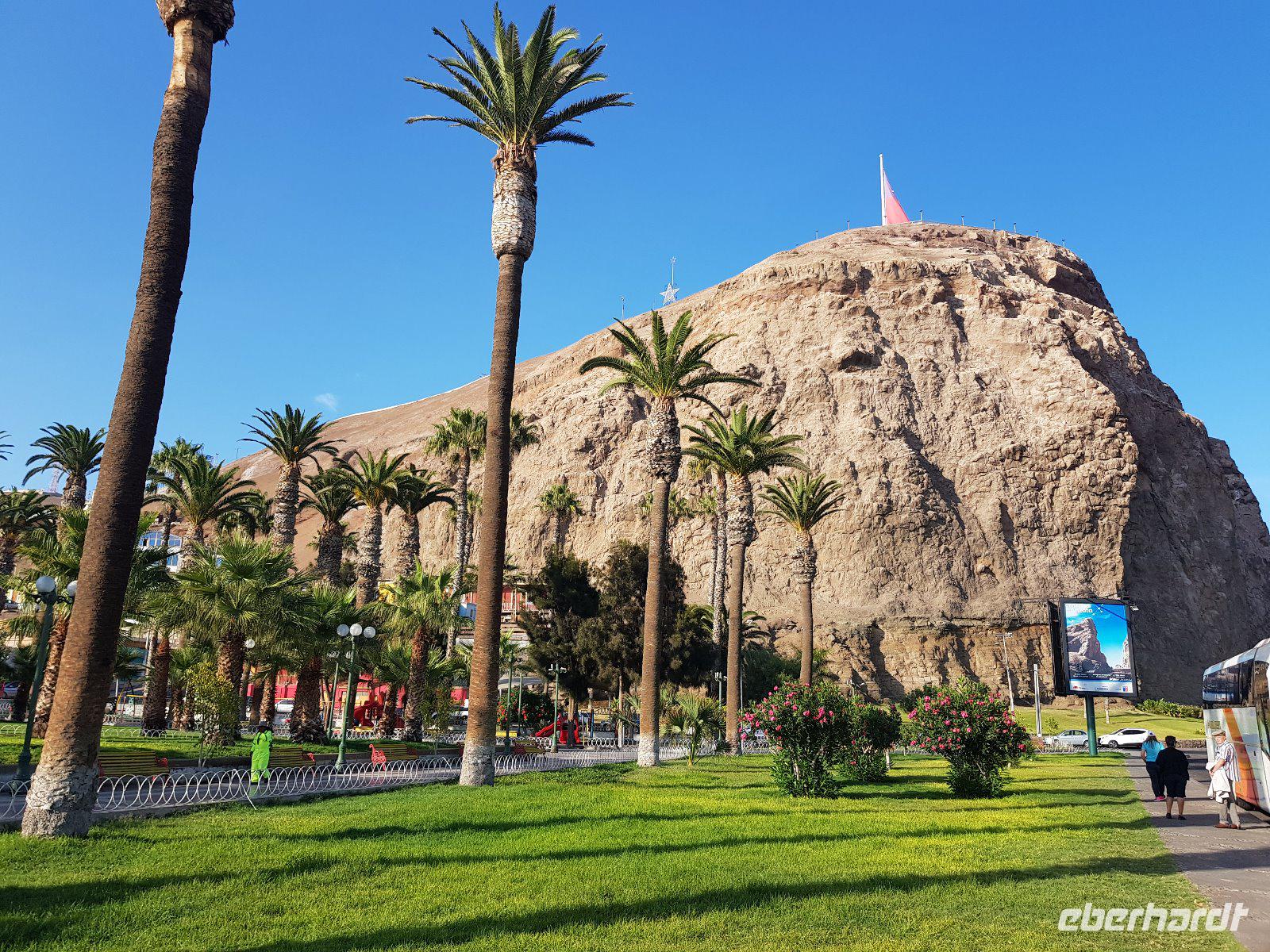 Bekannt als die „Stadt des ewigen Frühlings" durch ihre grünen Täler und des himmlischen Klimas ist Arica eine Stadt in Mitten der Atacama Wüste. Bewohnt seit mehr als 10.000 Jahren. Bei der Fahrt aus dem Hafen mit unserem Reiseleiter Michael sehen wir bereits den Morro de Arica - ein imposanter Felsen - 110 Meter über der Stad. In Arica und Umgebung leben ca. 200.000 Einwohner. Die Stadt hat ein mildes und gemäßigtes Klima mit einigen der niedrigsten Niederschlagsmengen pro Jahr weltweit. Daher gibt es selten Wolken über Arica - so auch an unserem heutigen Tag.