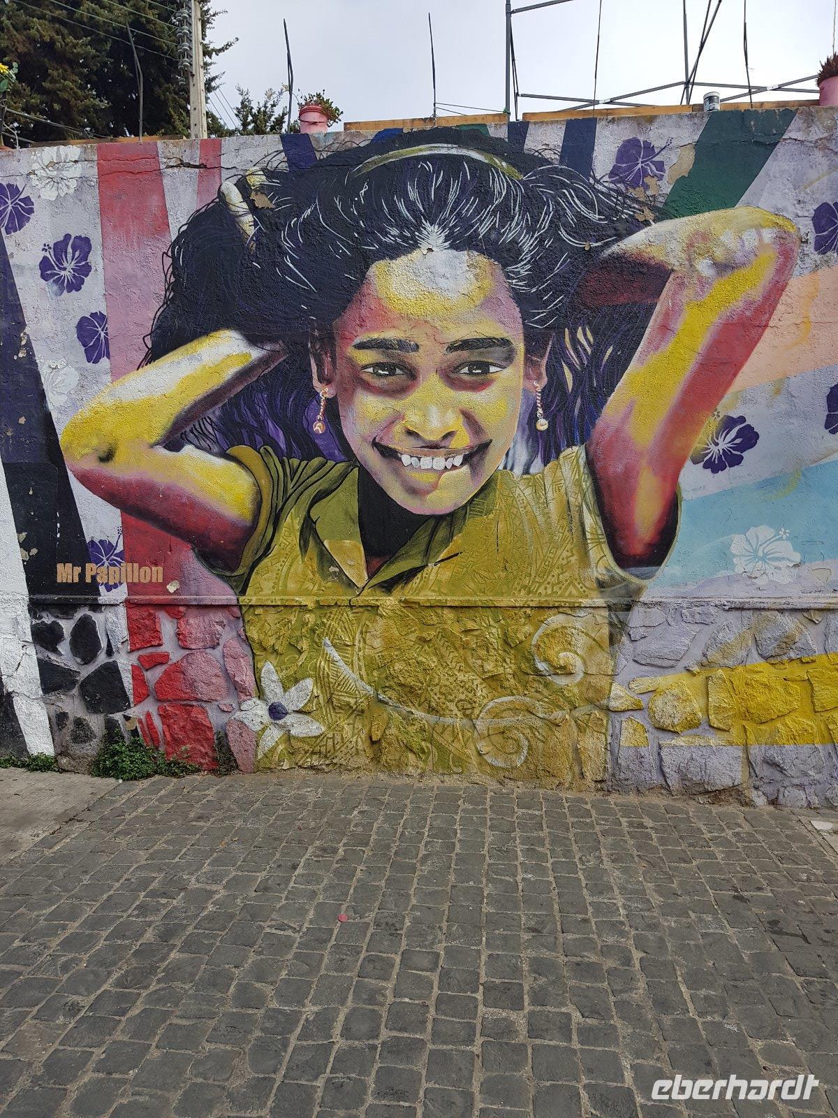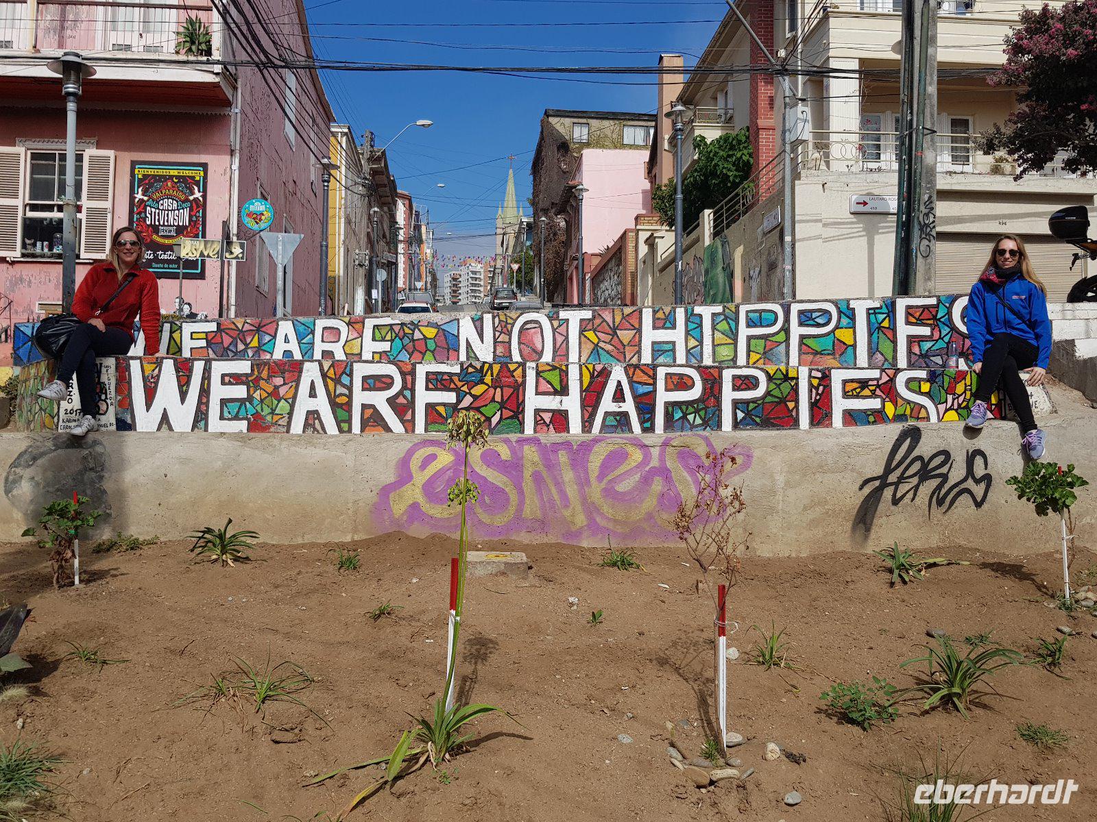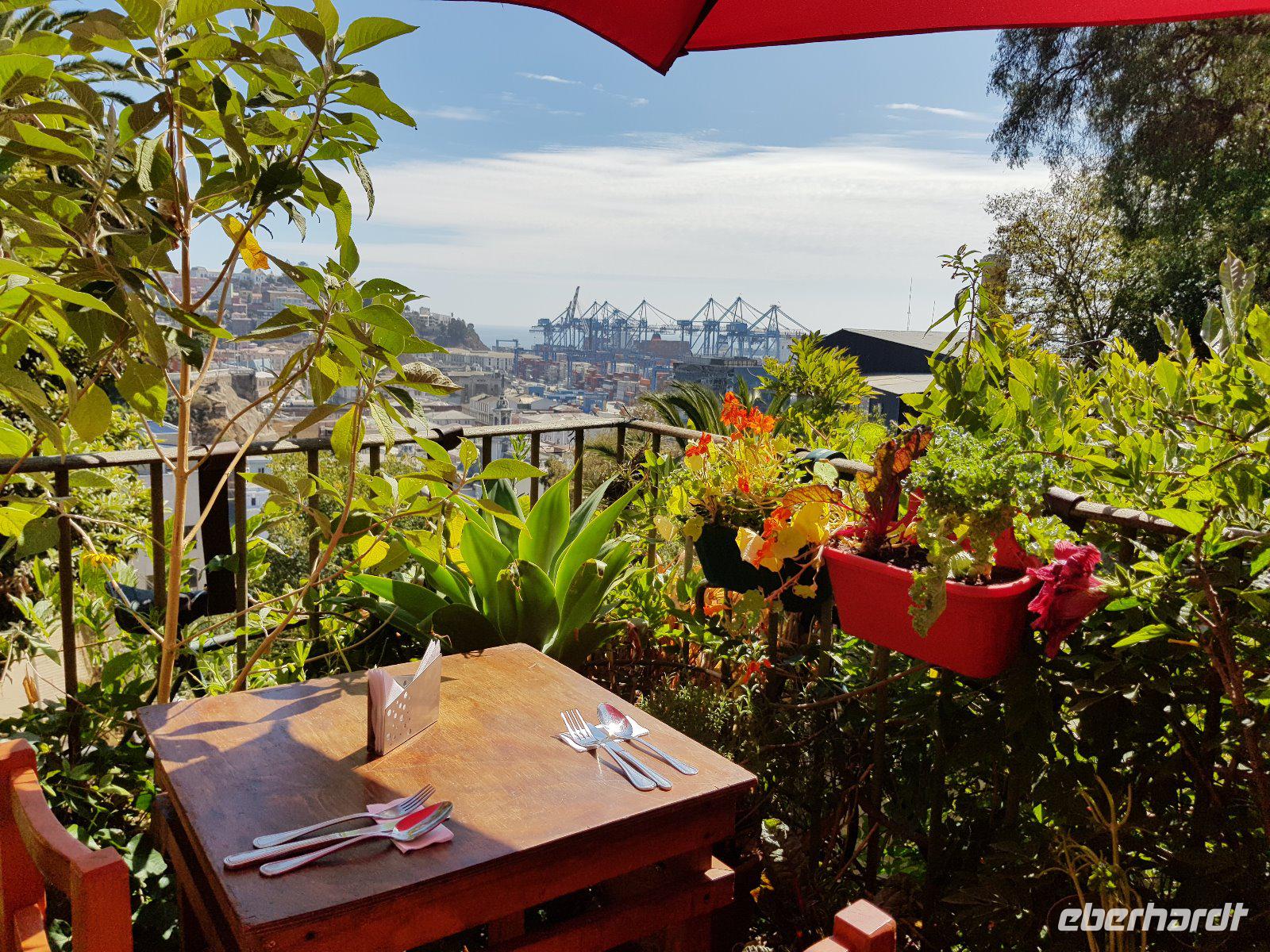 An dem heutigen Samstagmorgen ist es noch sehr ruhig, ein einziges Containerschiff befindet sich im Hafen und zahlreiche kleine Fischerboote. Wir wollen hoch hinaus - auf einen der Hügel der Stadt. Um das ganze nicht zu Fuß erledigen zu müssen, gibt es in der Stadt einen Fahrstuhl, der einer Zahnradbahn gleicht. Oben angekommen spazieren wir bergauf und bergab durch kleine Gassen vorbei an faszinierenden Graffitis und bunten Häusern. Uns wird erzählt, dass diese immer in der Farbe gestrichen wurde, die gerade günstig zu haben war. So entstand ein lebhaftes und buntes Hippie Viertel. Für unser Mittagessen kehren wir in ein kleines bezauberndes Restaurant mit schöner Aussicht über die Stadt ein.