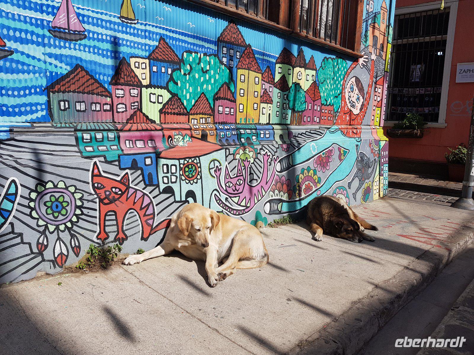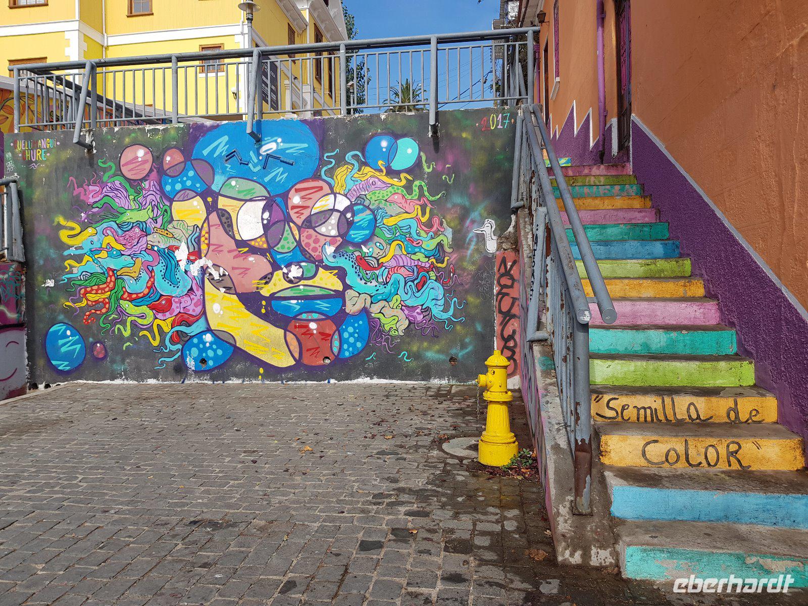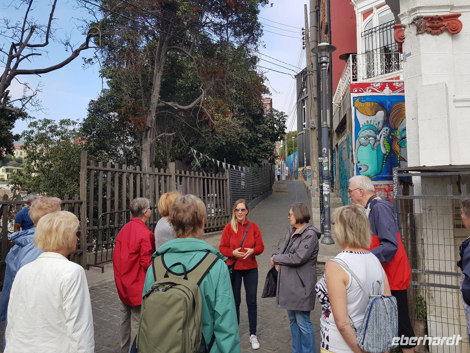 Wir starten früh Richtung Valparaíso, eine schöne Küstenstadt nordwestlich von Santiago de Chile. Auch bekannt als die Künstlerstadt in Chile. Nach ca. 1,5h Fahrt durch das Tal Casablanca erreichen wir Valparaíso und beginnen unseren Rundgang am Hafen. Vor dem Bau des Panamakanals war Valparaíso eine sehr florierende und wirtschaftlich starke Stadt, da fast alle Schiffe auf ihrem Weg über Kap Horn in Valparaíso einen Stopp machten. Gütern wurden umgeschlagen, Vorräte aufgefüllt - kurz es herrschte ein reges Treiben. Heute ist Valparaíso eher für seine Künstler bekannt, die ihr Handwerk und Malereien ausstellen, in der Hoffnung hier ihre Werke zu verkaufen und entdeckt zu werden.