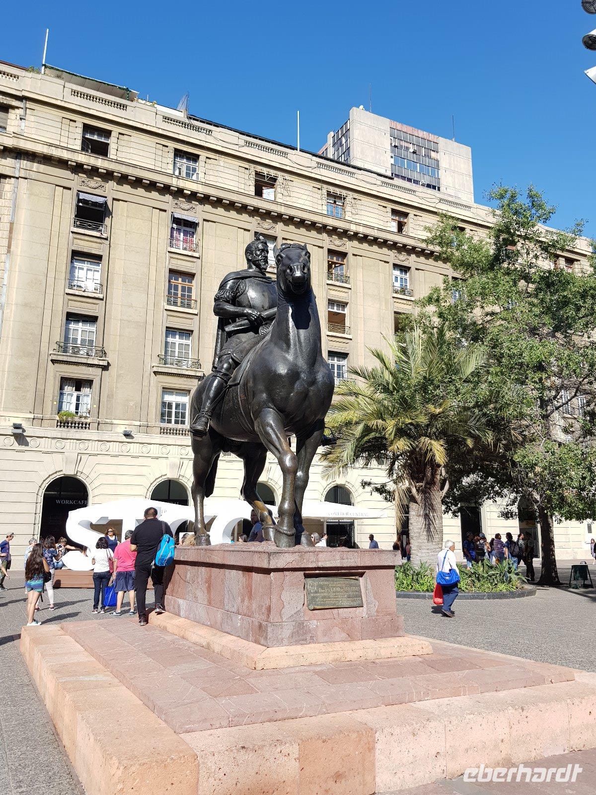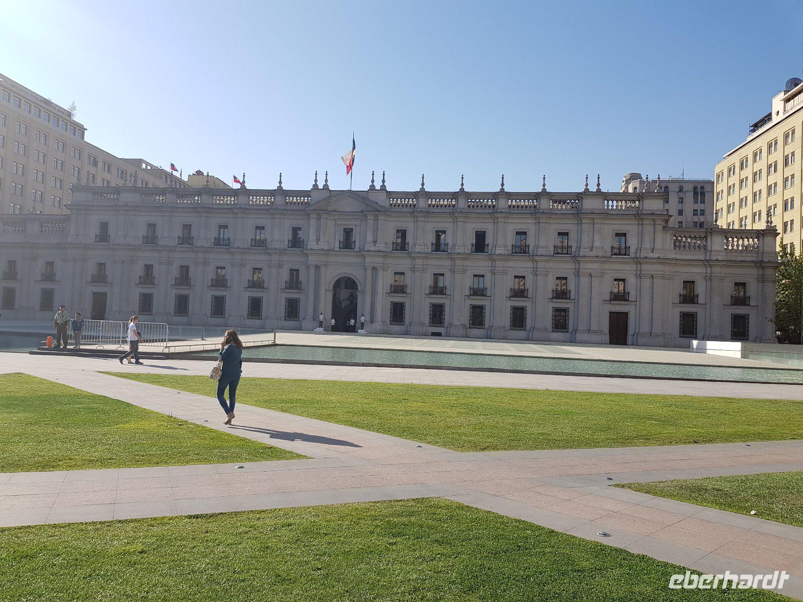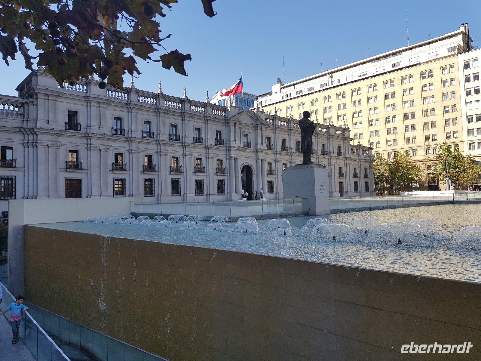 Anschließend wartet auf uns ein Mittagessen mit frischem Fisch (Ceviche) in der Markthalle, welche auch zum bummeln einlädt. Juliane führt uns dann weiter durch den zentralen Kern der Stadt, vorbei an der Kathedrale Metropolitana, den Platz de Armas mit dem Reiterdenkmal des spanischen Eroberers Don Pedro de Valdivia, durch den Finanzbezirk hin zum Regierungspalast „La Moneda", seit 1846 Sitz des Präsidenten. Der Regierungspalast ist ein Gebäude mit viel Historie: Beim Militärputsch am 11. September 1973 wurde das Gebäude bombardiert, Präsident Allende soll sich hier das Leben genommen haben.