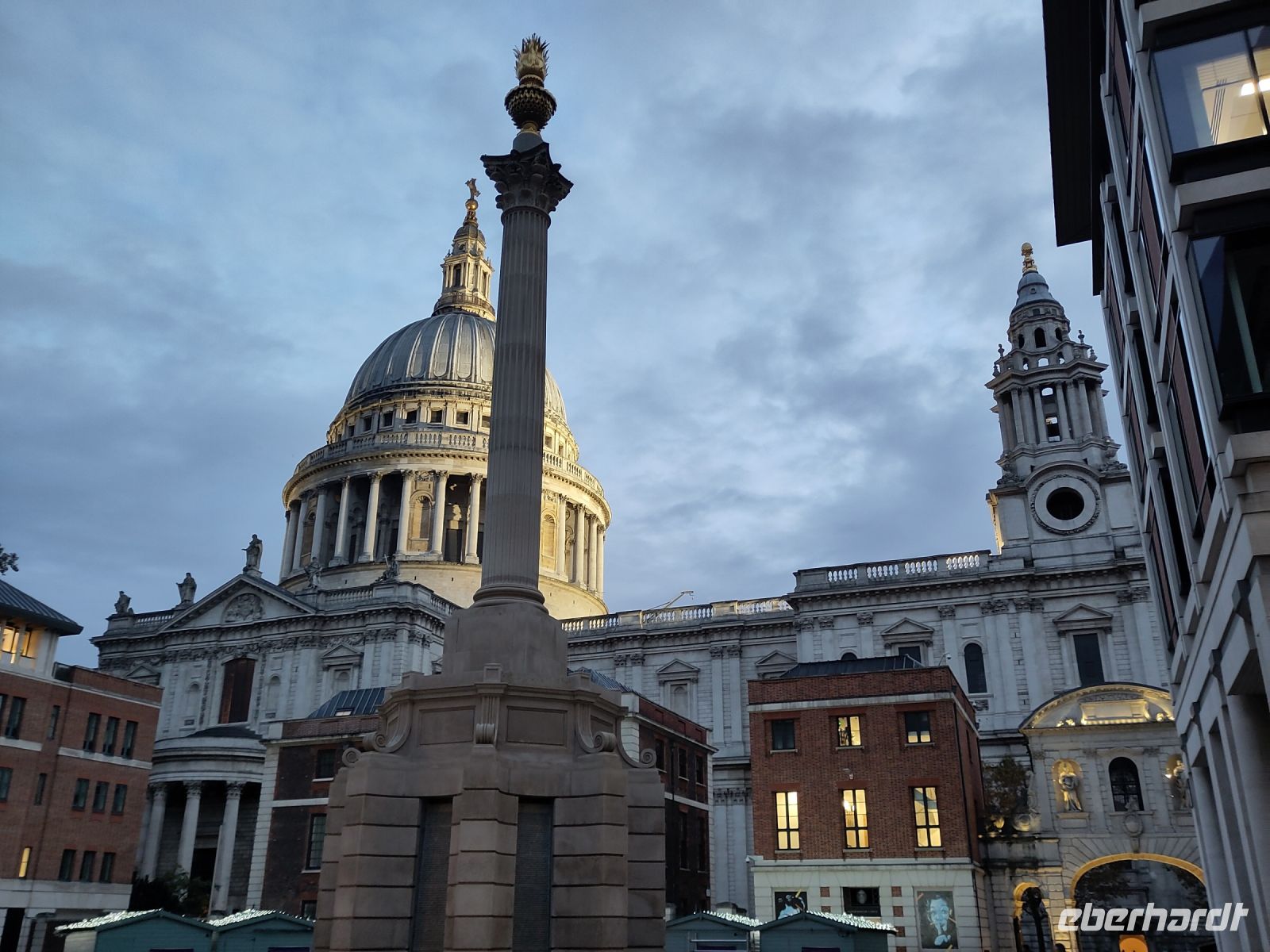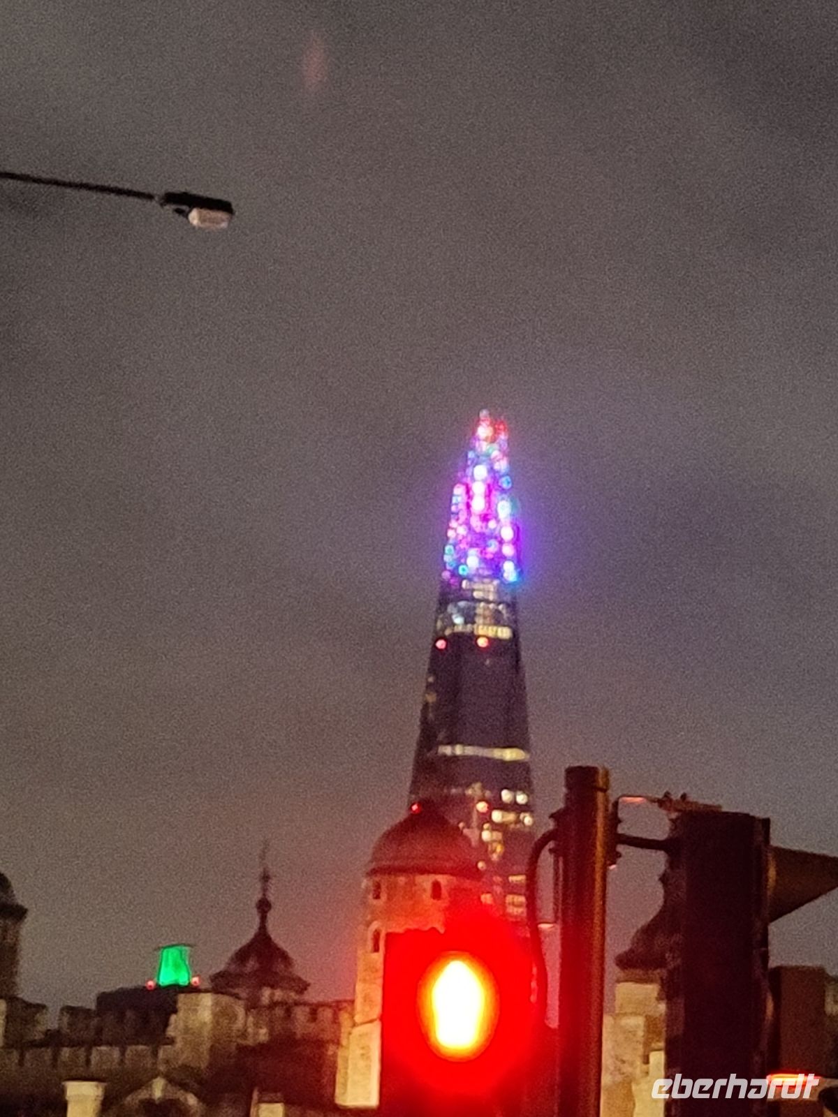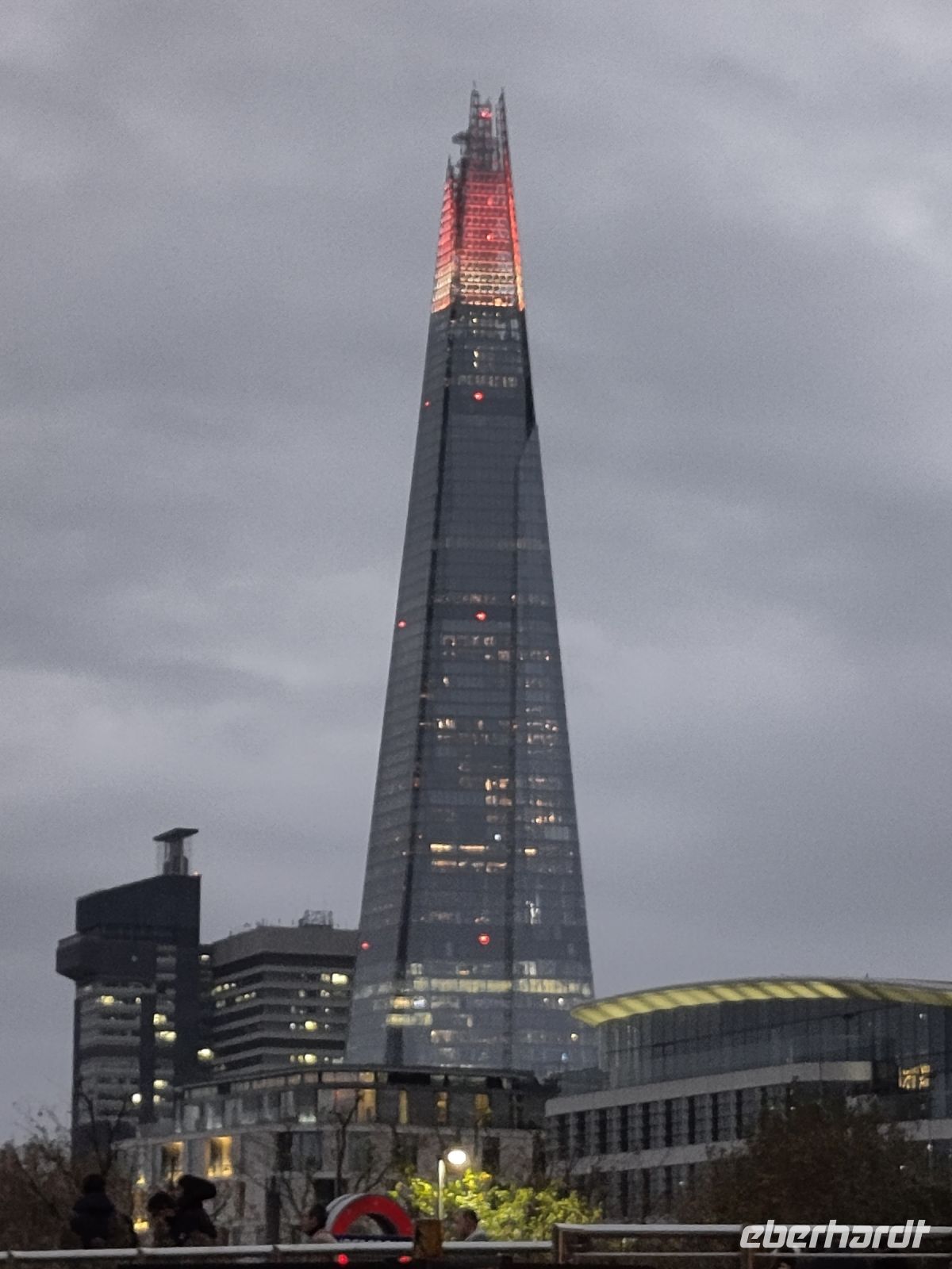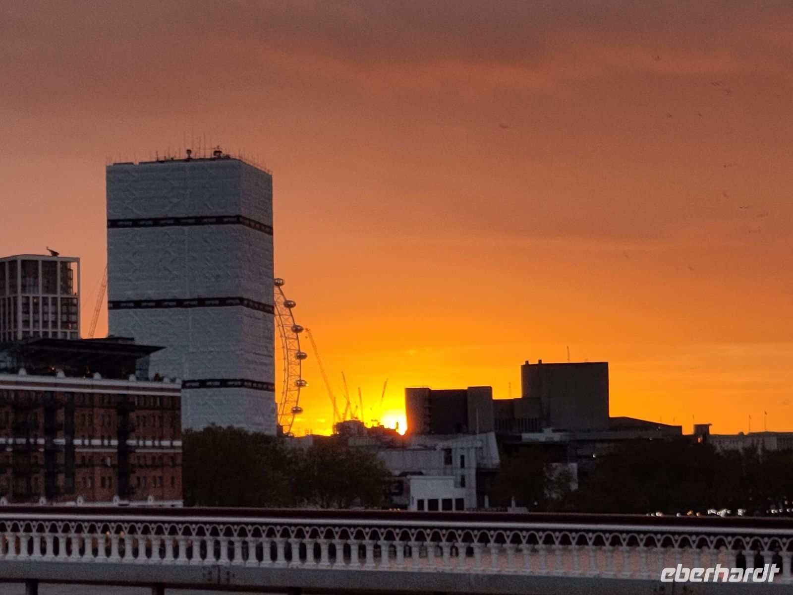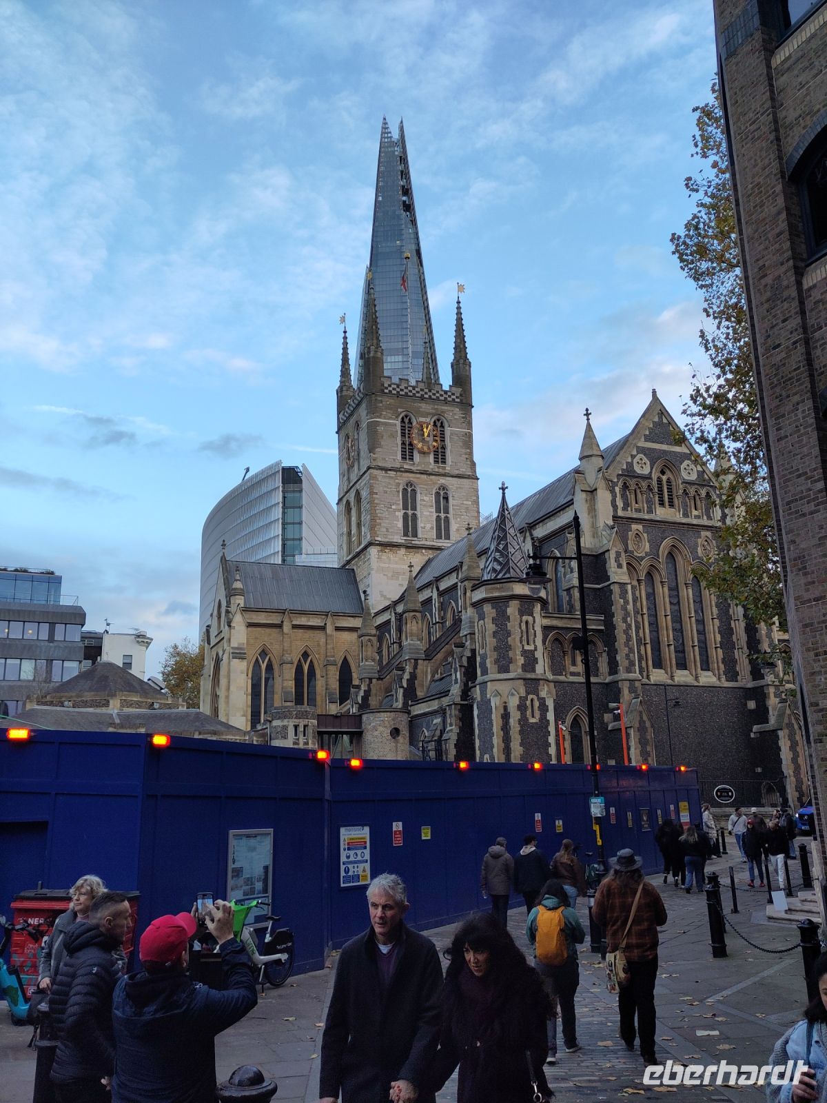 Auf die Dachterrasse des One New Change kamen wir leider nicht, dafür kostenlos - weil Sonntag - in die St. Paul's Cathedral, wobei wir nur etwa die Hälfte des Hauptschiffs besichtigen konnten, der Rest ist sonntags nicht zugänglich (wochentags 34 GBP). Mit dem Bus ging es weiter zum Borrough Market, wo wir uns gegenüber der Haustür "von Bridget Jones" (Schokolade zum Frühstück) trennten, um den Lebensmittelmarkt individuell zu erkunden. Einige hatten danach Eintrittskarten für die Ausichtsplattform auf Londons höchstem Gebäude, The Shard, andere hatten das London Eye gebucht, das Riesenrad gegenüber der Houses of Parliament, womit sie in den Sonnenuntergang fuhren.