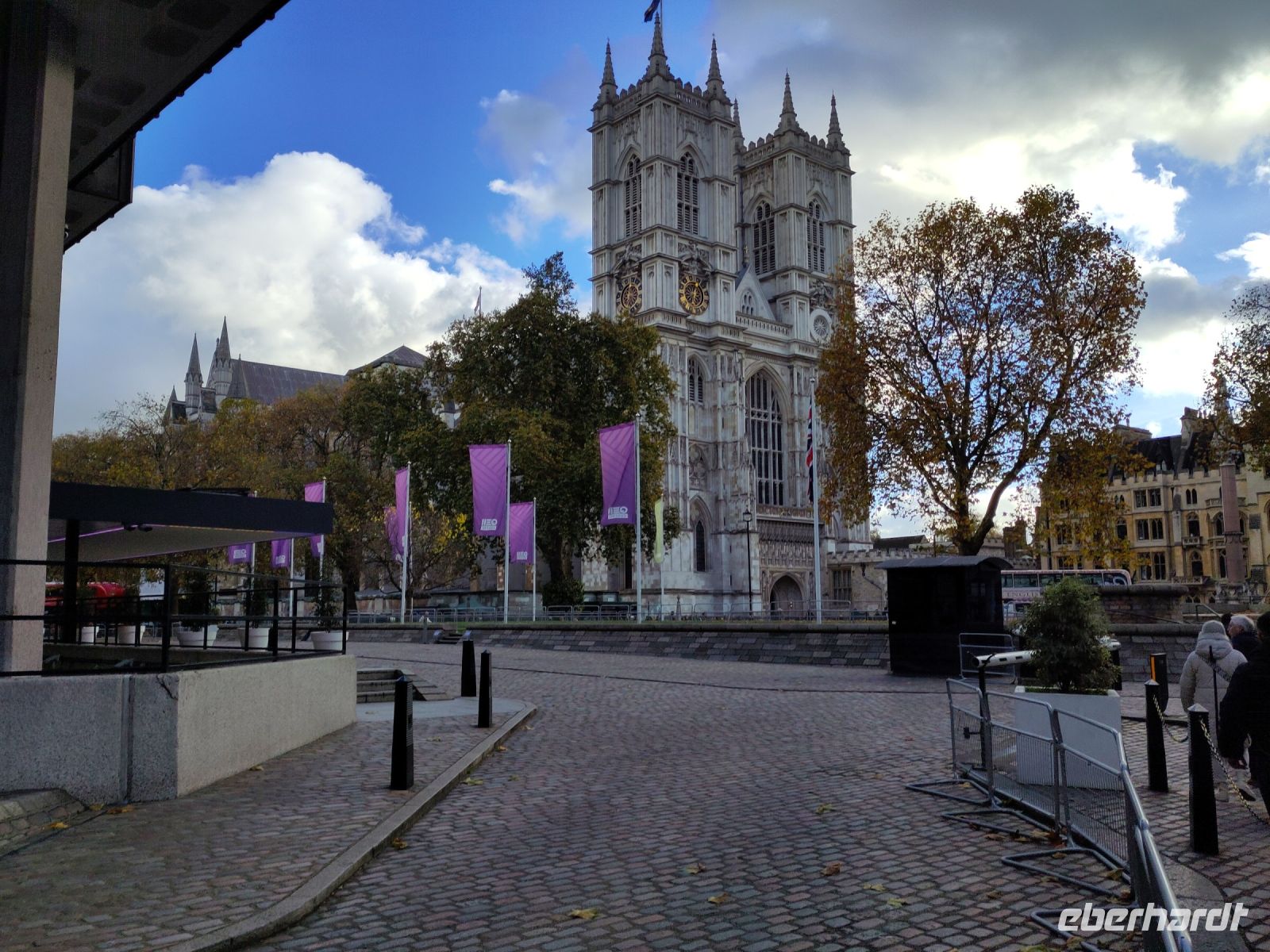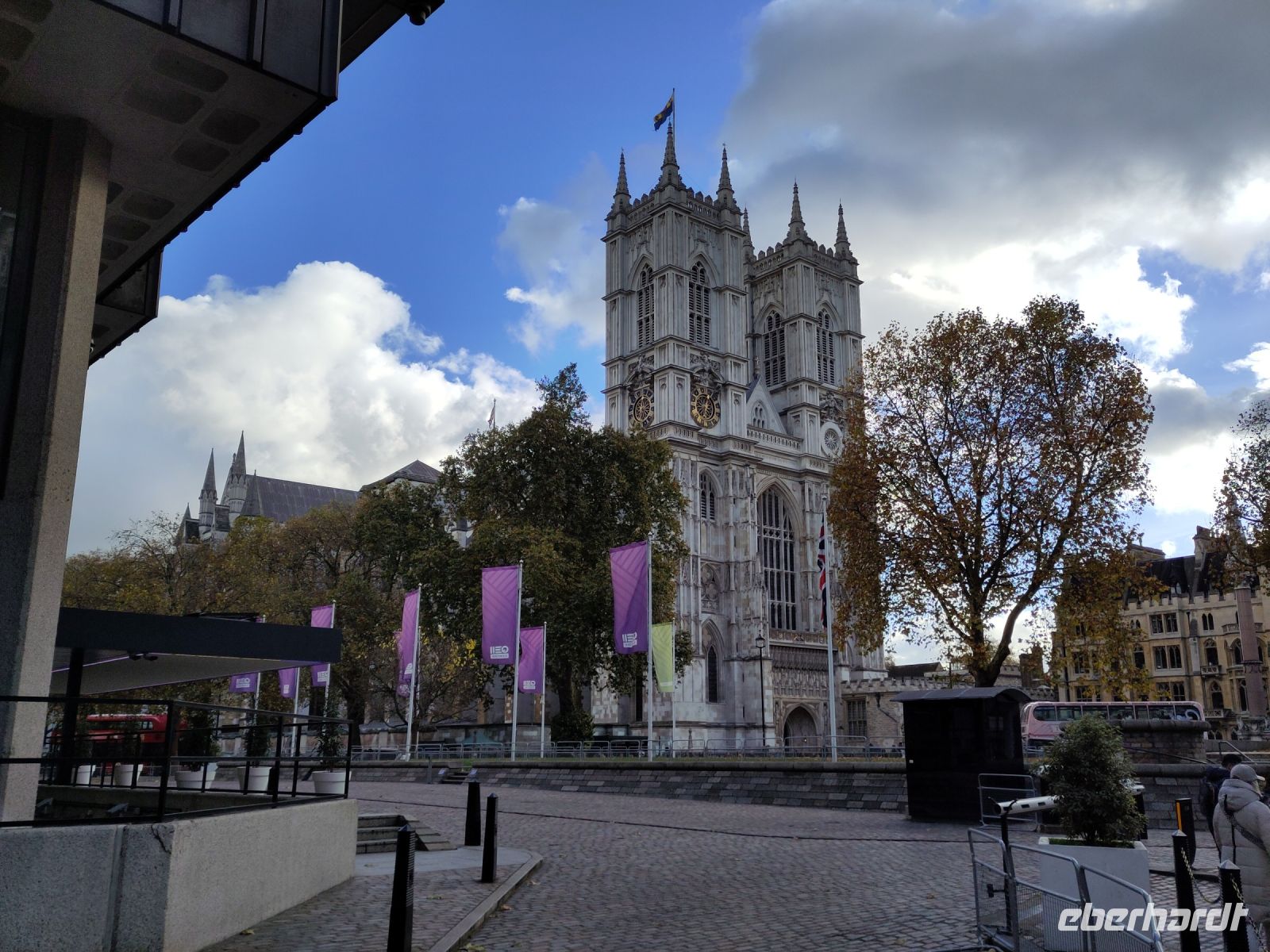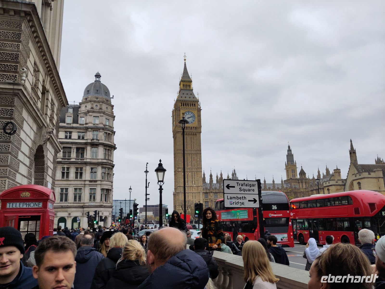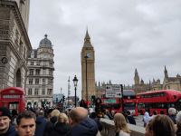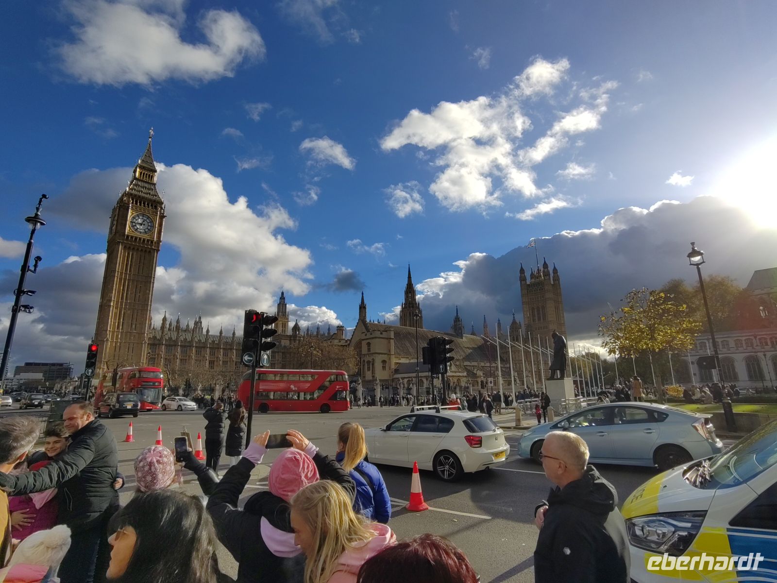 Zwischen 10:00 und 12:00 standen wir also am Buckingham Palace herum und beobachteten das Treiben. Einige aber meldeten sich da schon ab. Sie wollten auf eigene Faust London erkunden und dann später zu Madame Tussauds. Mit dem Rest der Truppe ging es an einem schottischen Dudelsackspieler vorbei, den wir zuvor schon in der U-Bahn gesehen hatten. Hier entspann sich zunächst die klassische Frage, was er "drunter" habe, die aber schnell dahin überging, ob seine Knie zu sehen seien. Die Damen schauten genauer hin und sahen, dass die Kniestrümpfe bis ans Knie reichten, der Kilt aber (der Tartan - das 'Schottenmuster' - hatte die Grundfarbe rot) endete über den Knien, diese waren frei. Wir liefen zunächst zu Westminster Abbey, eine Kirche, die schon viele Hochzeiten und Beerdigungen gesehen hat, dann vorbei an den Statuen ehemaliger Premierminister (vor allem des 19. Jhdts.) ergänzt durch die von Nelson Mandela, Mahatma Ghandi und der bürgerlichen Suffragette Millicent Garrett Fawcett an der meistfotografierten Telefonzelle Londons vorbei - wo sich täglich Schlangen bilden, weil Instagrammer hier ihre Londonfotos machen müssen, hinein in die U-Bahn. Natürlich haben wir die Houses of Parliament mit ihren beiden Türmen (Victoria und Elizabeth Tower) noch einmal gesehen. Klar, die meistfotografierte Telefonzelle Londons ist nicht umsonst die meistfotografierte Telefonzelle: im Hintegrund ist der Elizabeth Tower ("Big Ben", was eigentlich nur die Glocke im Inneren ist) zu sehen.