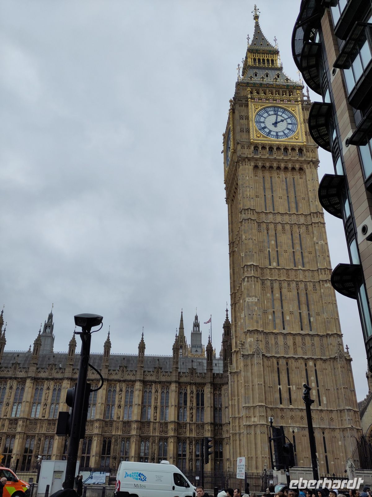 Gemeinsam fuhren wir alle zum Bahnhof Charing Cross, liefen von dort über St-Martin-in-the-Fields zum Trafalgar Square, wo Londons Verkehr stand. Whiehall runter ging es an den Horsguards vorbei und dann Richtung Themse zu New Scotland Yard, wo wir etwas früh ankamen, was wir diejenigen, die Lust hatten, nutzten noch weiter bis zu den Houses of Parliament zu gehen und den Big B... ähem den Elizabeth Tower zu fotografieren - Big Ben ist bloß die berühmte Glocke, deren Klang wir alle kennen und die im Elizabeth Tower hängt.
