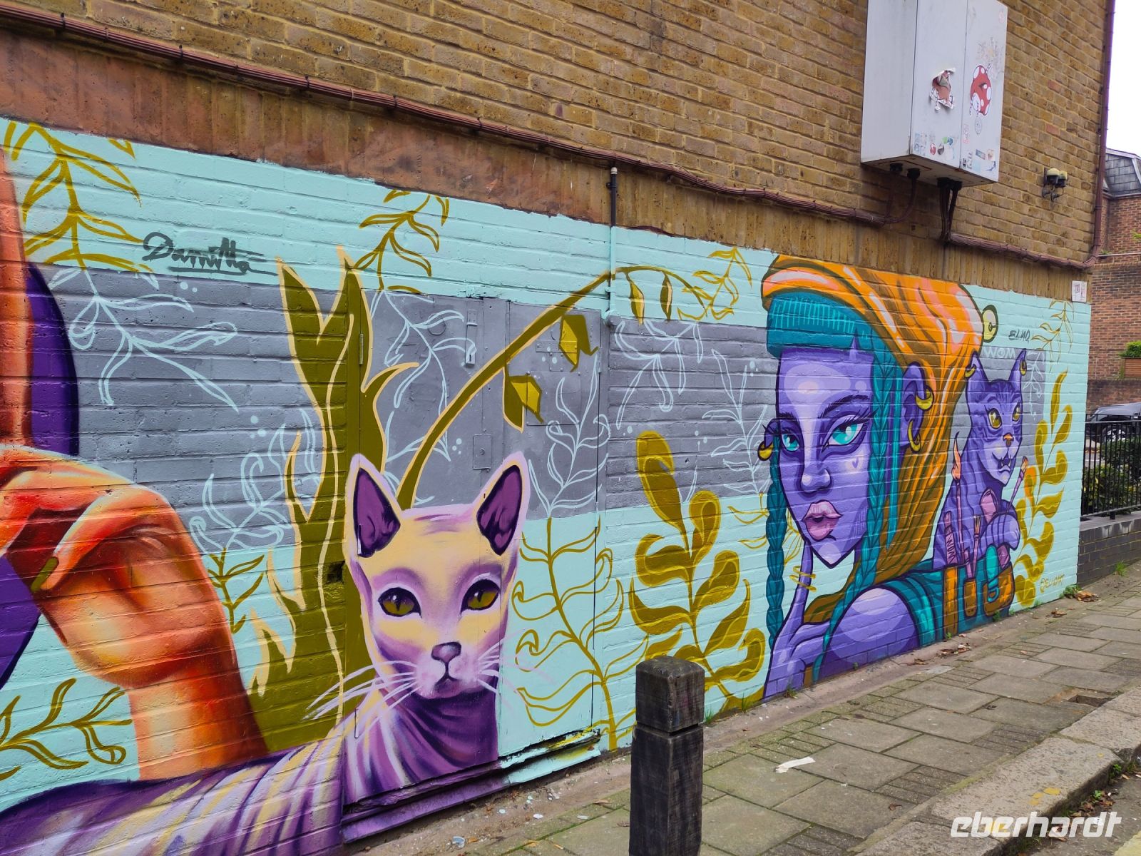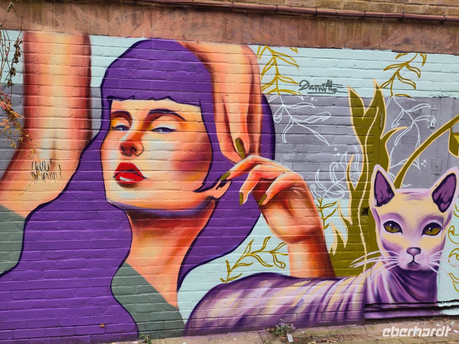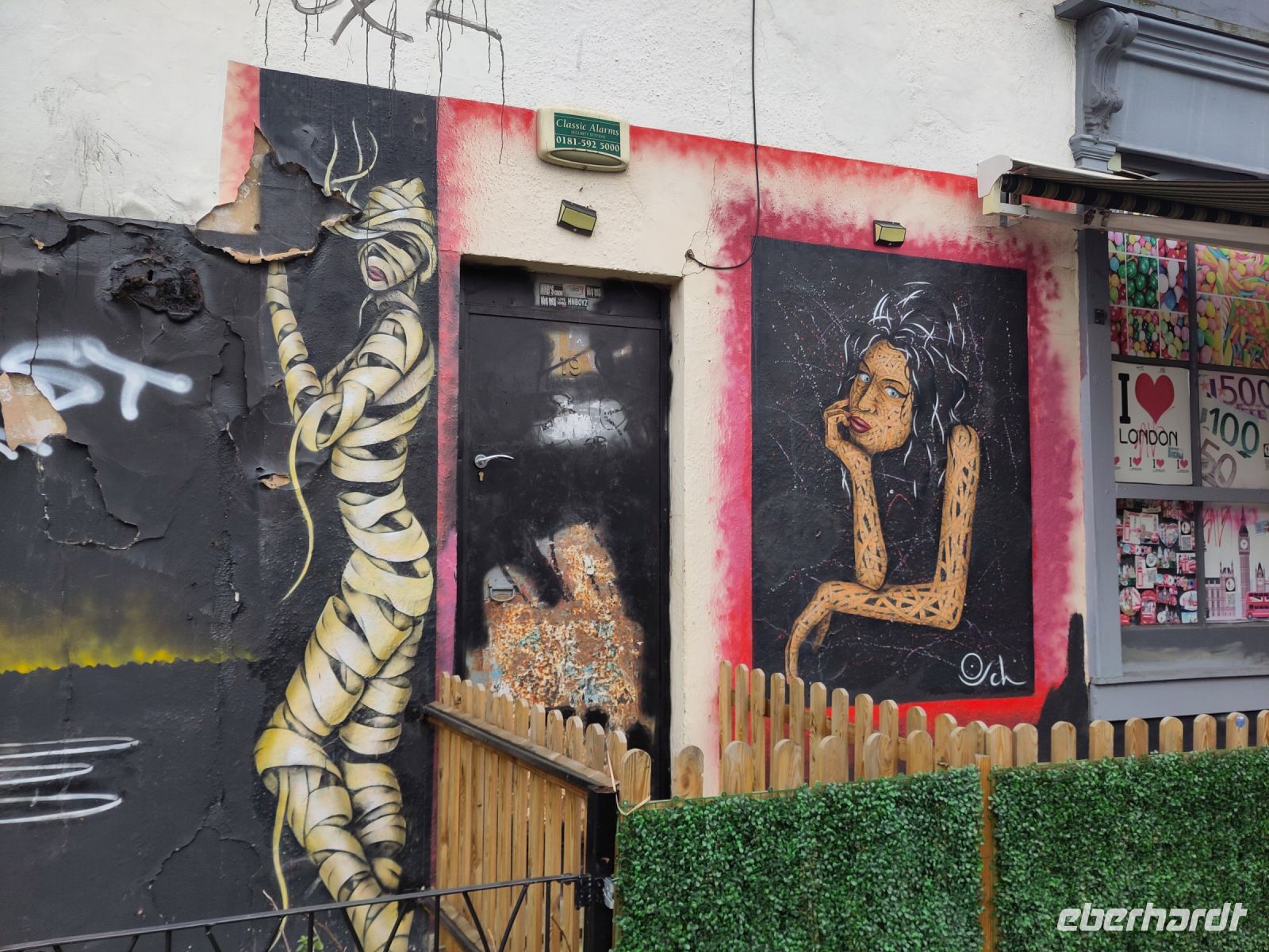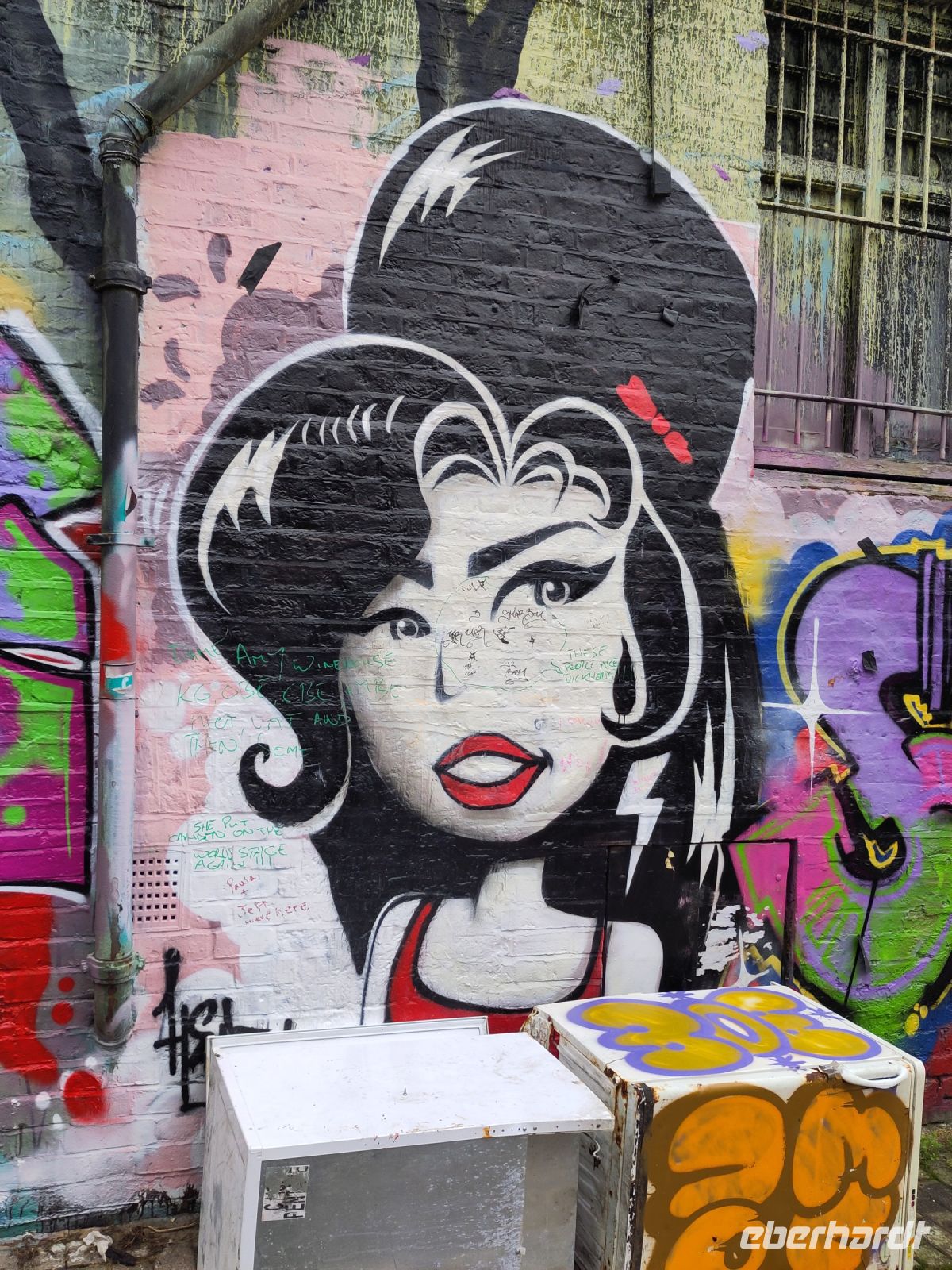 Gemeinsam ging es, nachdem die frisch aufgeladenen Oyster Cards verteilt waren, nach Camden Town, zum Camden Lock Market, wo wir zunächst ganz kurz auf den Spuren von James Bond (Daniel Craig in Spector) wandelten, bevor es dann für die Interessierten zu Amy Winehouse ging, wir machten Station an zwei Graffiti, welche sie darstellen und schließlich bei der Figur von ihr im Camden Lock Market, die (später) Diskussionen auslöste, ob sie wirklich so groß, respektive so klein gewesen sei.